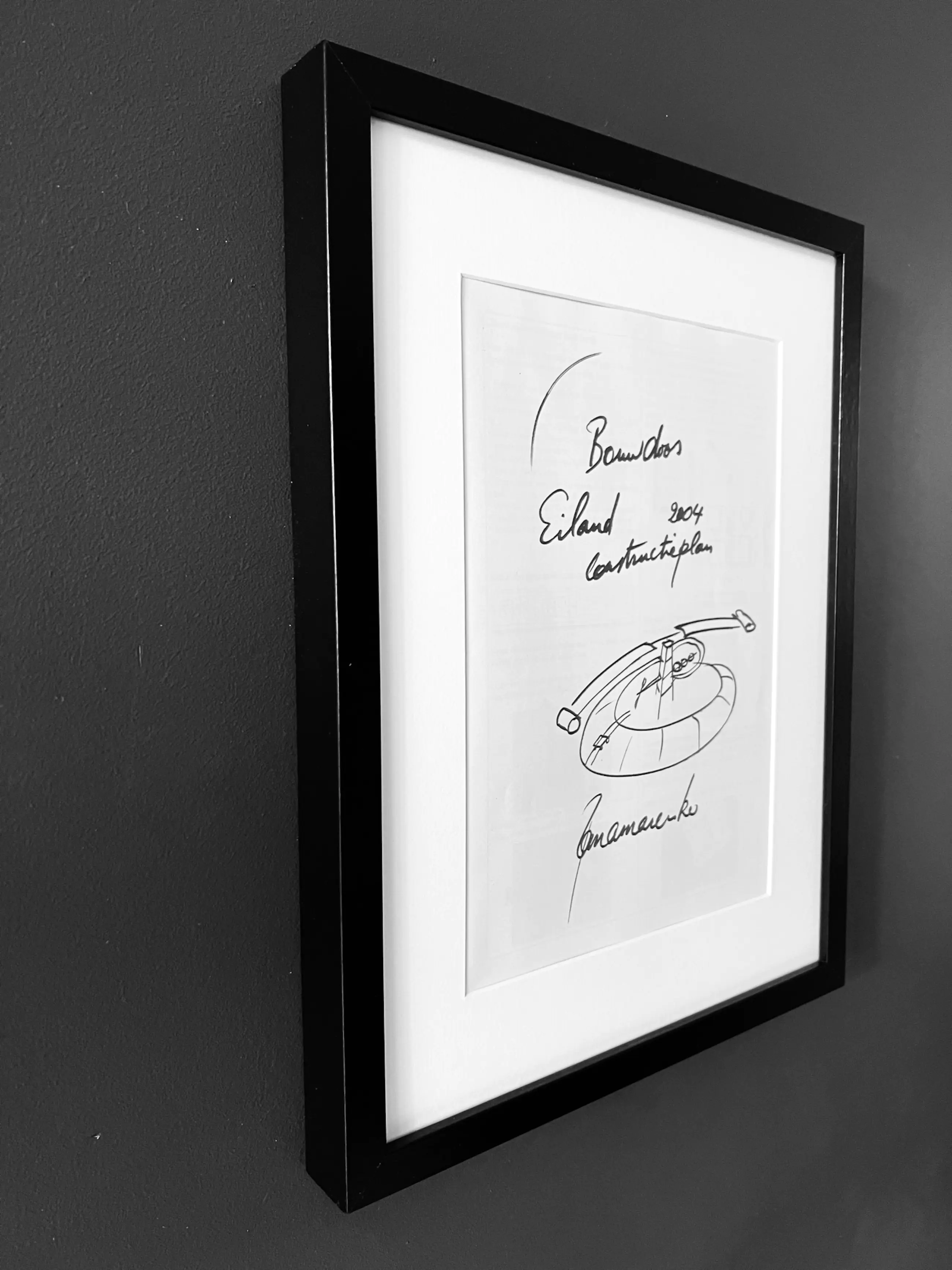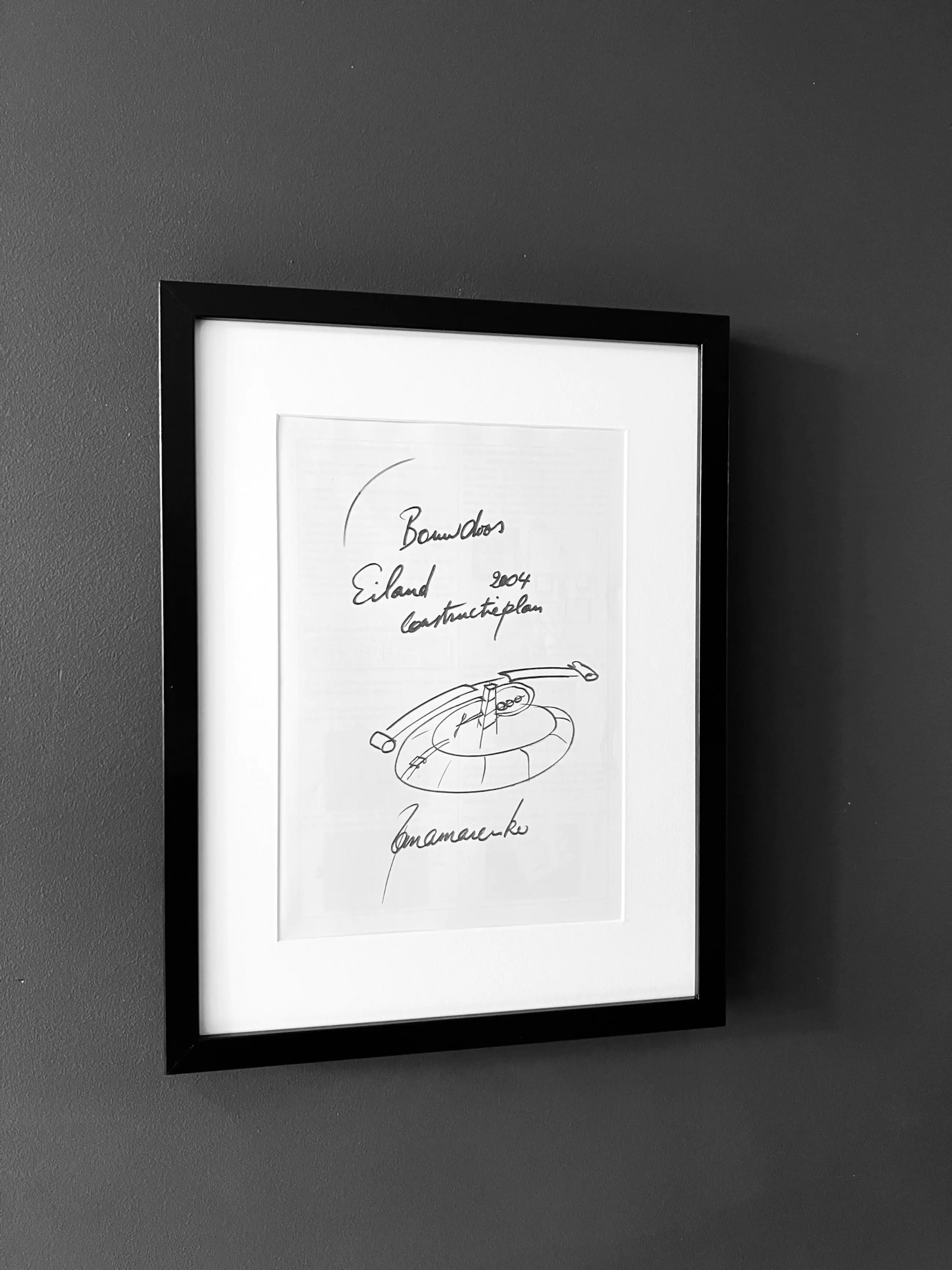 originele uitgifte van Panamarenko 's constructieplan vliegend eiland . Toont de volledige samenstelling en bouwwijze van het eiland multiple uitgegeven in beperkte oplage door het vlaams parlement. Gesigneerd in de druk op de voorzijde en de achterzijde.