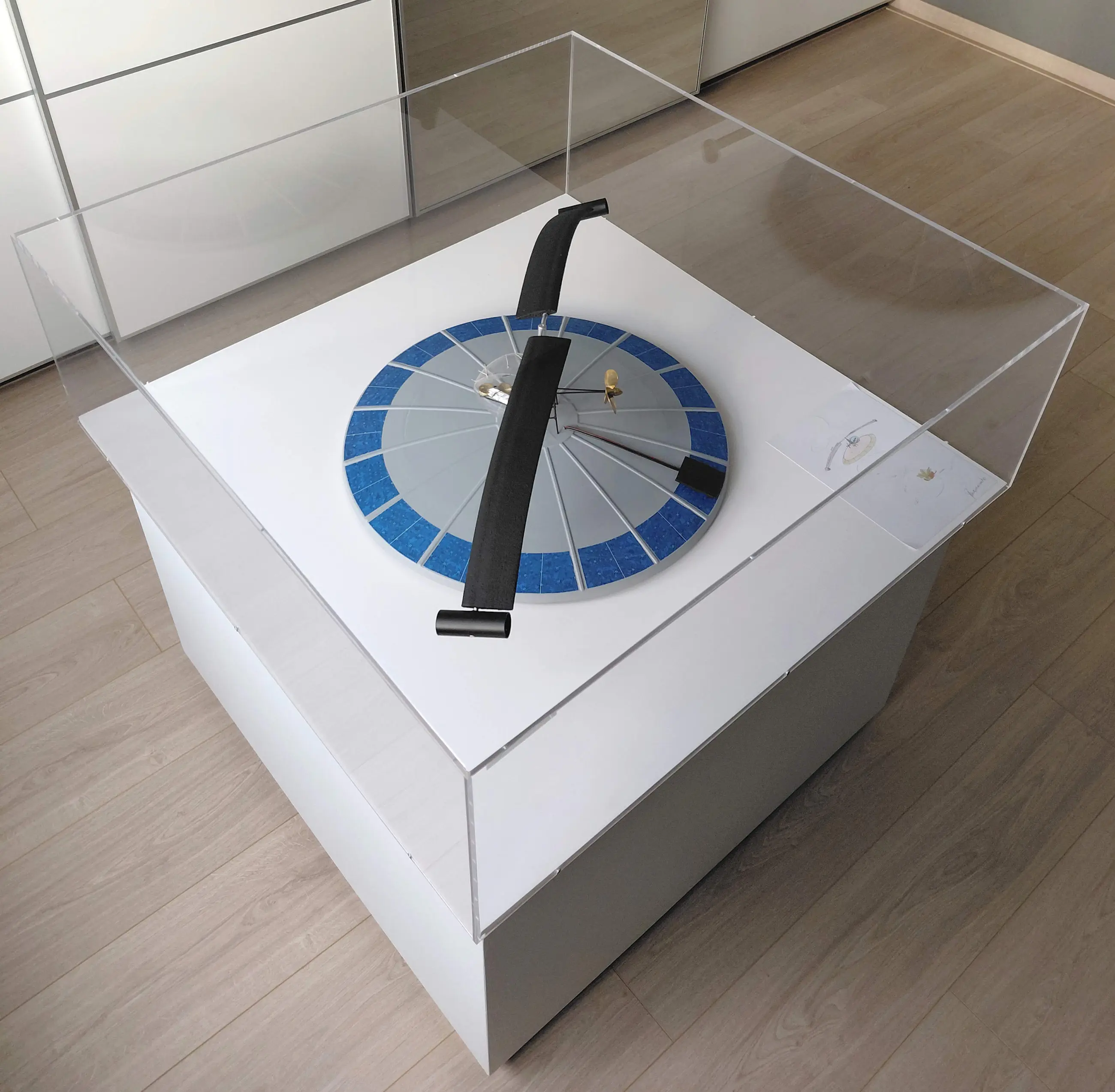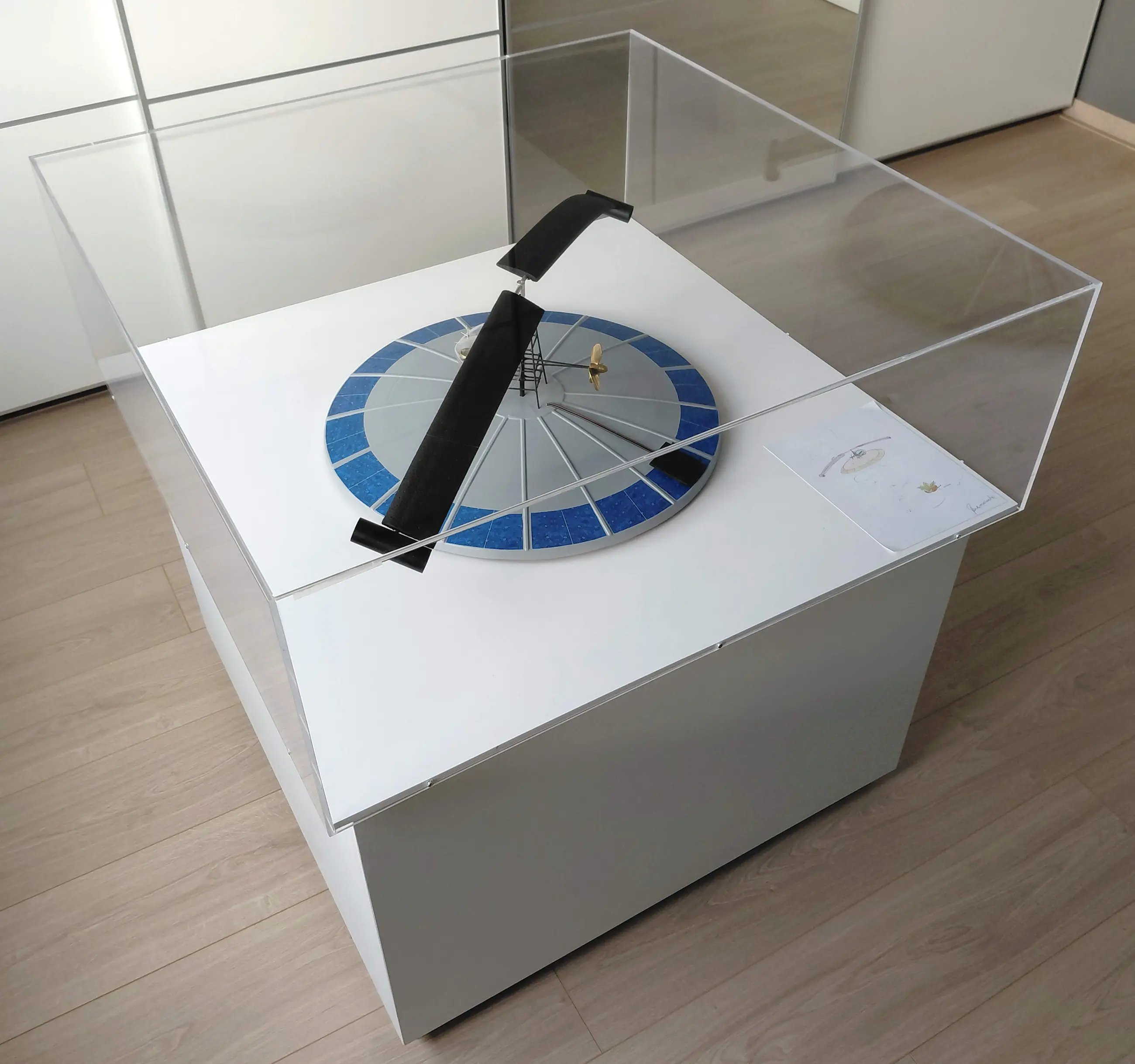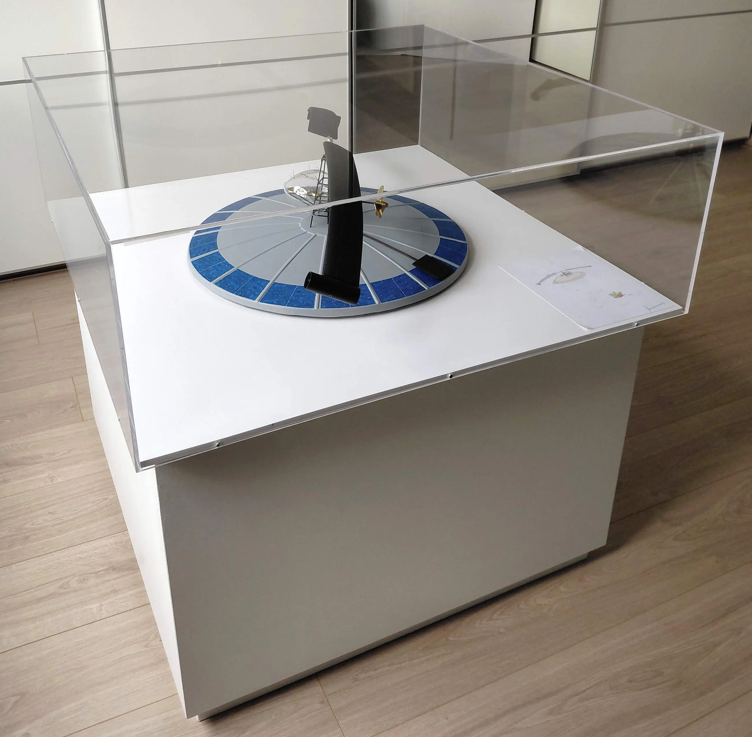 Het geheel van plexibox met onderplaat staat vervolgens weer los op een witte houten sokkel. Het bovenste gedeelte (incl. het vliegende eiland) kan dus eventueel aan de muur gemonteerd worden.