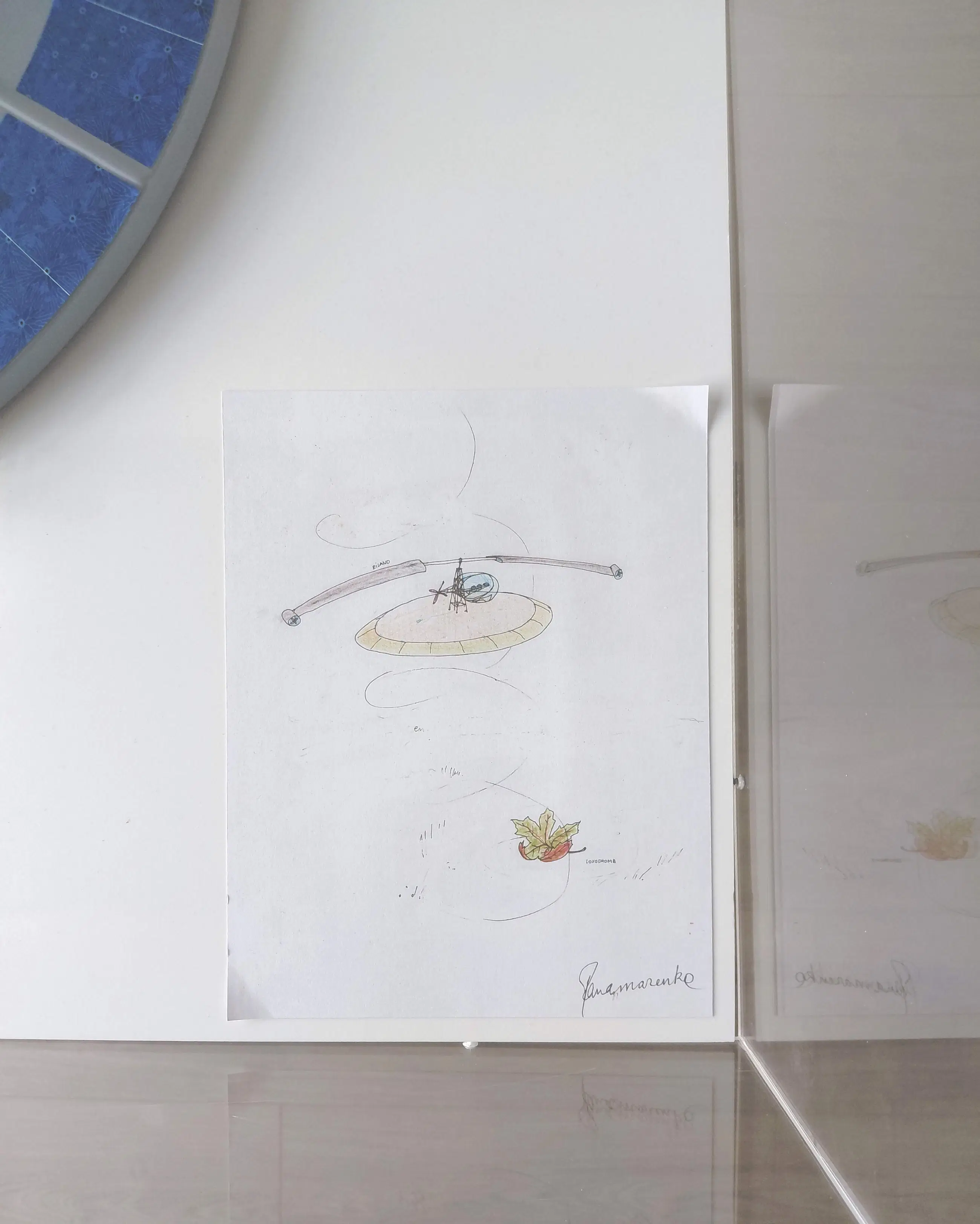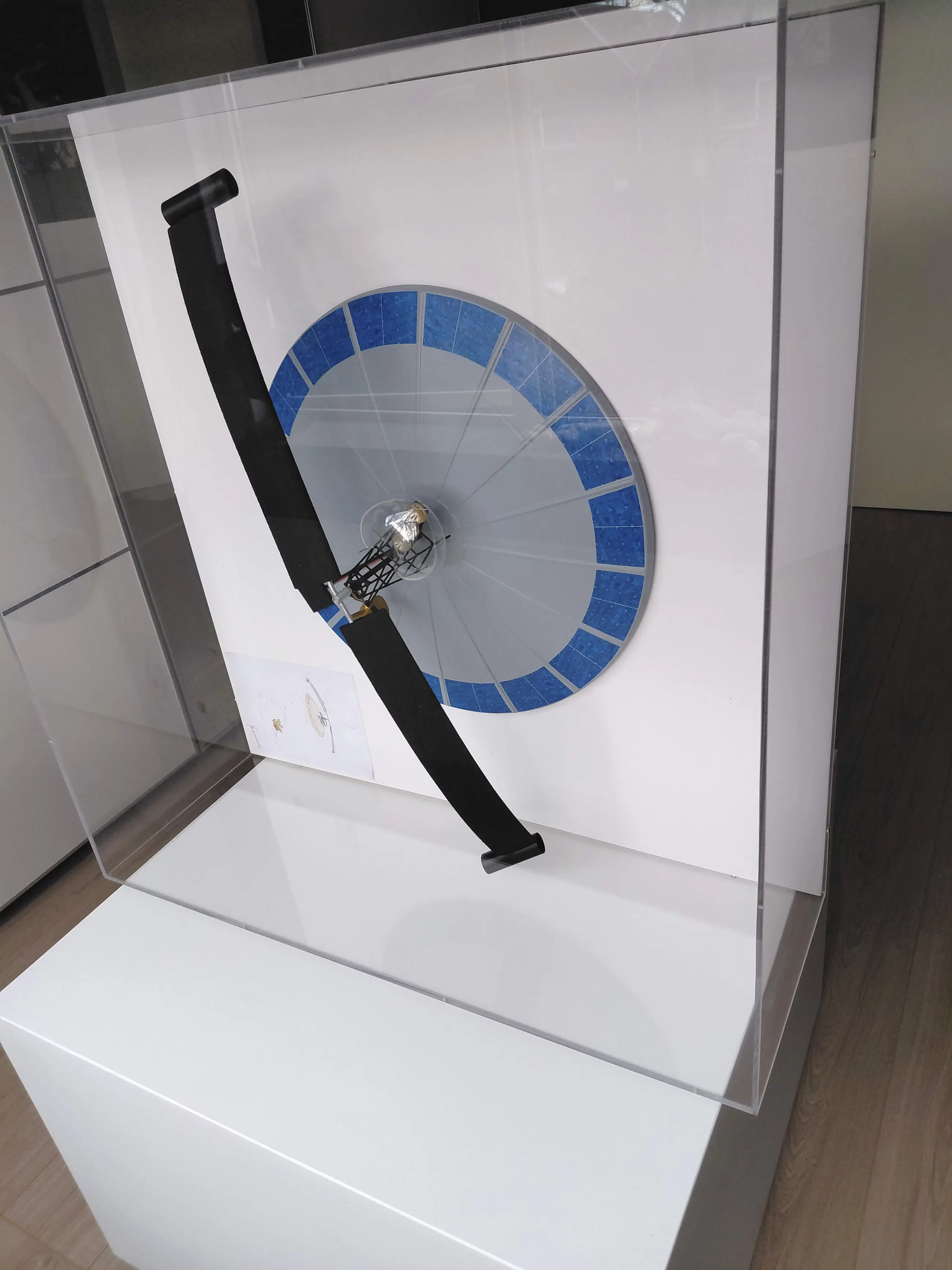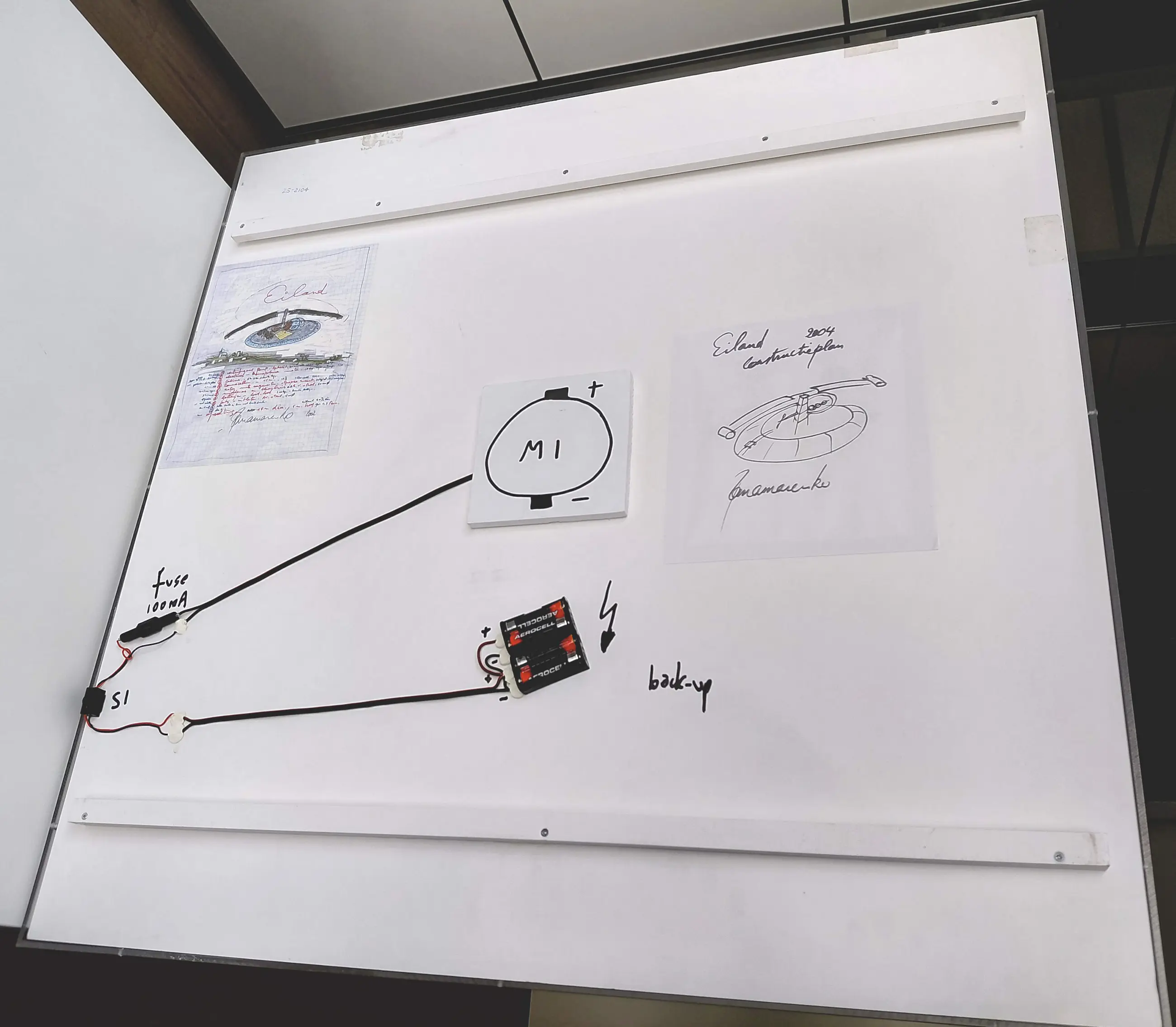 Het geheel van plexibox met onderplaat staat vervolgens weer los op een witte houten sokkel. Het bovenste gedeelte (incl. het vliegende eiland) kan dus eventueel aan de muur gemonteerd worden.