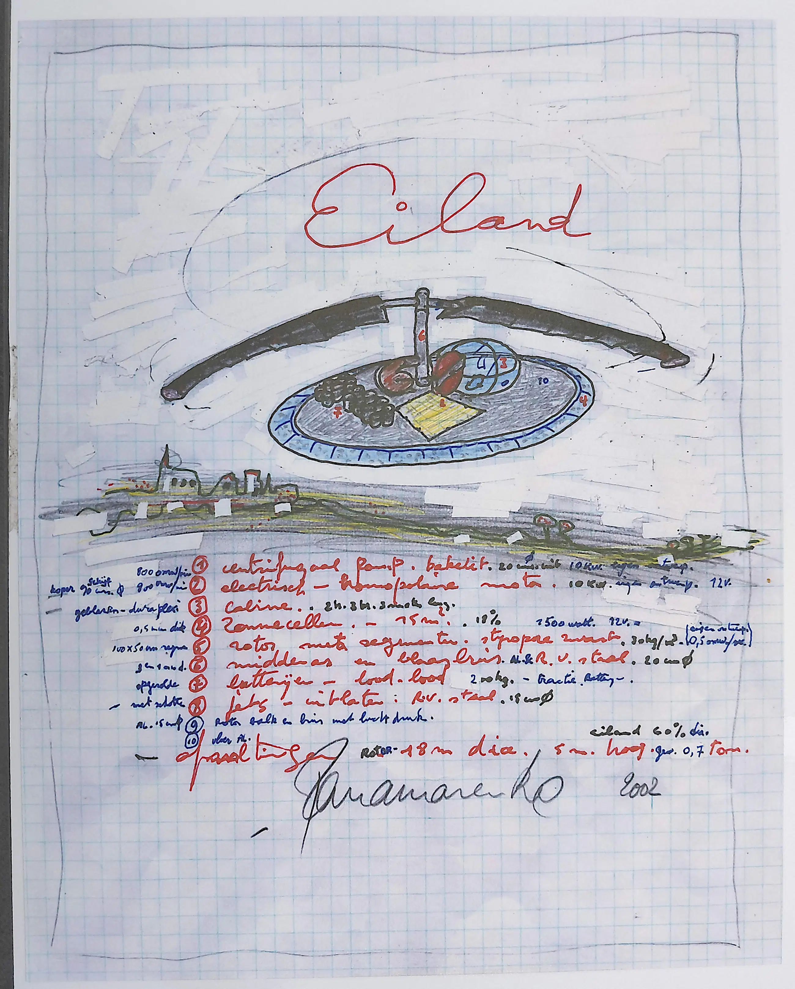 Karakteristiek, bekend object van Panamarenko, uitgegeven in samenwerking met het Vlaams Parlement in 2003 in een oplage van 284 stuks. Object samengesteld van verschillende materialen (metaal, plastic, rubber) vast gemonteerd op een houten onderplaat en het geheel in zeer mooie plexibox.