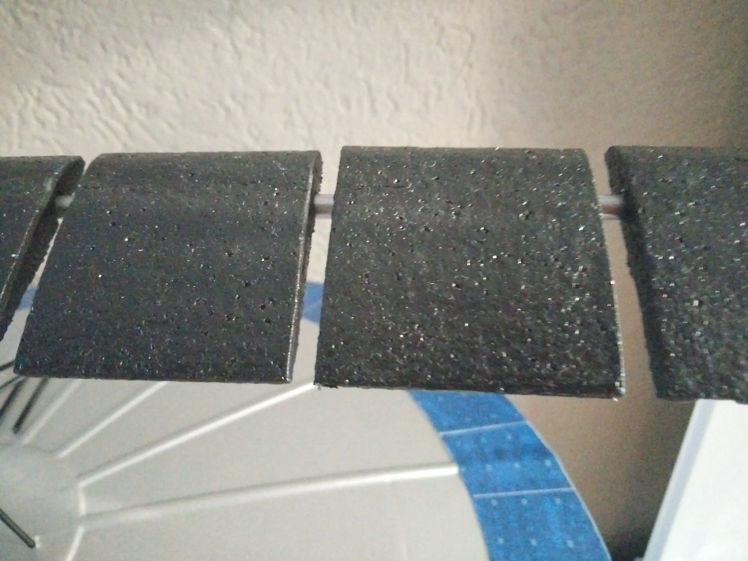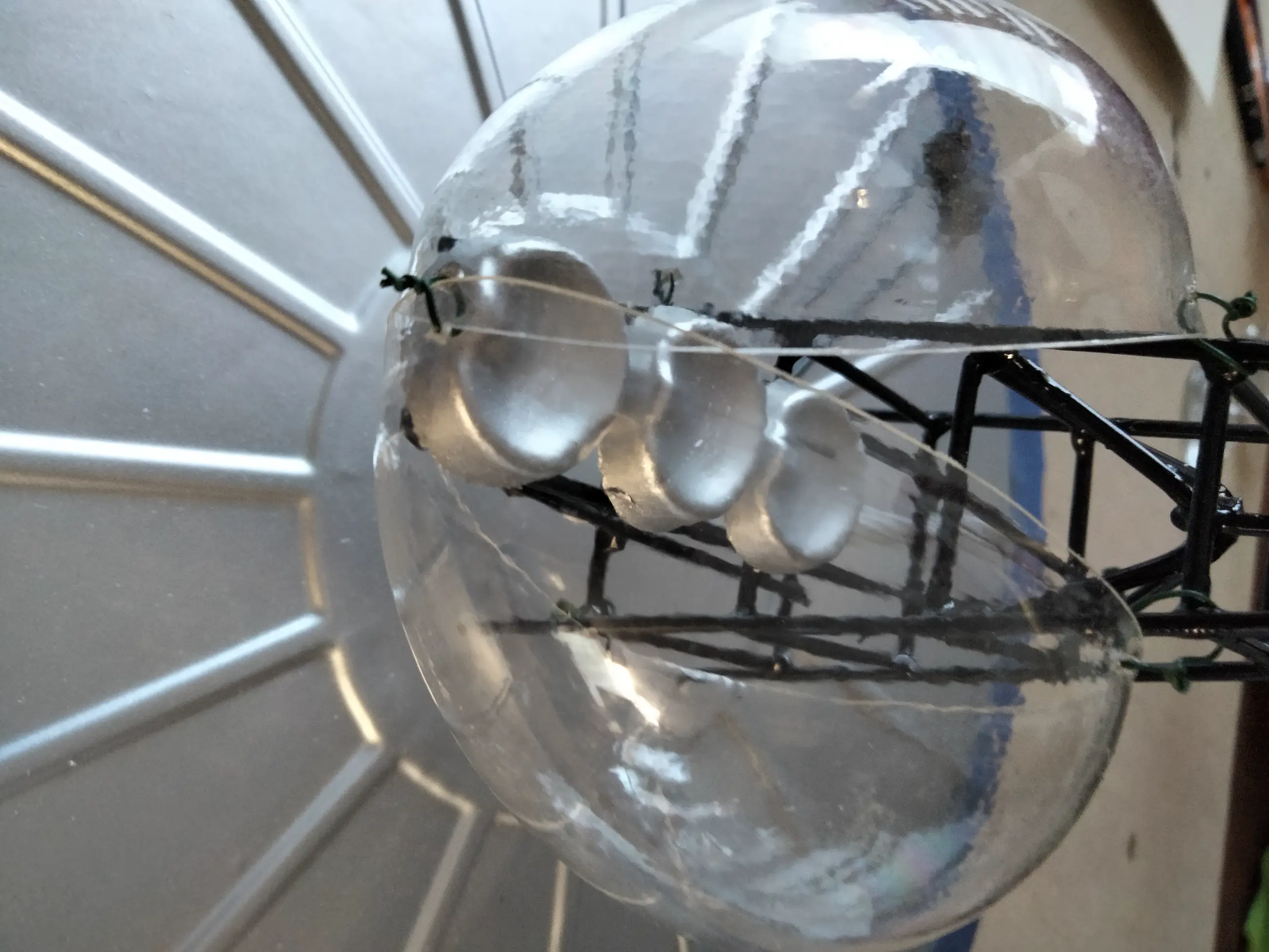 Aan de onderkant zijn op het balsahout 2 stalen plaatjes gemonteerd [zie foto] Mocht het werk opgehangen worden of in een plexiglas box gemonteerd worden kan dit met behulp van magneten. De magneten worden bijgeleverd.