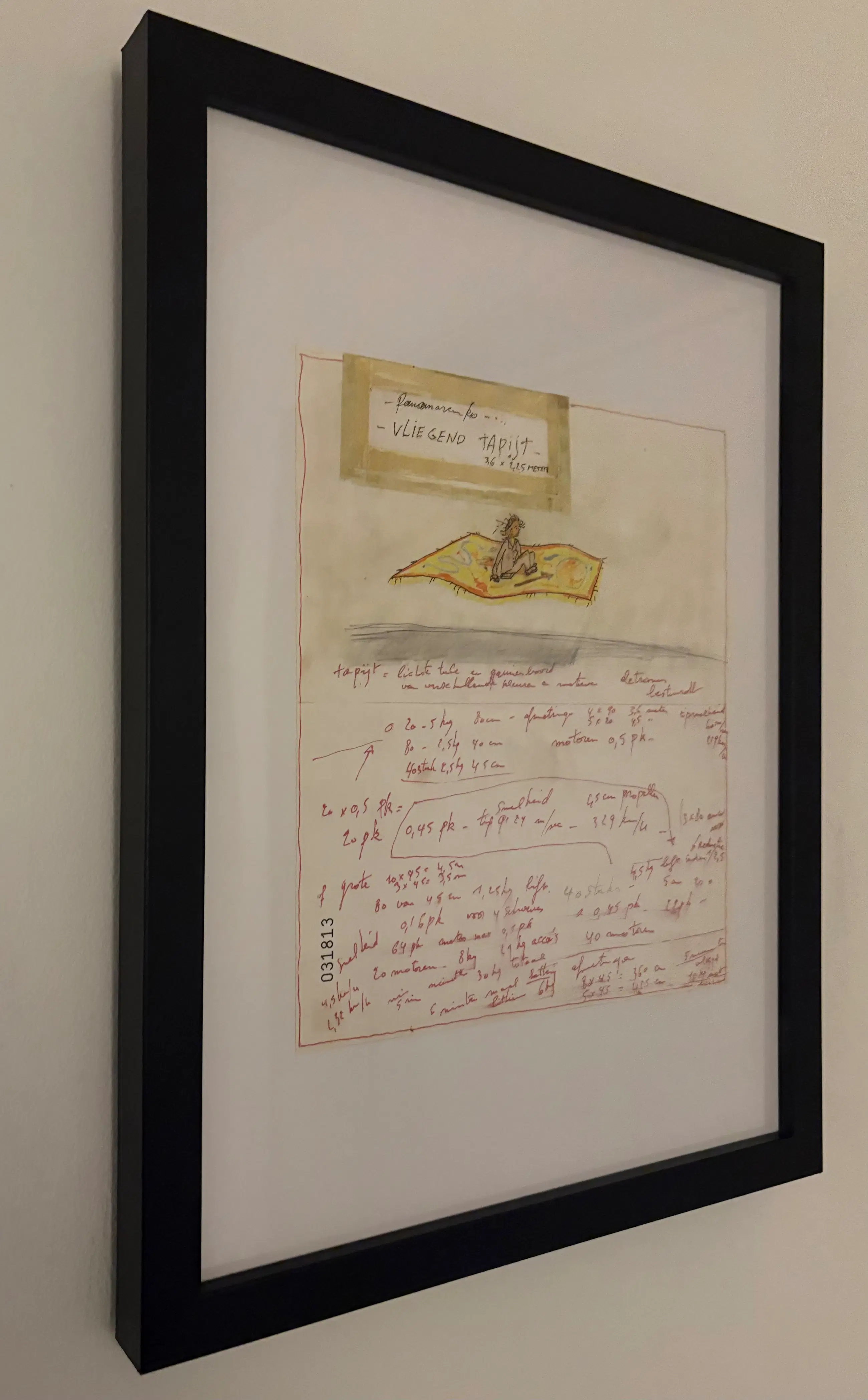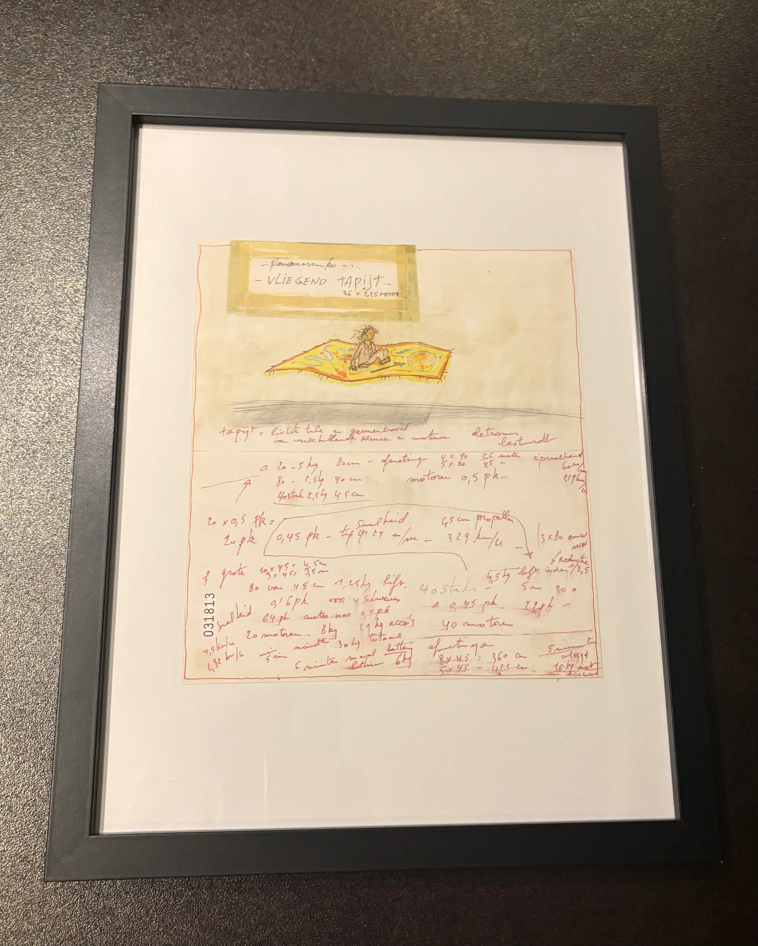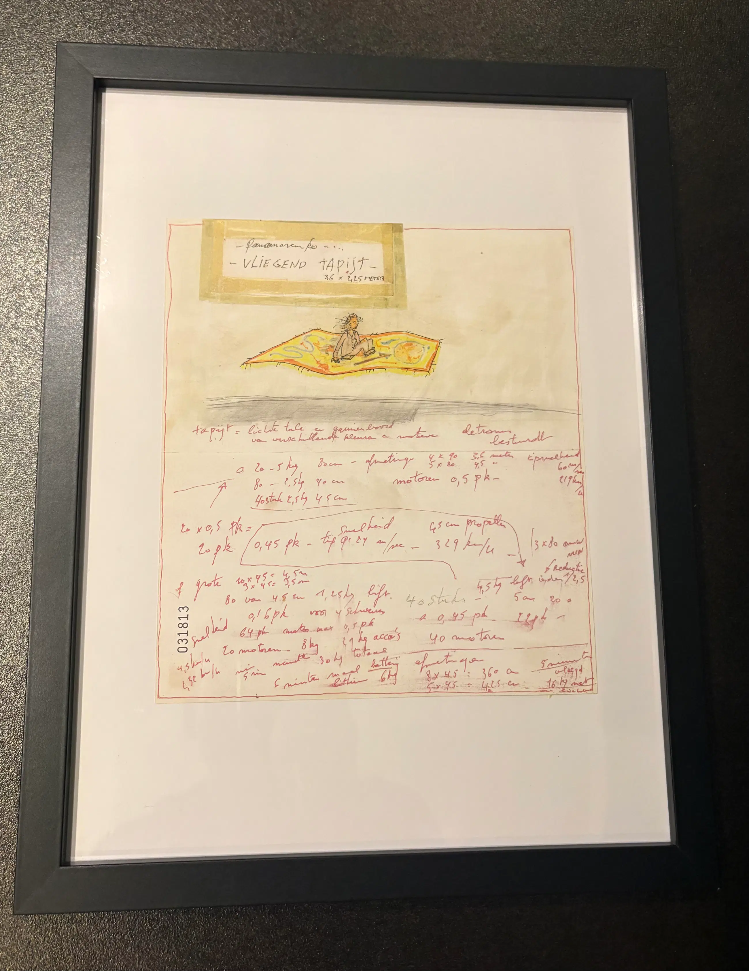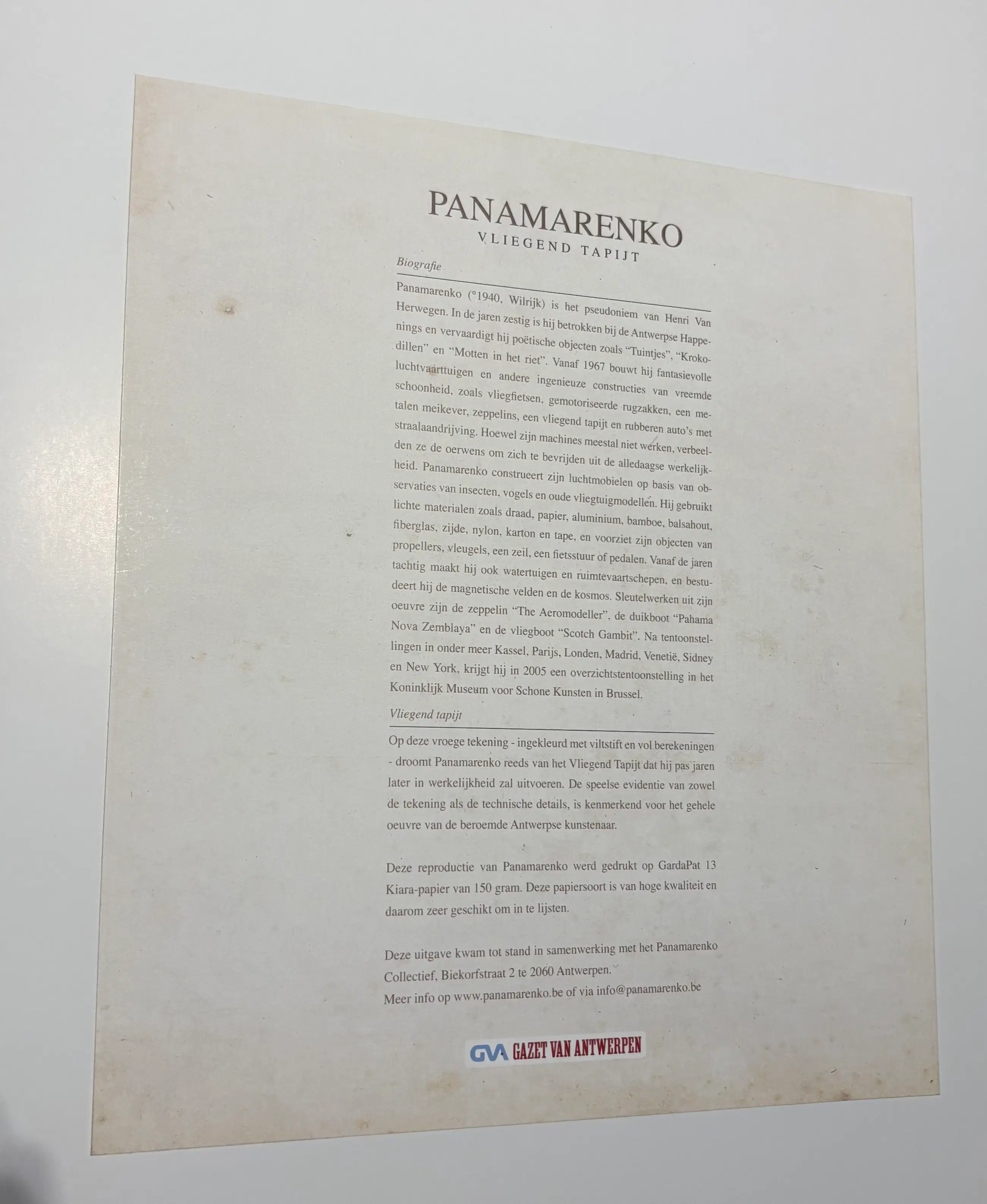 Offset prent van Panamarenko gedrukt op GardaPat 13 Kiara-papier van 150 gram van hoge kwaliteit. Titel: Vliegend tapijt Deze beperkte machinaal genummerde oplage werd in 2008 aangeboden door Gazet van Antwerpen en is in perfecte staat. Afmetingen: 24,5x21,5cm Ingeframed in kader 40x30cm