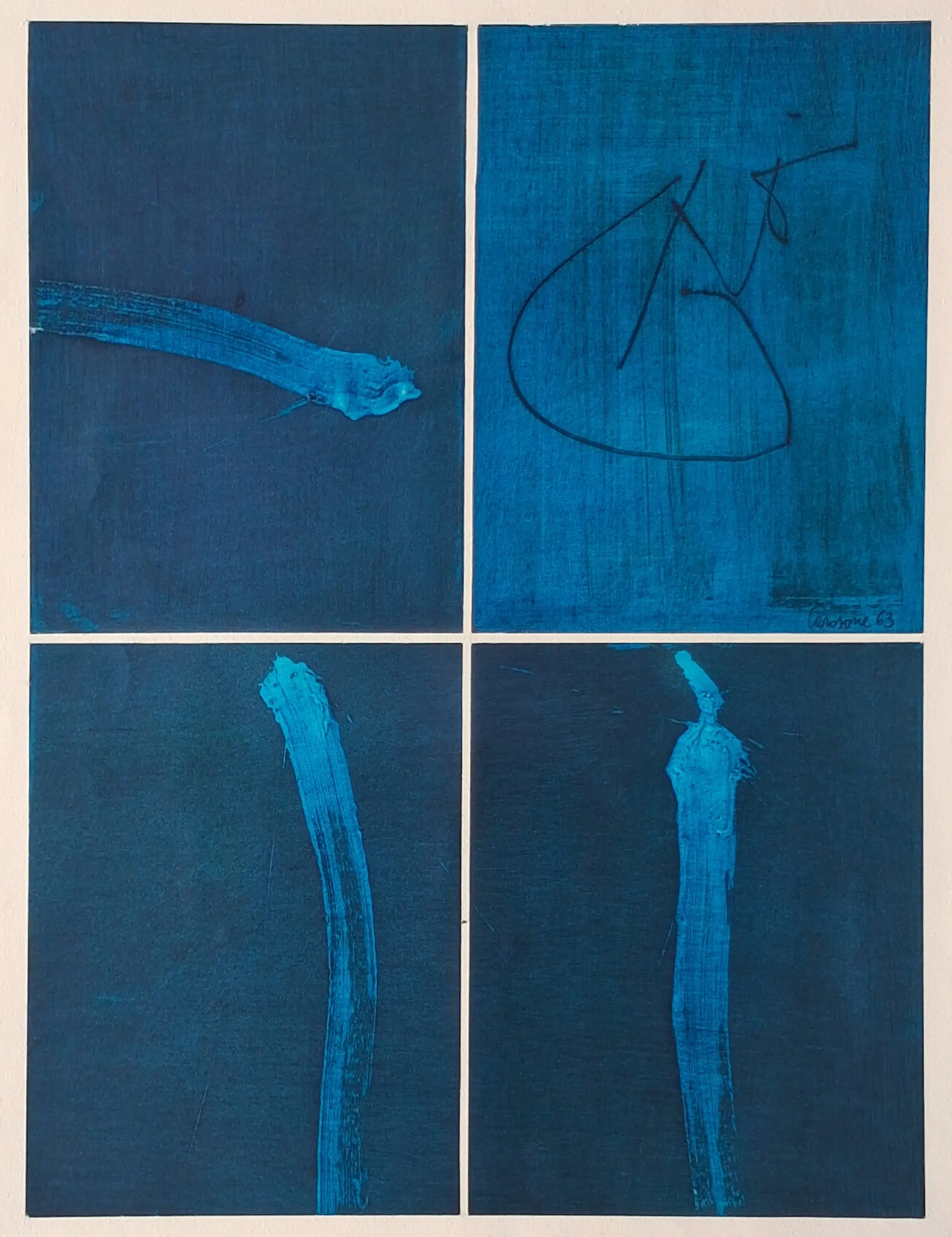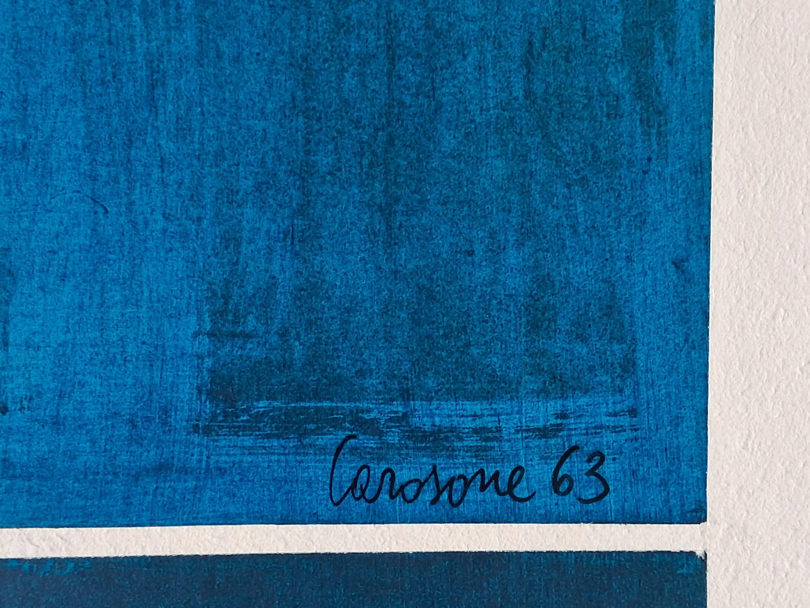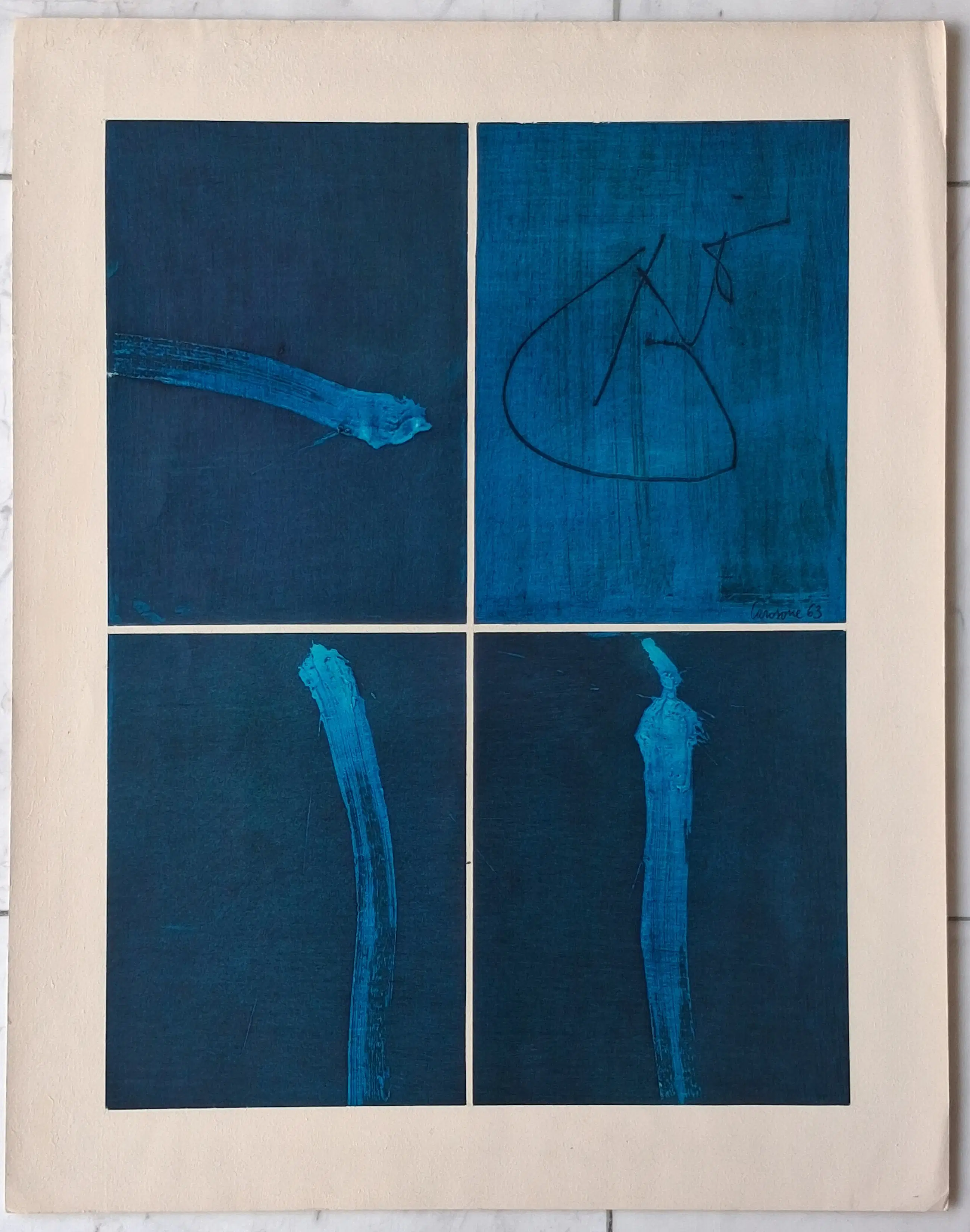 Abstracte compositie van Paolo Carosone. gemengde techniek op papier. Het werk is gesigneerd en gedateerd. De conditie van het beeld is uitstekend, het blad heeft een lichte kreuk in bladrand (zie foto).