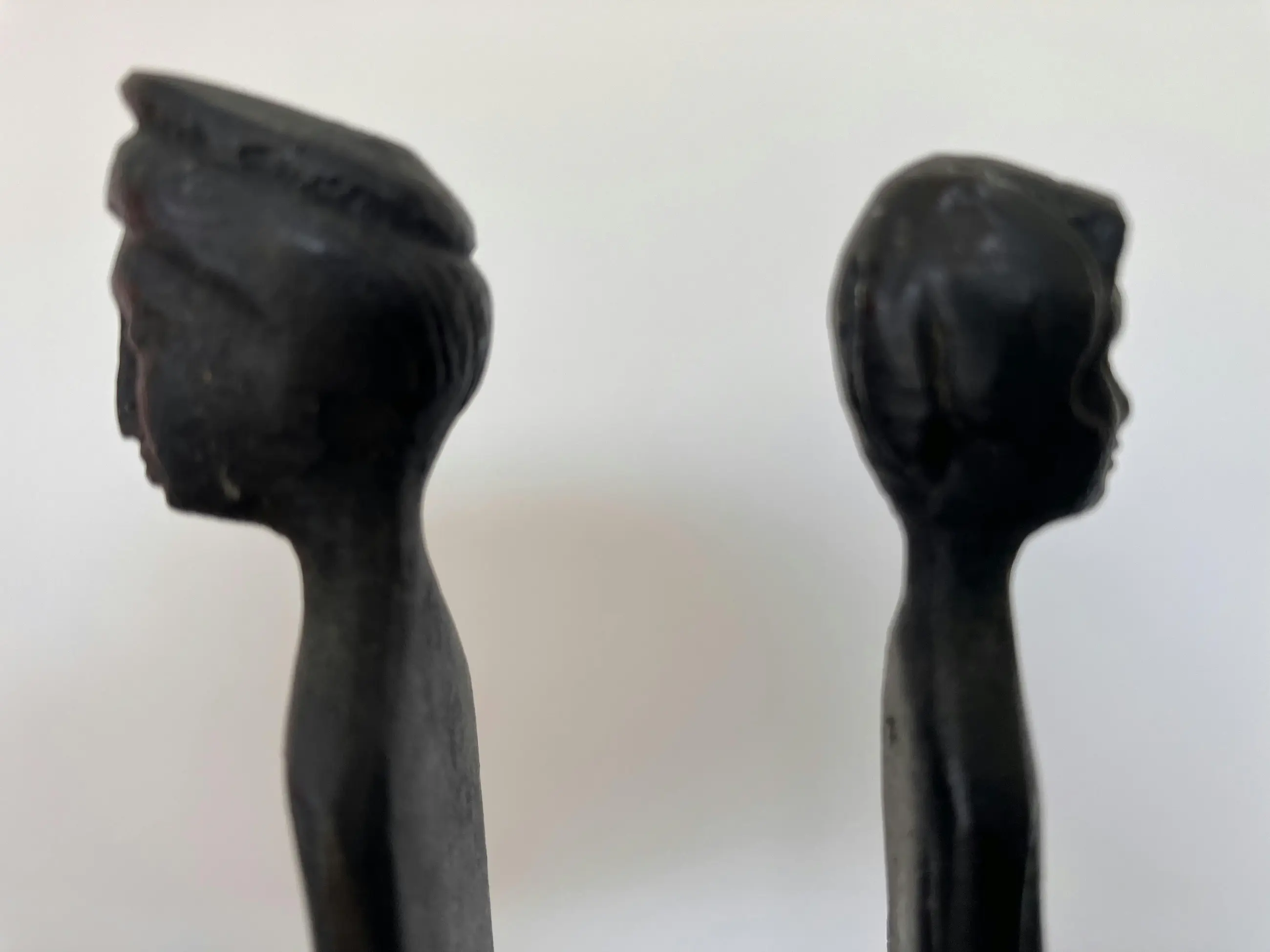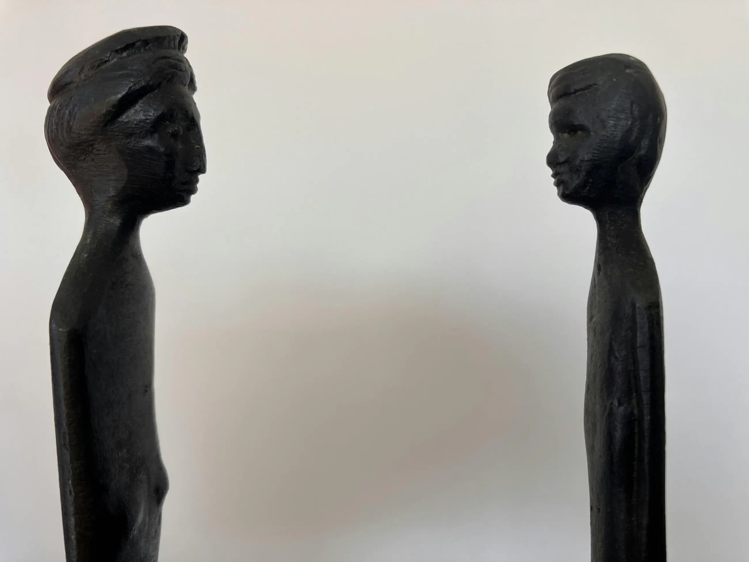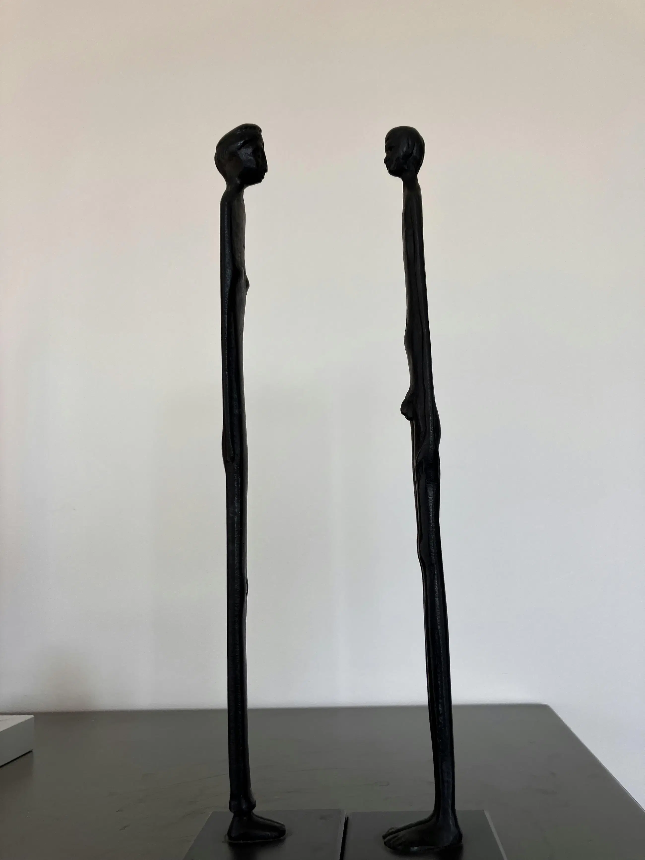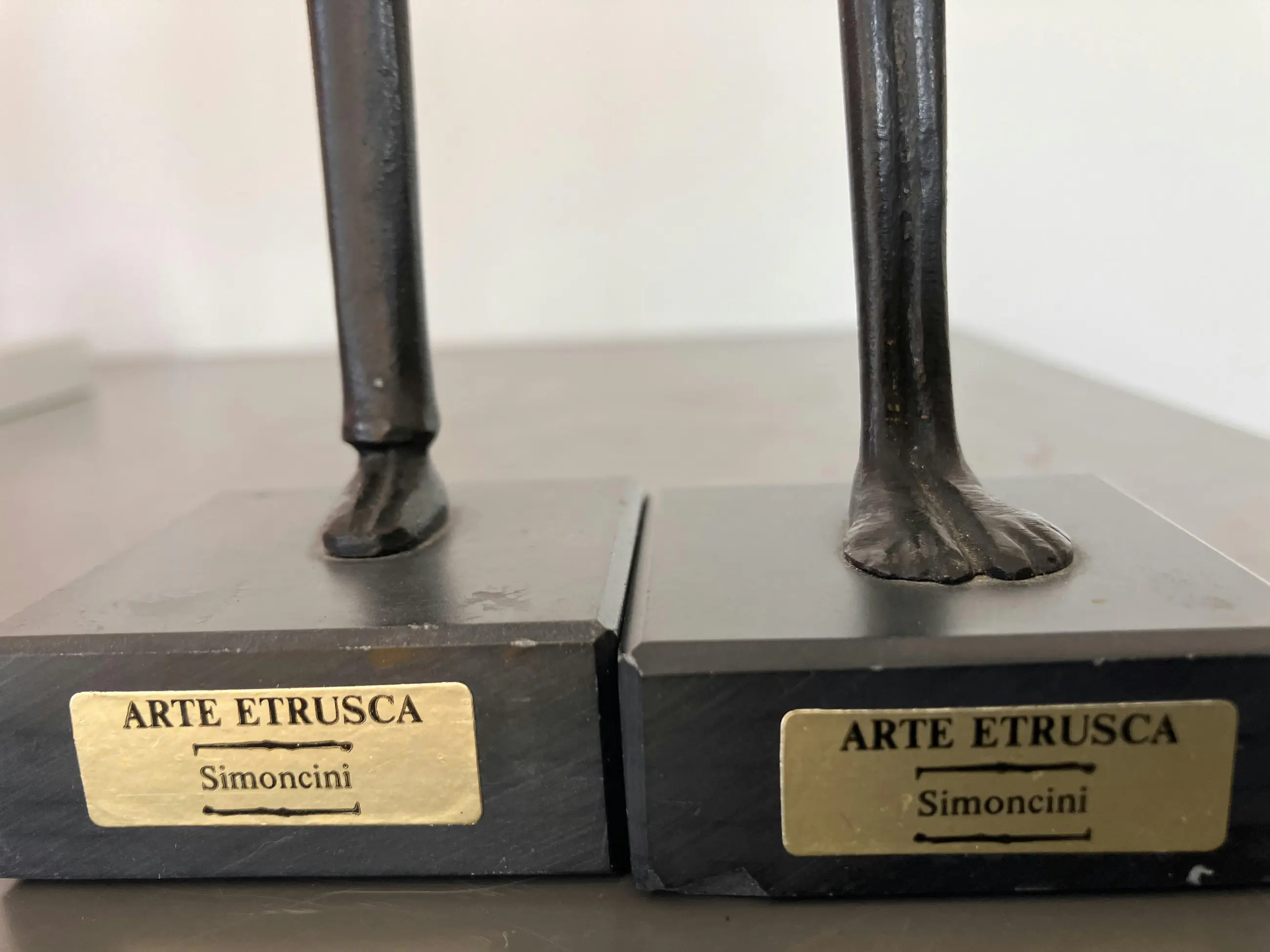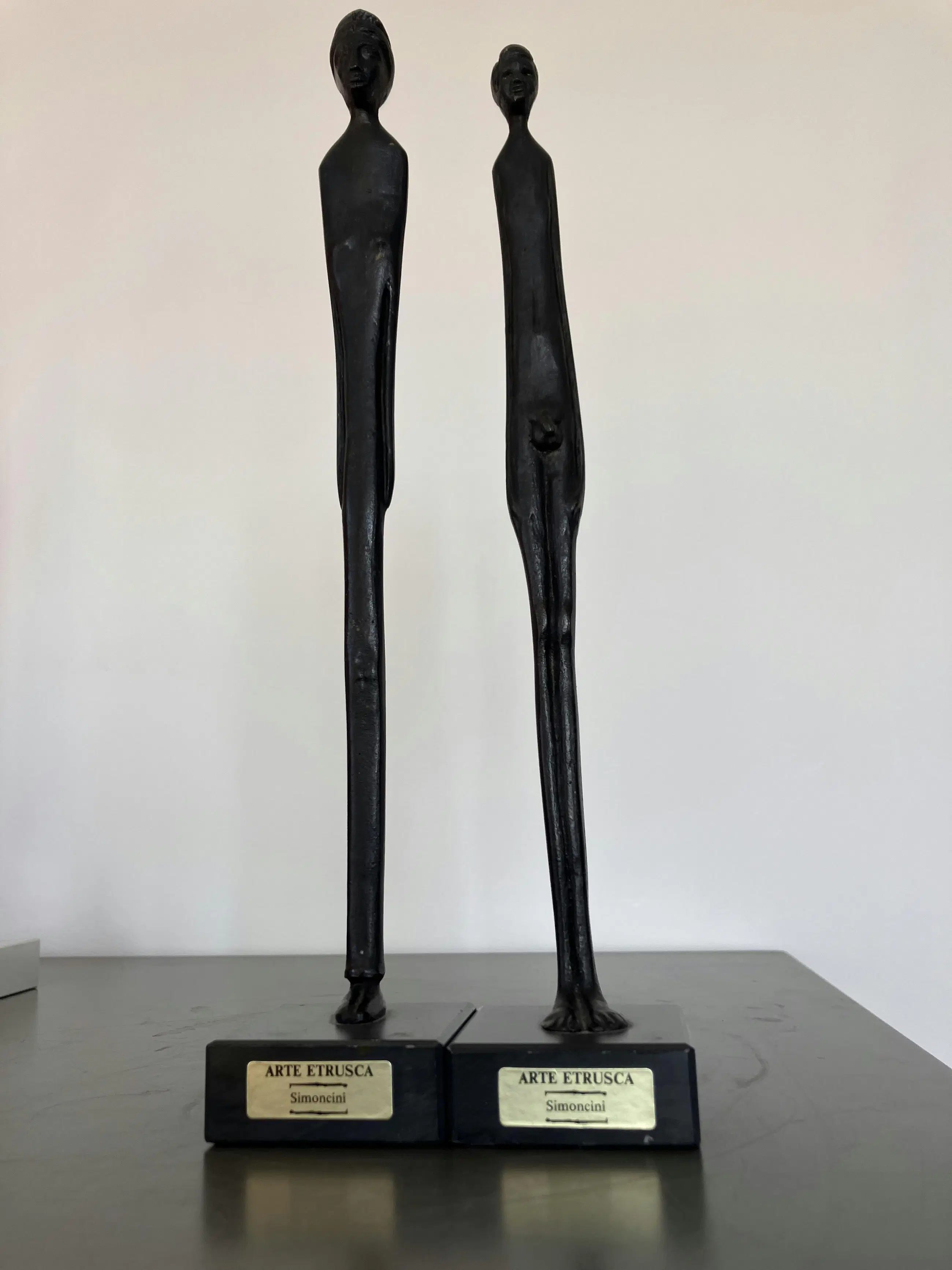 Prachtig bronzen beeldjes van man en vrouw op een zwarte natuurstenen voet (5x5cm). Het zijn replica van het Etruskische beelden uit musea en gemaakt door het familiebedrijf Simoncini in Volterra. Toscane, Italië. Zeer decoratief. Inspiratiebron voor Giacometti
