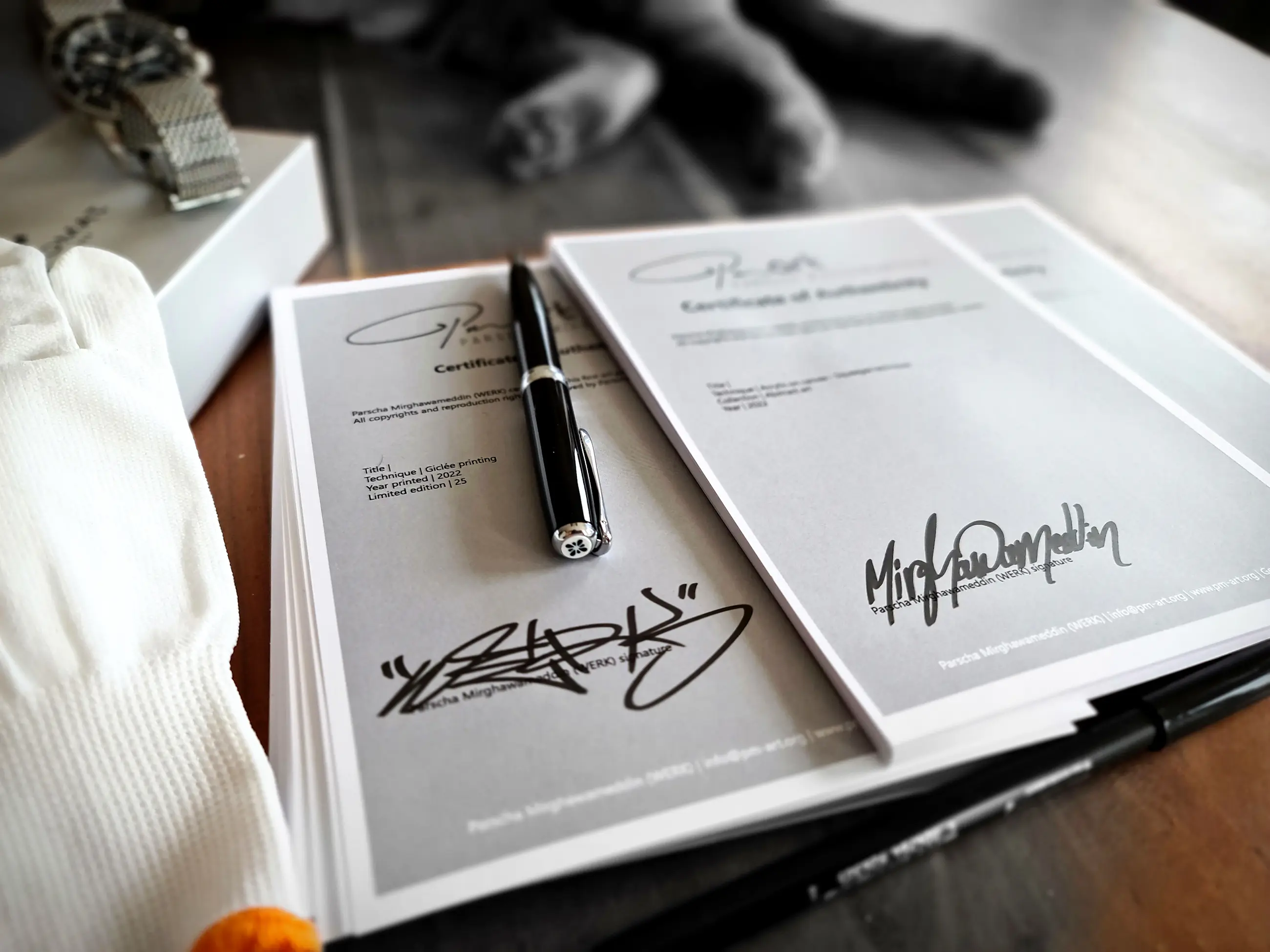 Elk van zijn werken is uniek, handgesigneerd en wordt geleverd met een persoonlijk authenticiteitsbewijs dat de originaliteit en waarde ervan garandeert.