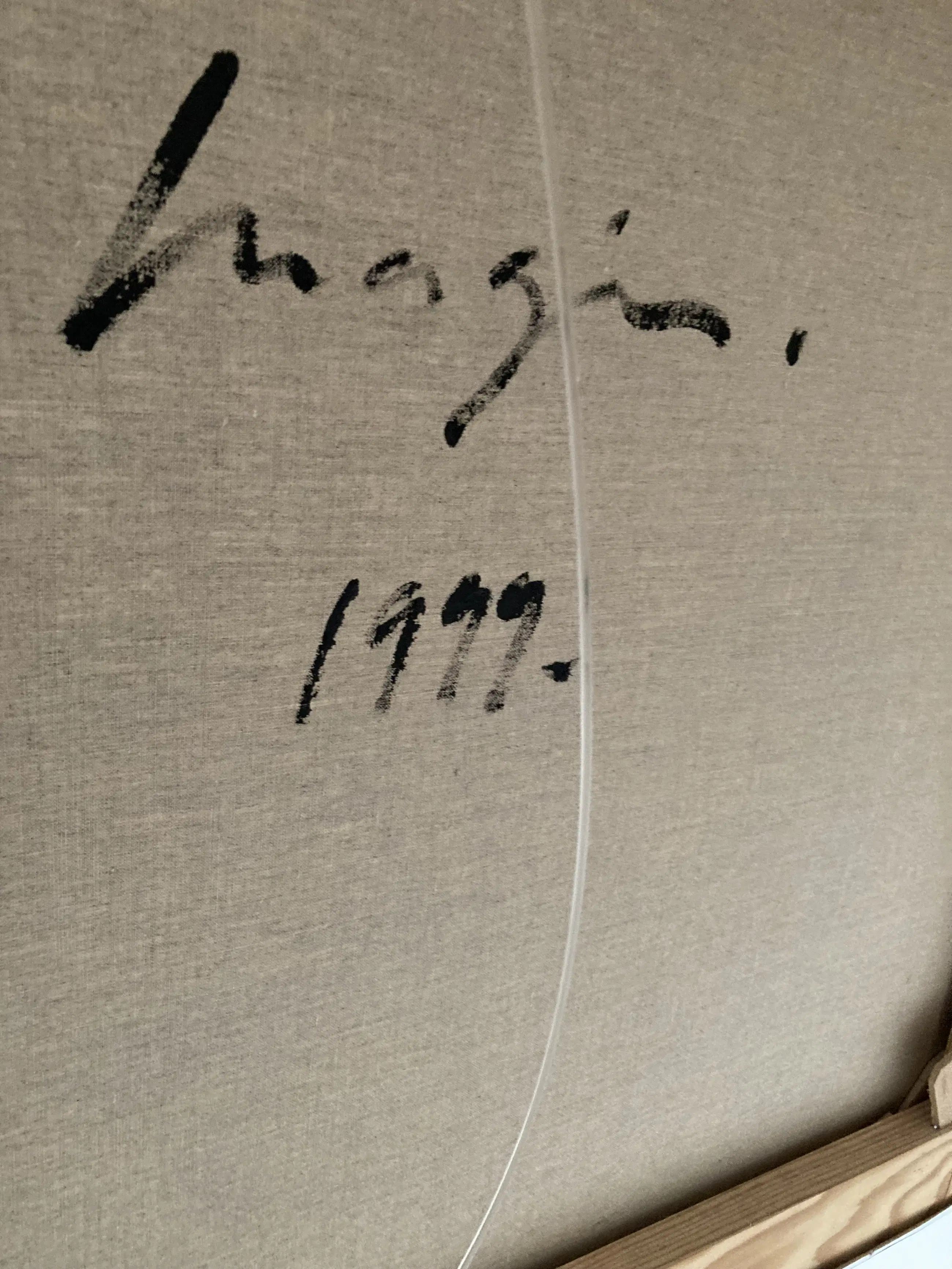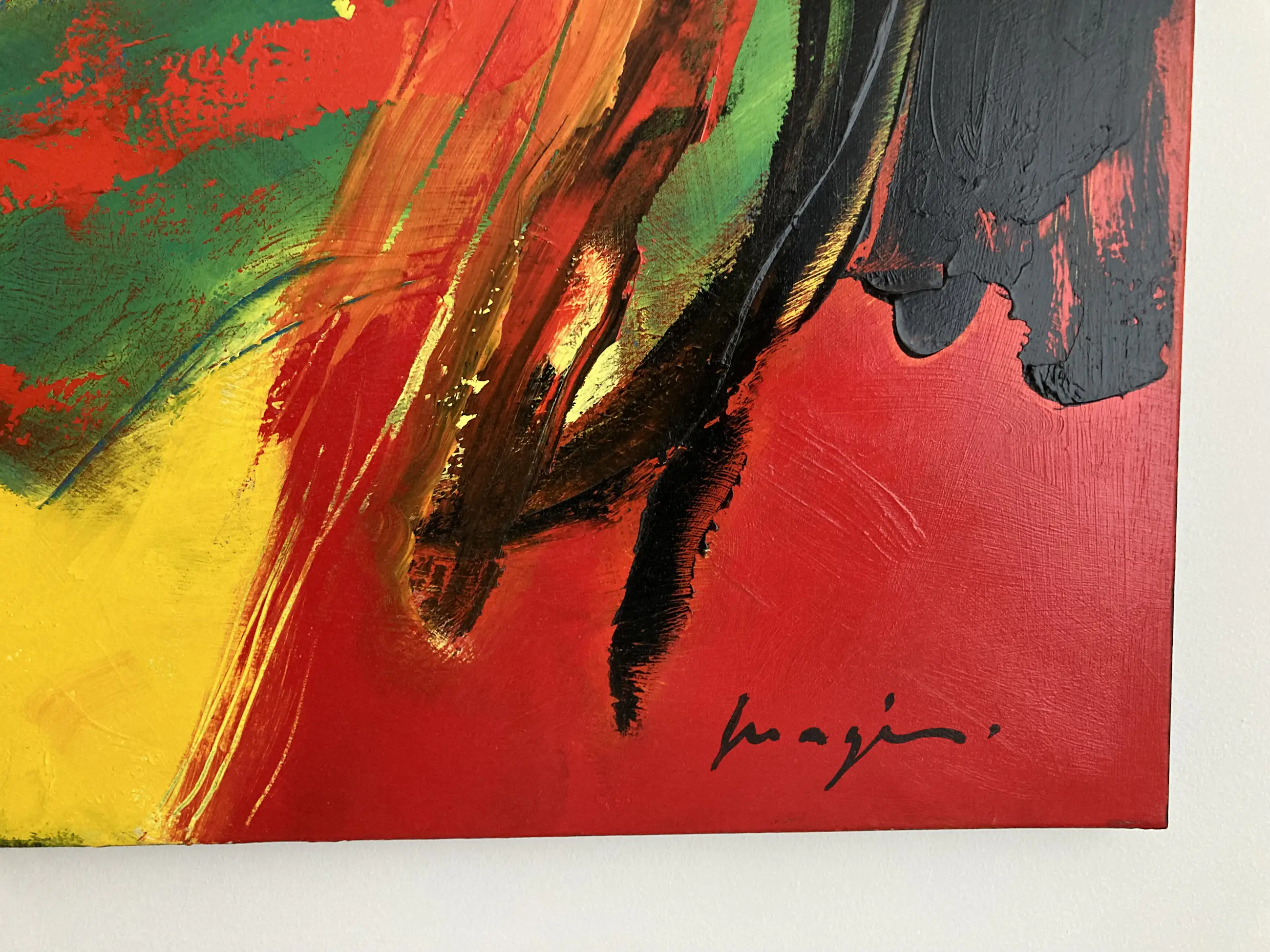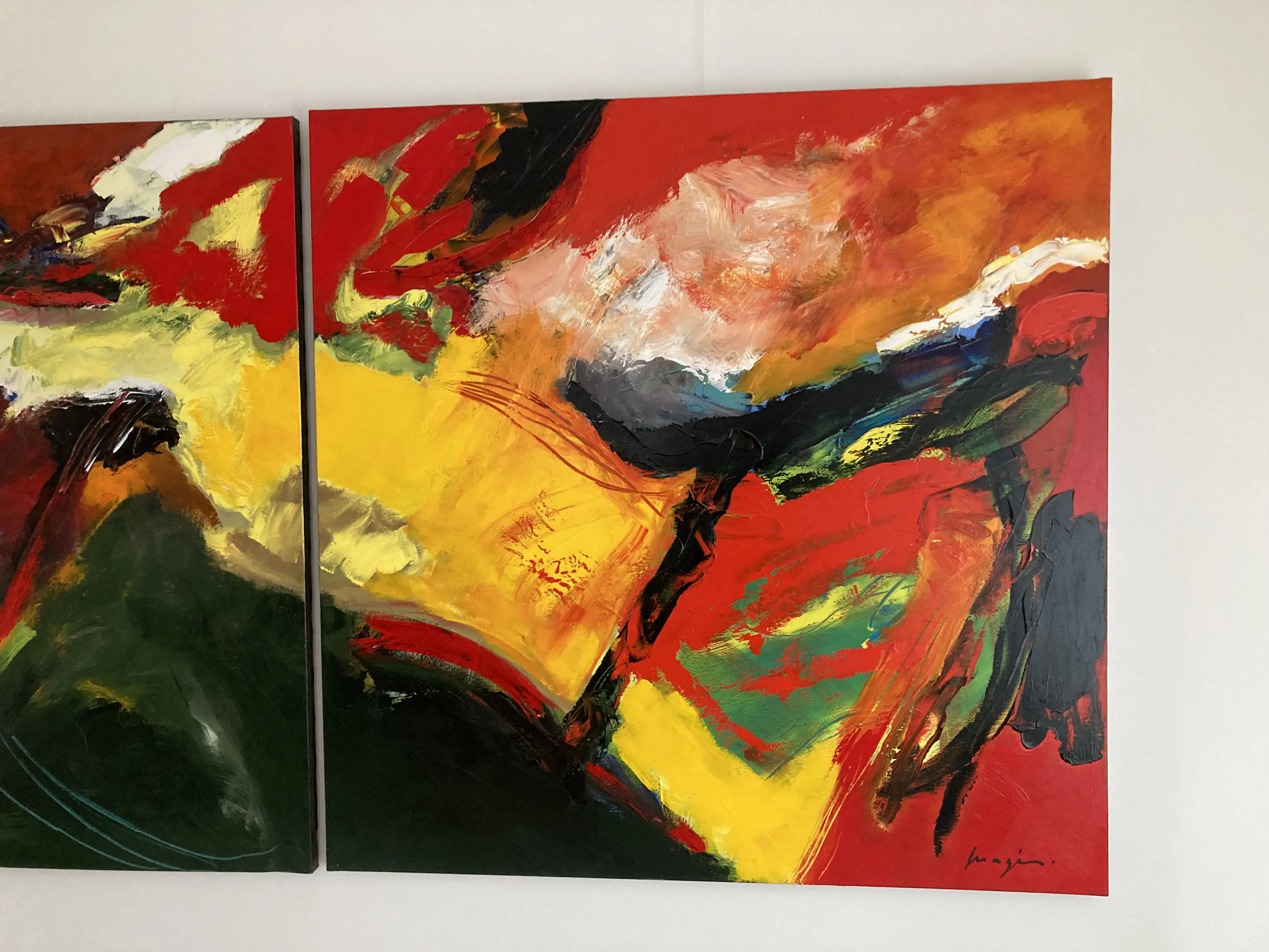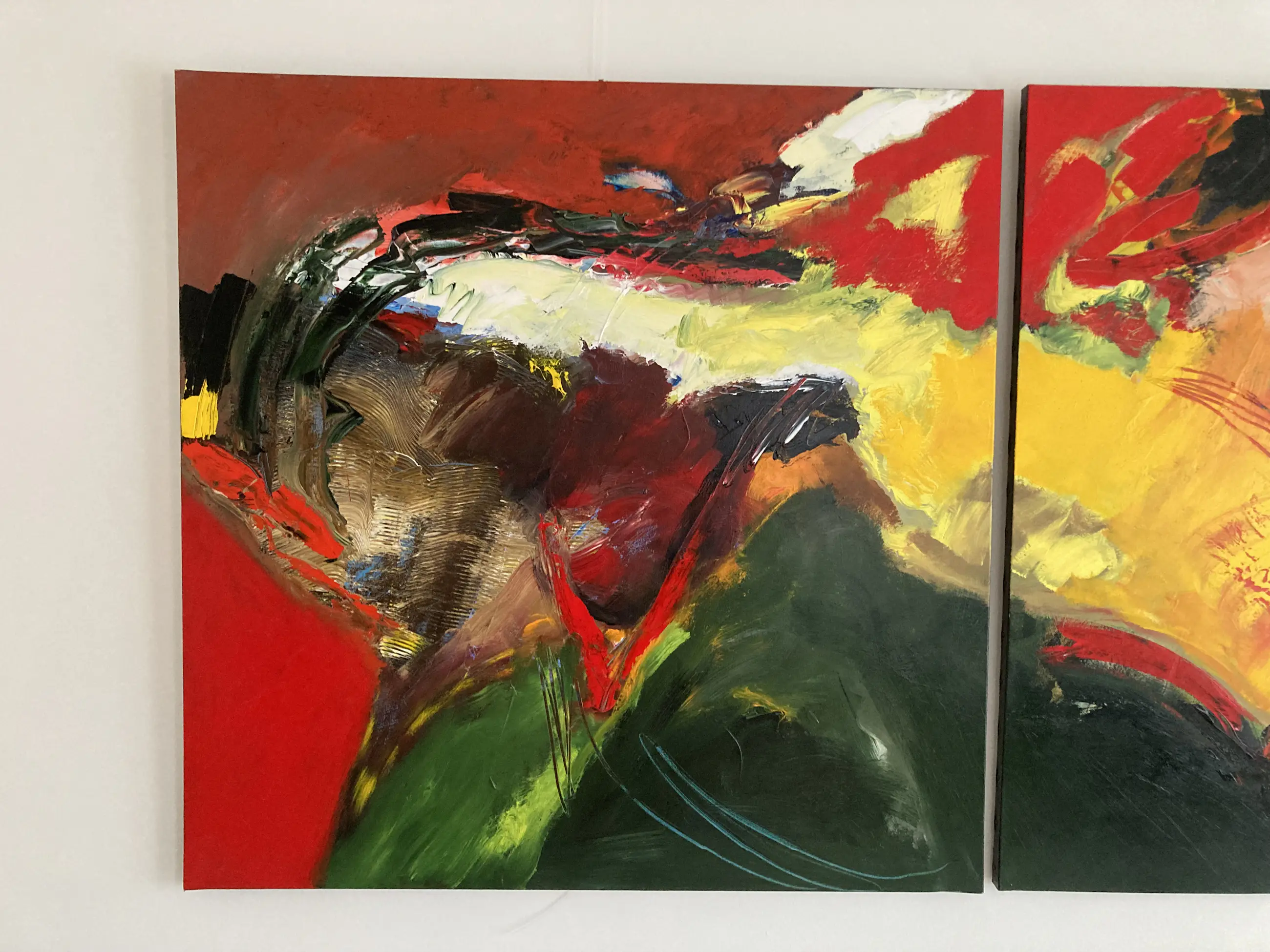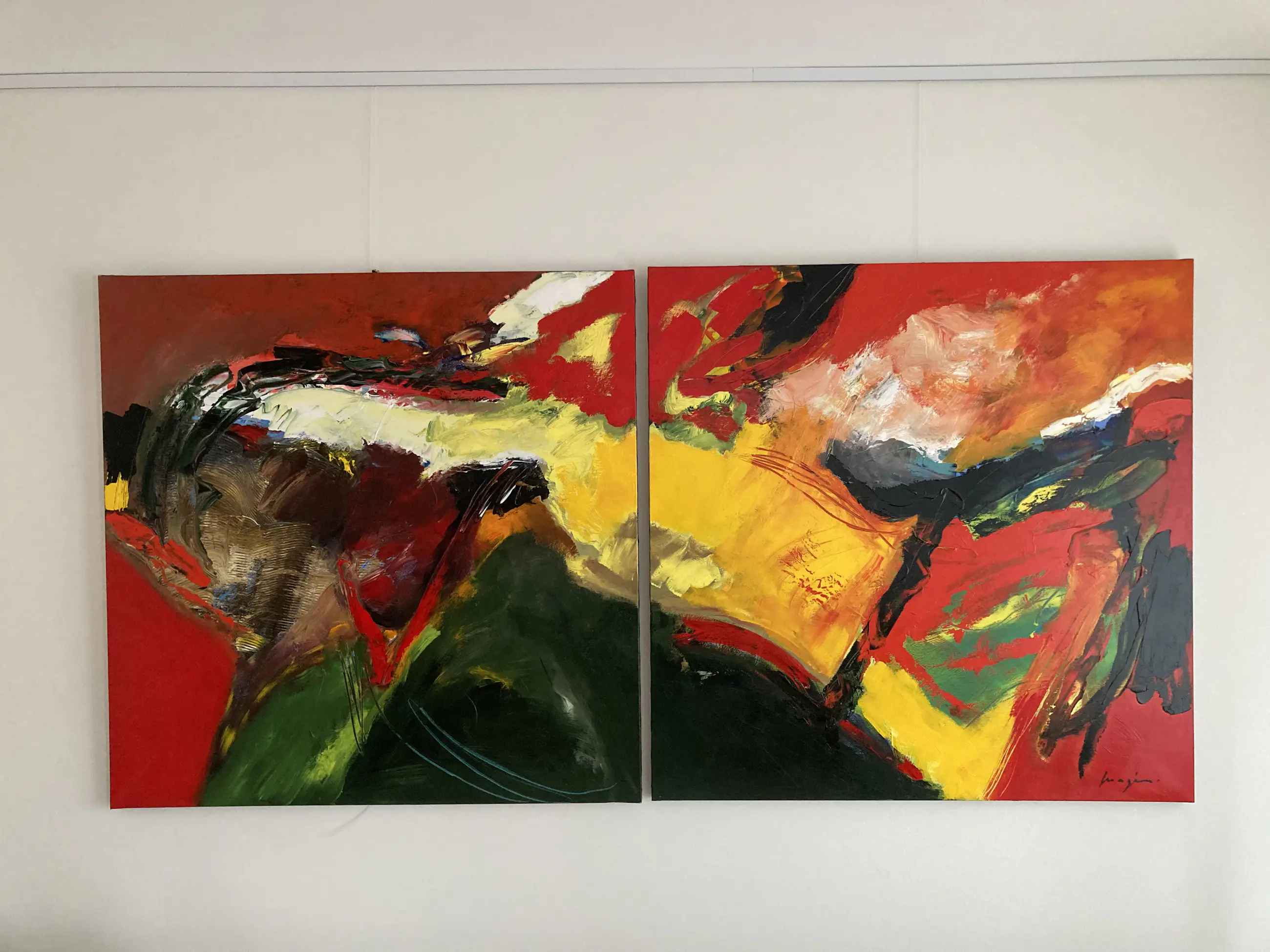 Uniek tweeluik (1999) van Pascal Magis, acryl op doek, 2x100x100. De ruiter herkent het springende paard. Moet weg vanwege verhuizing.