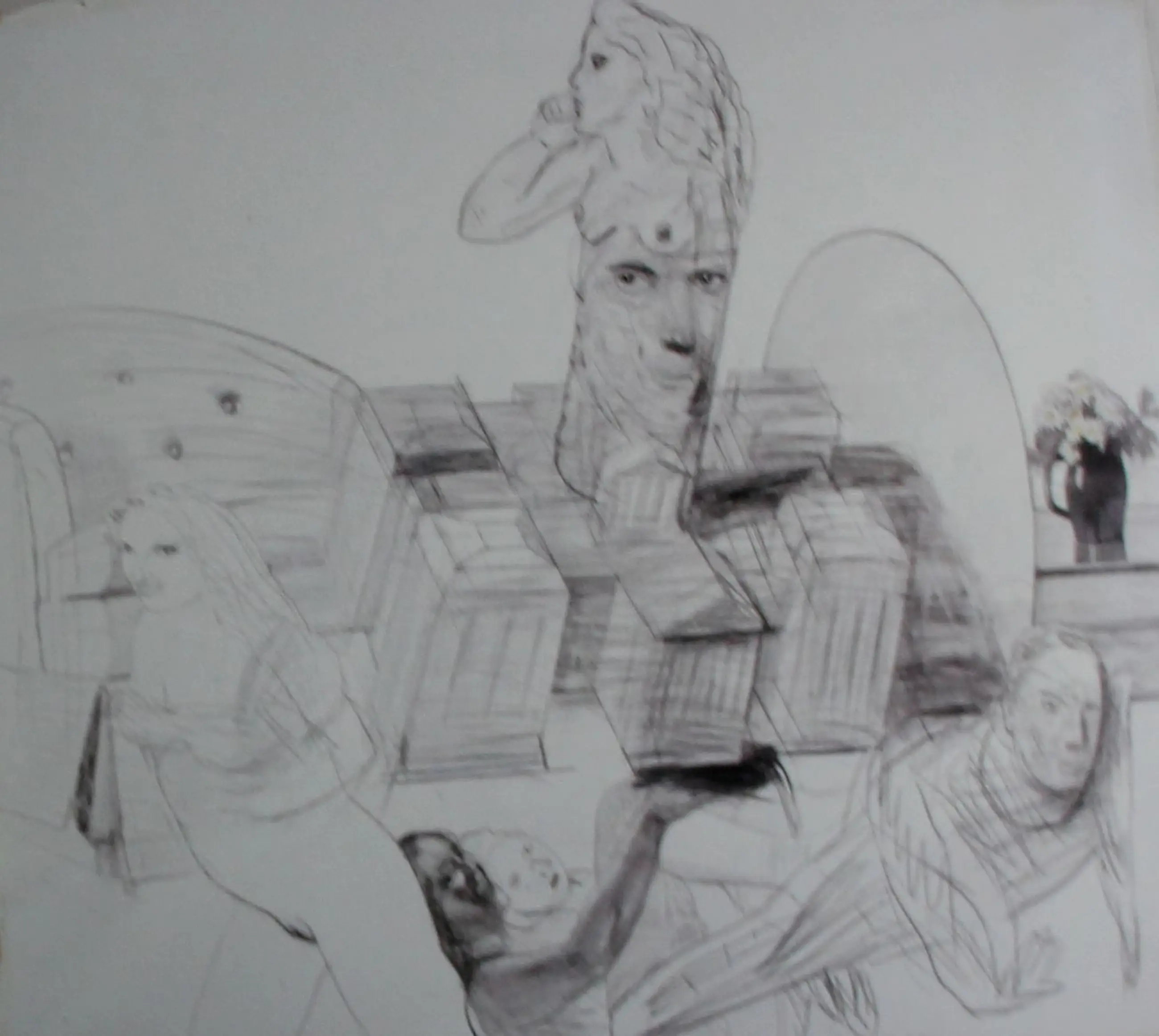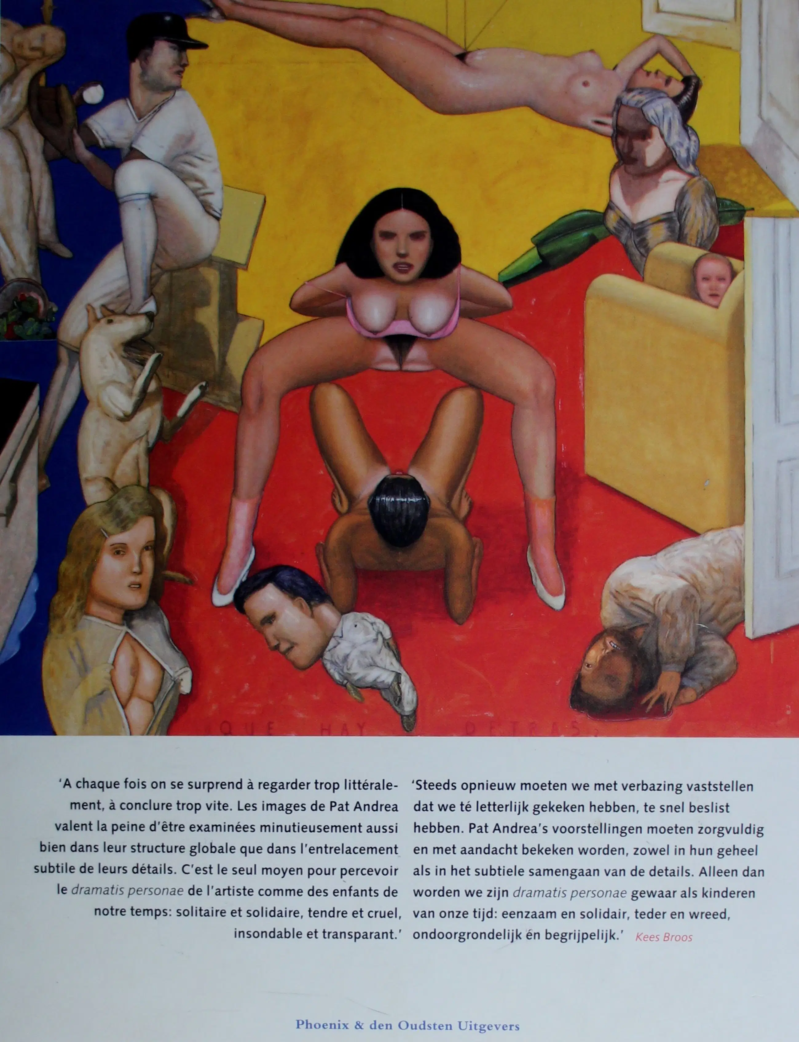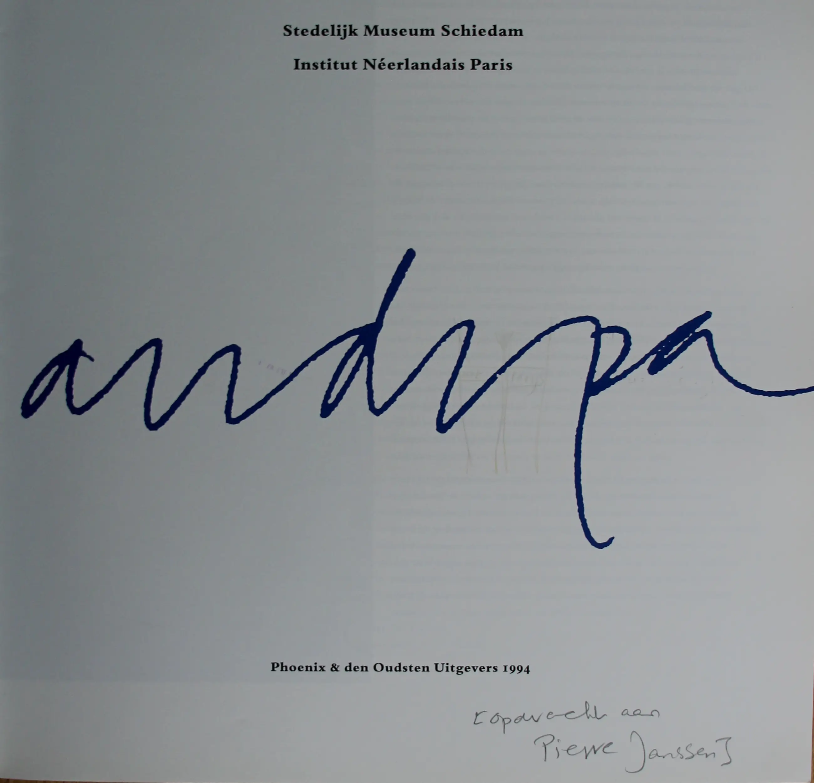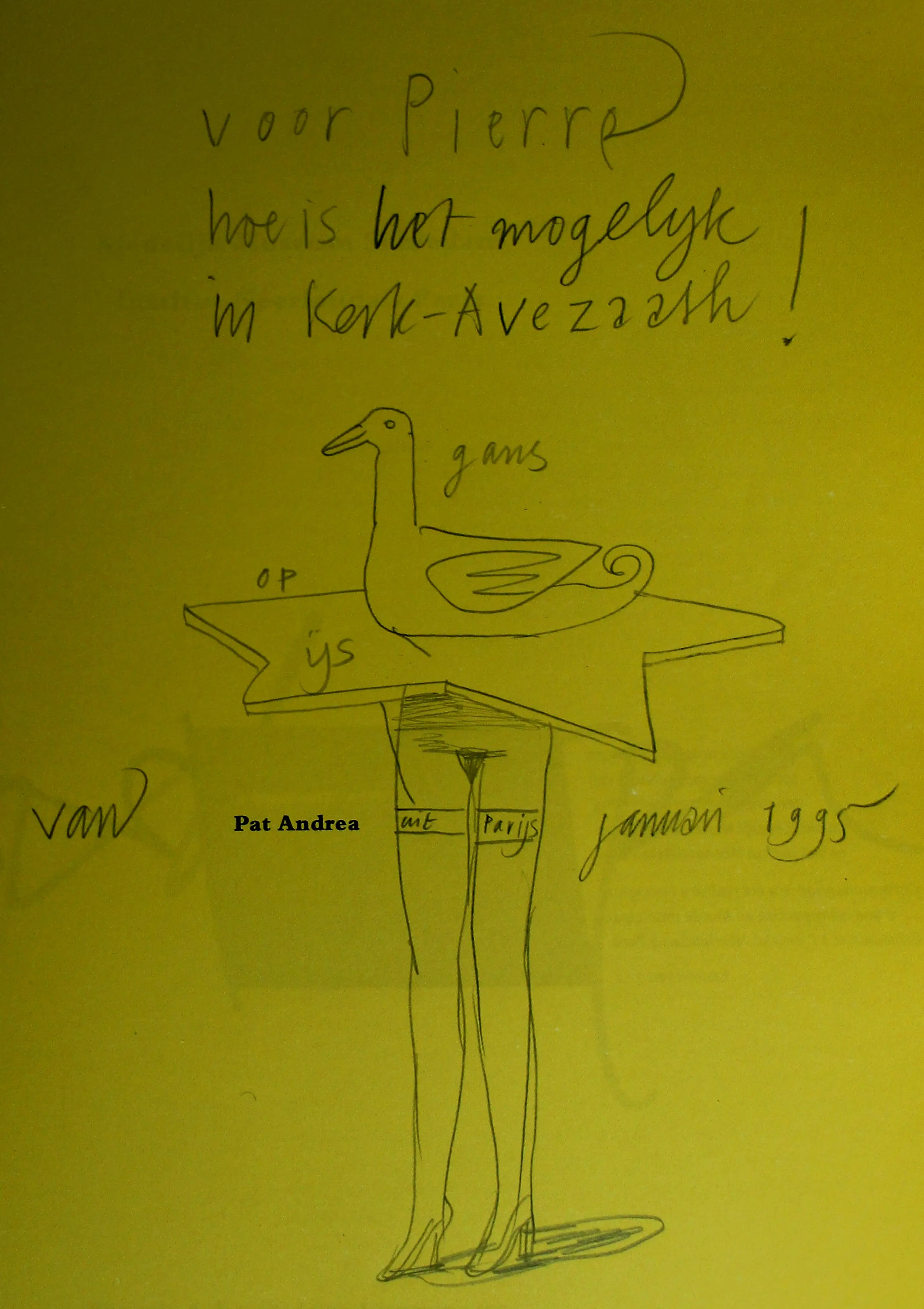 Boek met potloodtekening, van Pat Andrea. Uitgave behorende bij een tentoonstelling over Pat Andrea in het Stedelijk Museum Schiedam en Institut Néerlandais Paris in 1994. Met opdracht: Voor Pierre, hoe is het mogelijk in Kerk- Avezaath. Afmetingen boek: H30 x b 24cm. Afmetingen tekening incl. tekst: H20,5 x B15cm. Afmetingen tekening: H15 x b10cm.