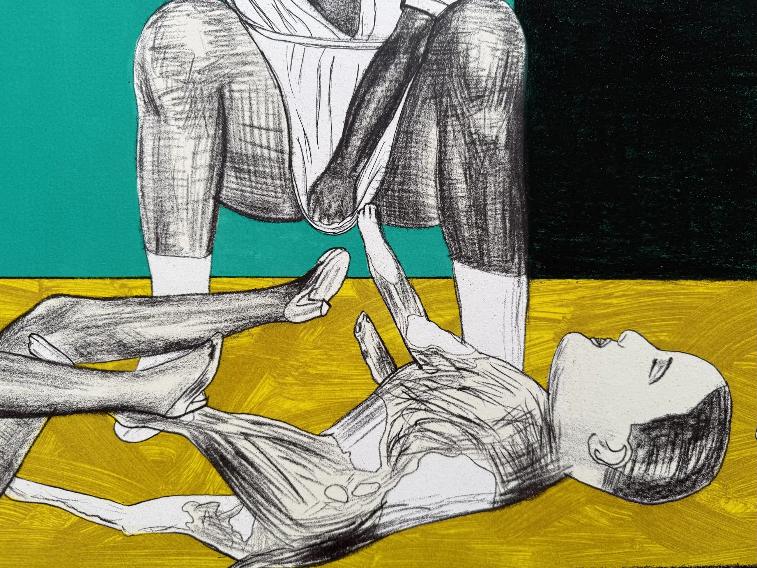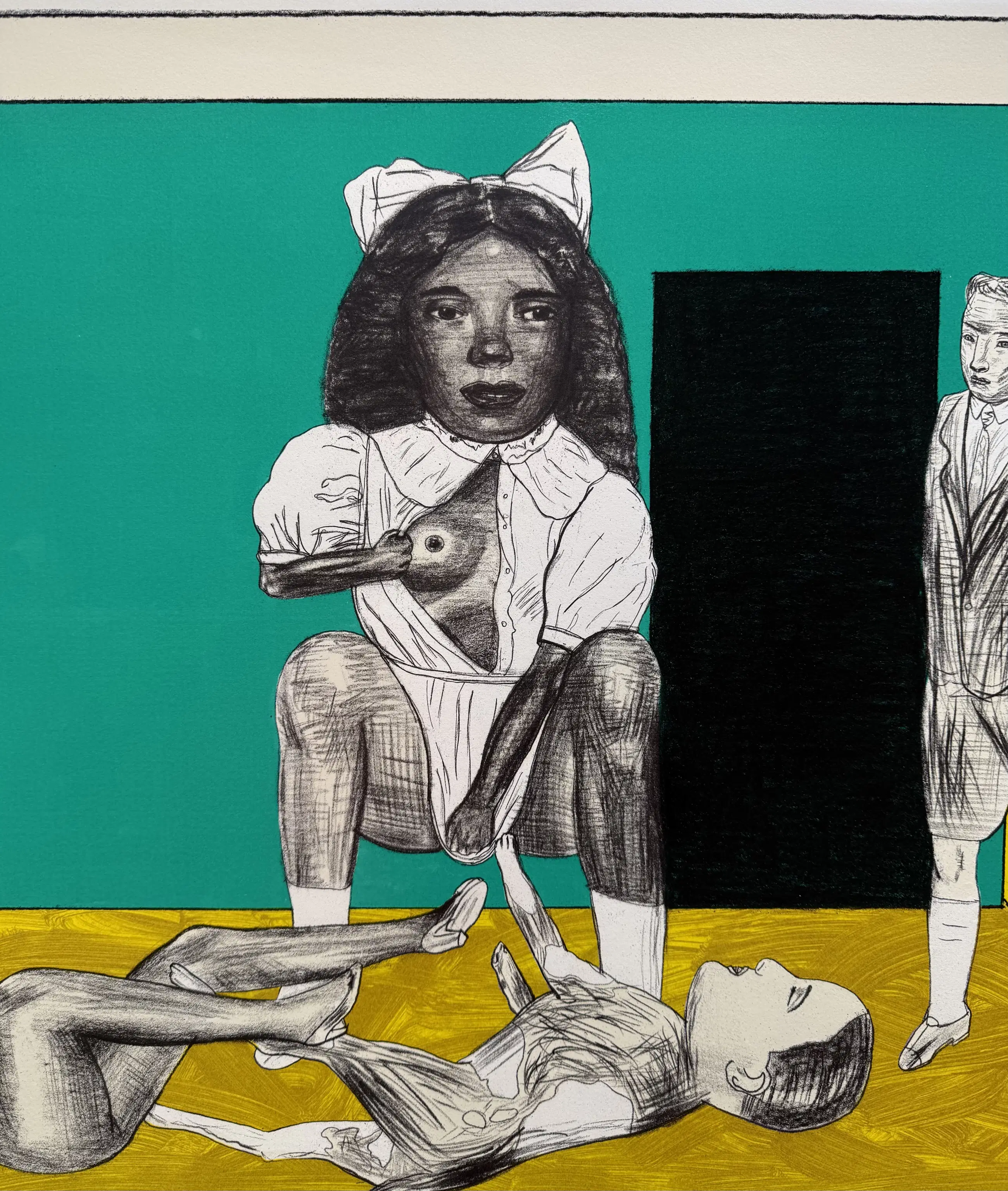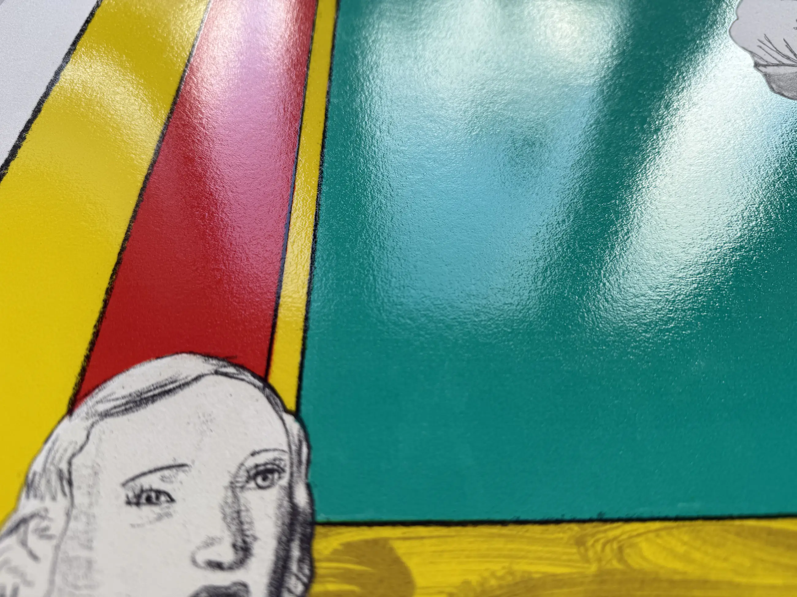 Door gebruik te maken van verschillende druktechnieken (zeefdruk en ets) en speciale glanslak komt dit werk helemaal tot leven. Op de laatste foto is te zien wat voor effect de glanslak geeft op de gekleurde gedeeltes. De figuren lijken juist met potlood gemaakt te zijn door de etstechniek. Erg fraai!