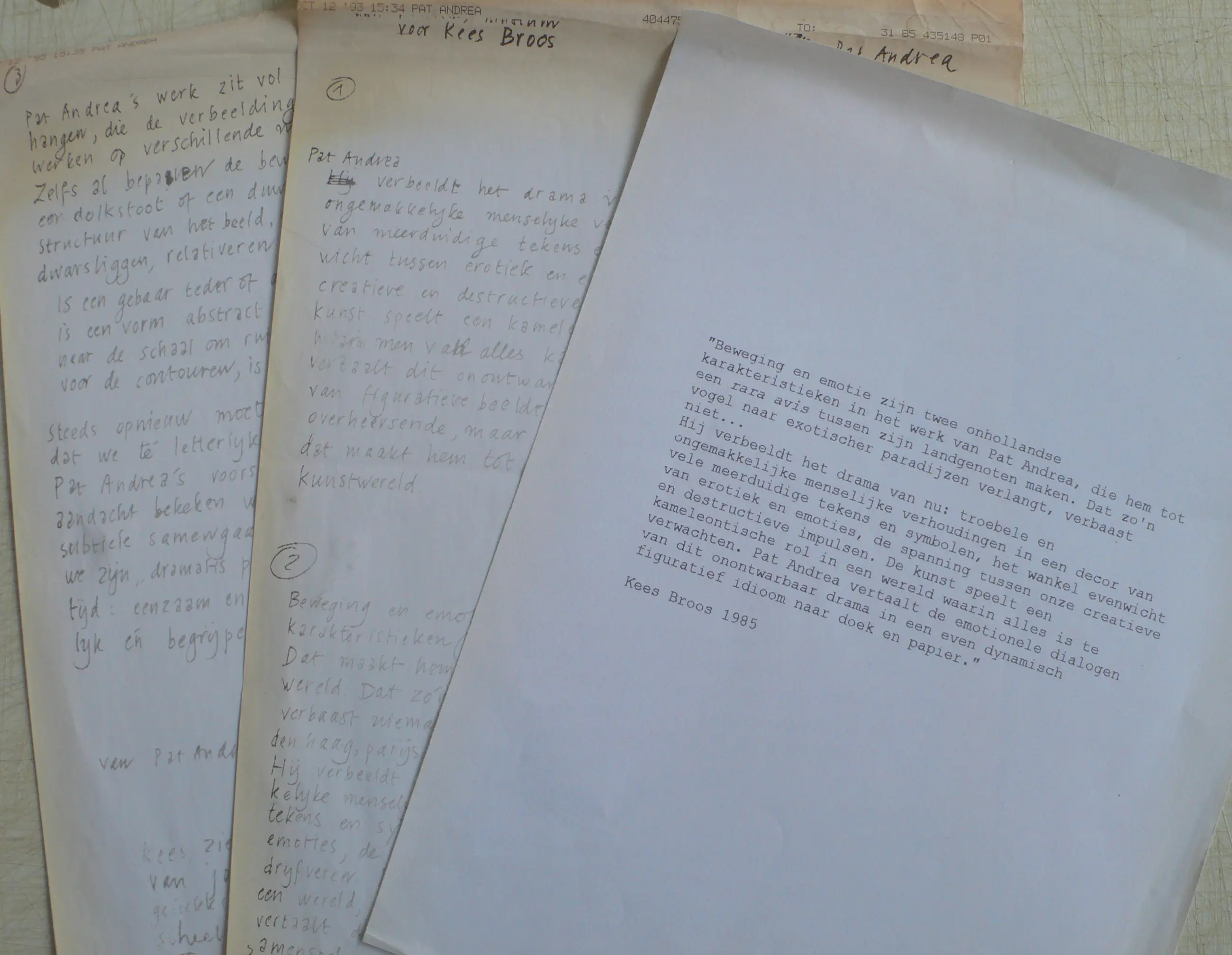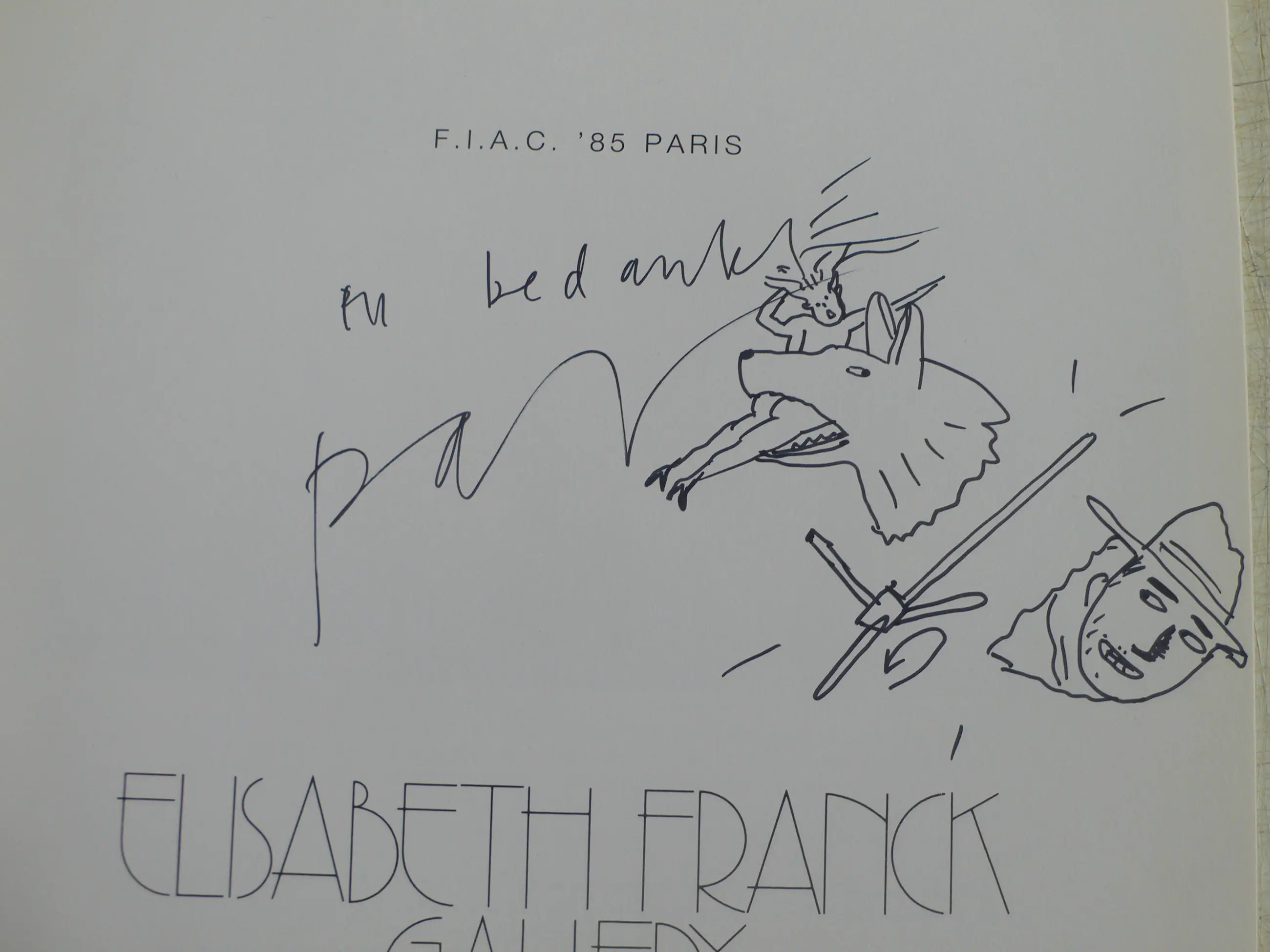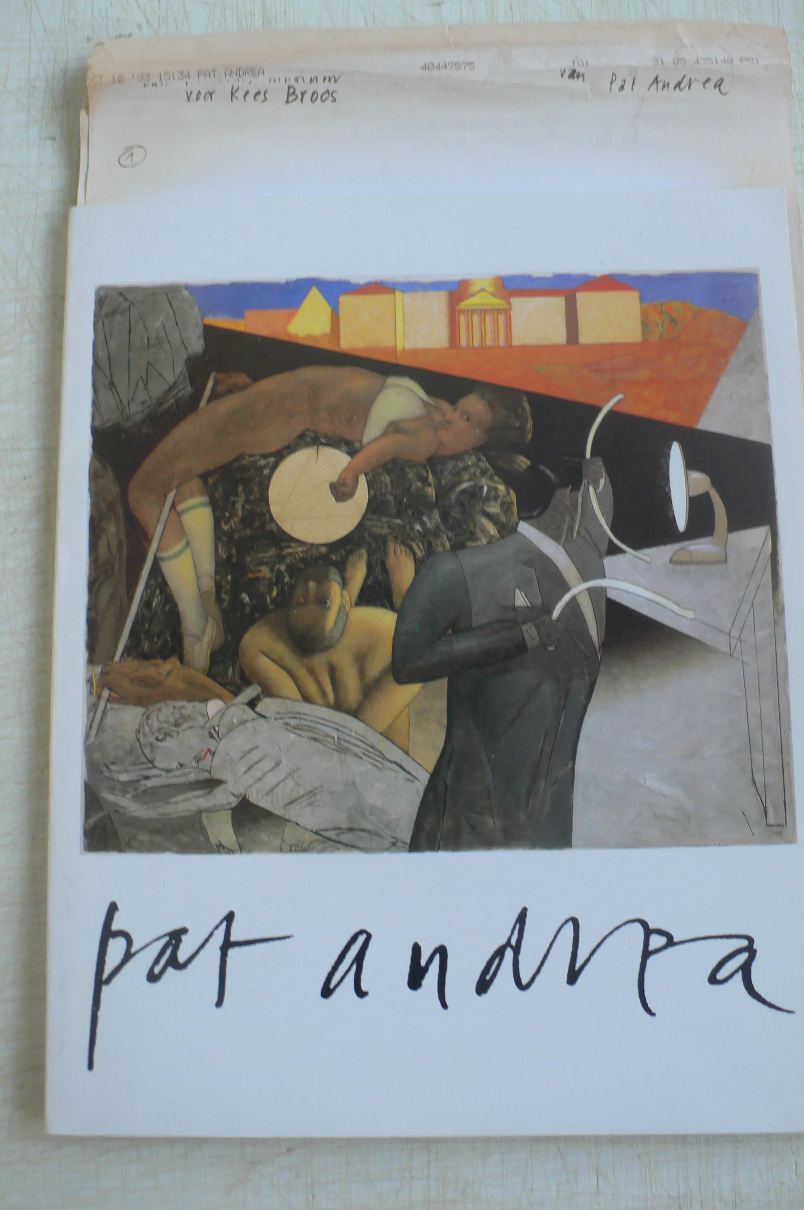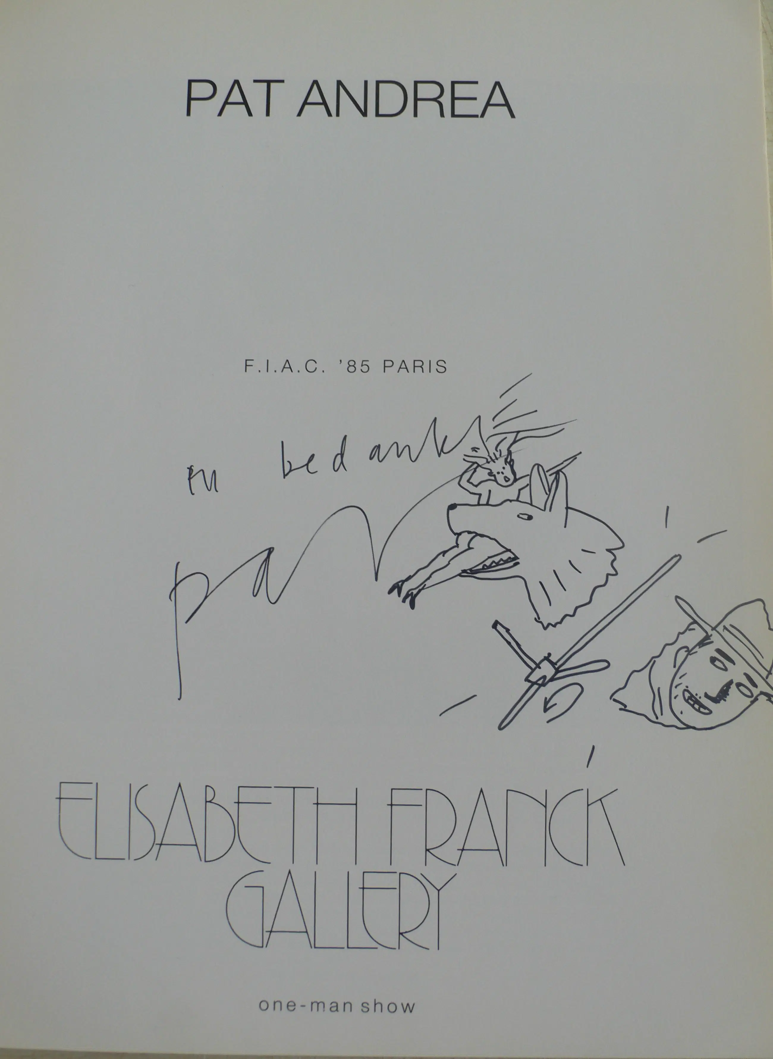 Fraaie catalogus 'One man show' - van Elisabeth Franck Gallery tgv. F.I.A.C. '85 Paris. De catalogus is afkomstig van Kees Broos, met een opdrachttekening voor hem: 'En bedankt Pat Andrea' (zie foto). Kees Broos, kunstcriticus, verzorgde het voorwoord. Hierbij liet hij zich inspireren door een drietal handgeschreven teksten die per fax door Pat Andrea werden toegezonden. De faxteksten zijn door de tijd gebleekt, maar goed leesbaar. De definitieve tekst toegevoegd! Deze werd uiteindelijk in het Frans vertaald. Mooi geheel voor verzamelaar.