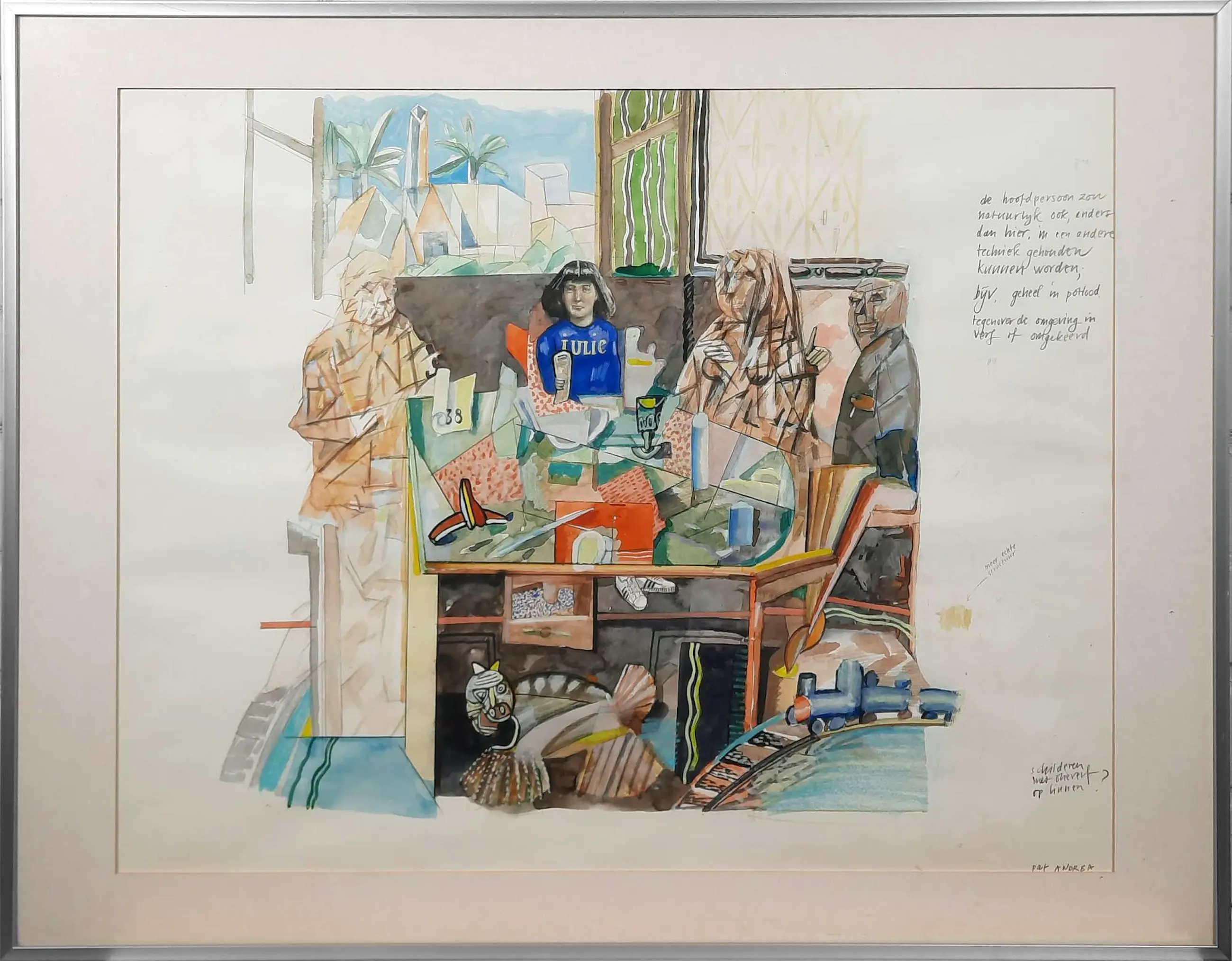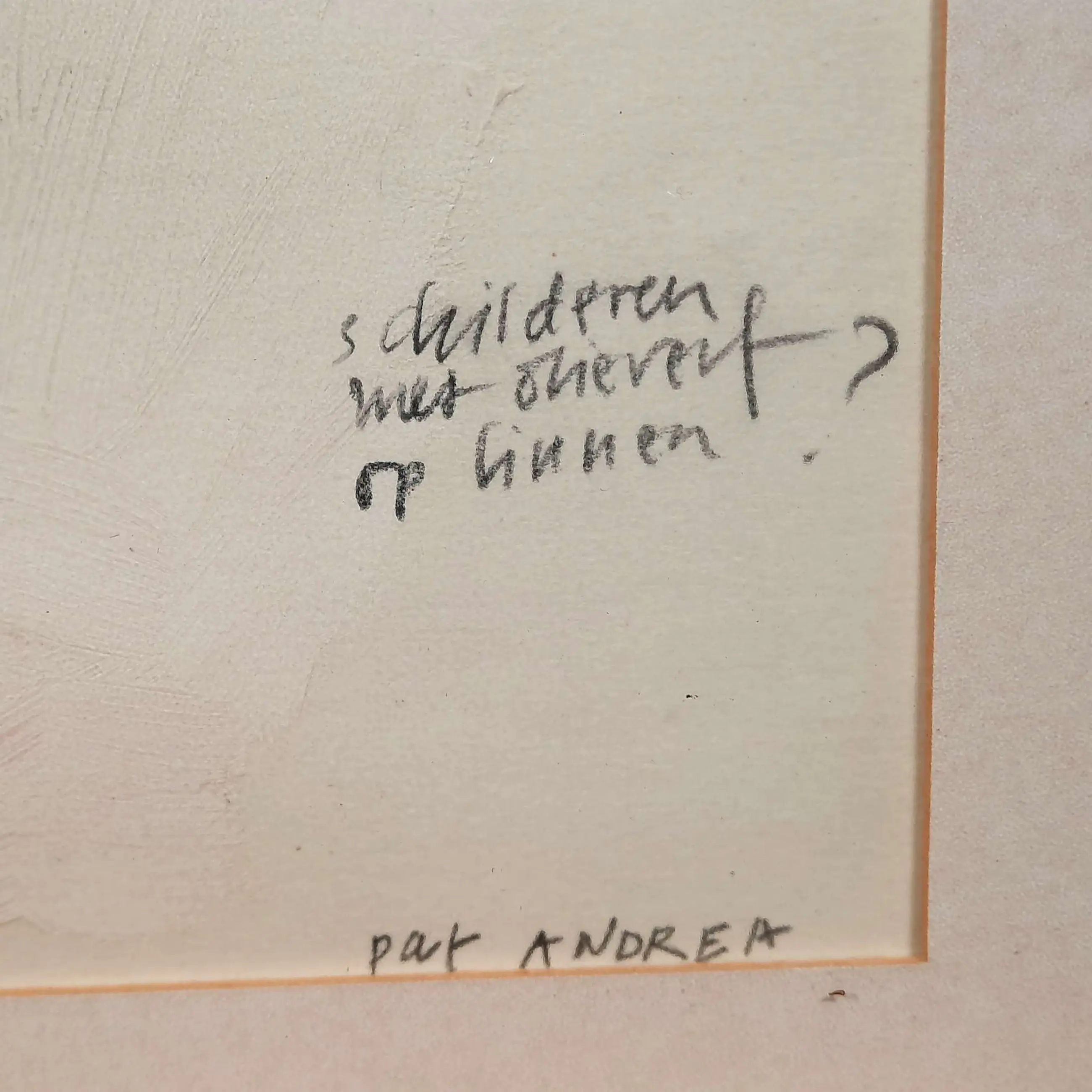 Bijzonder werk van kunstenaar Pat Andrea. Het is een ontwerp voor het kinderboeken geschenk. Herkomst is bekend. Zit in een simpele lijst achter ontspiegeld glas.