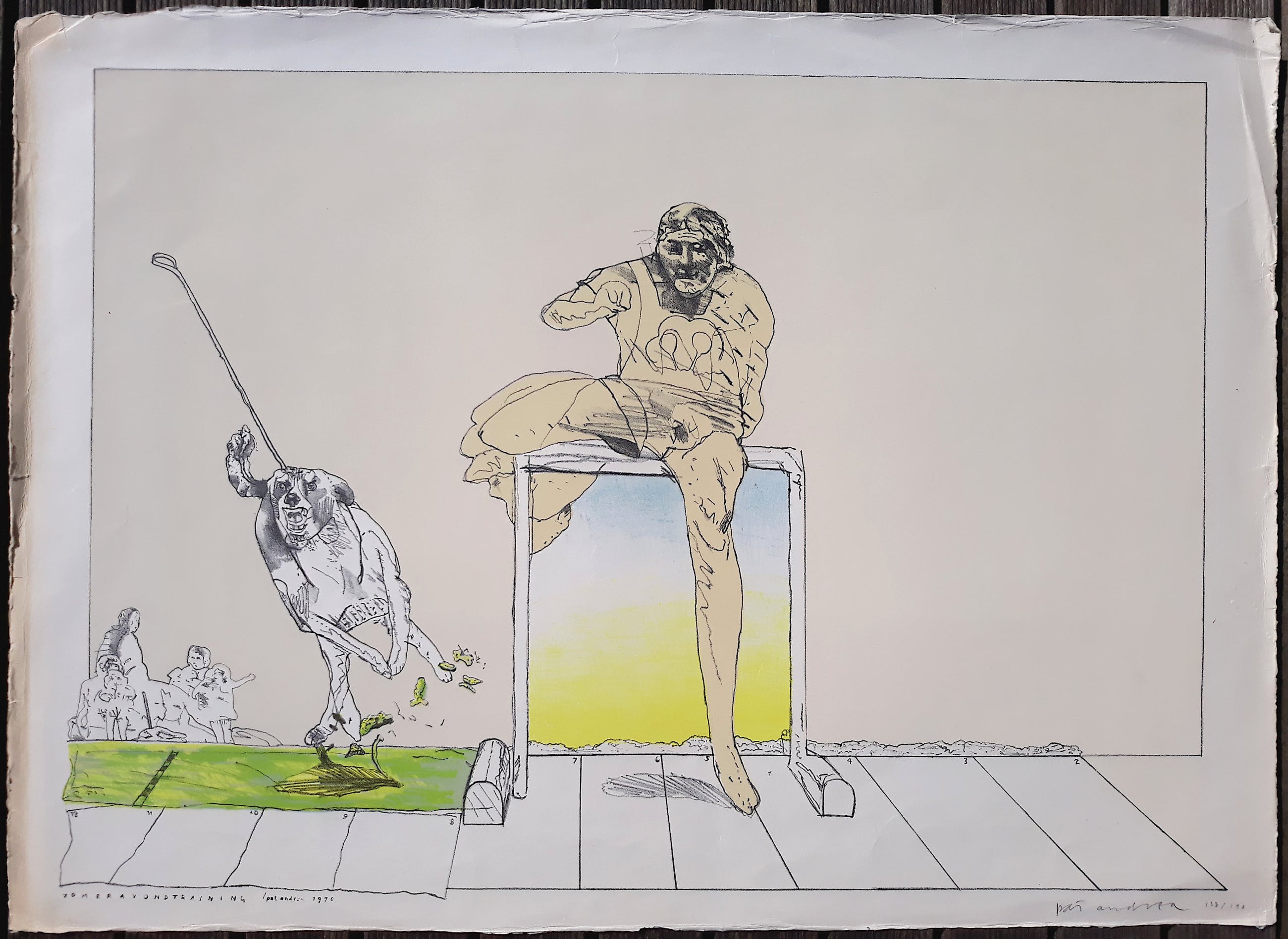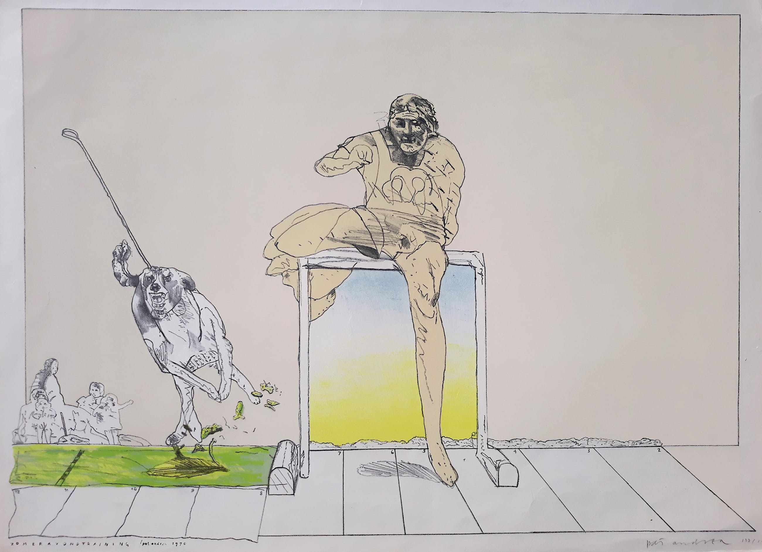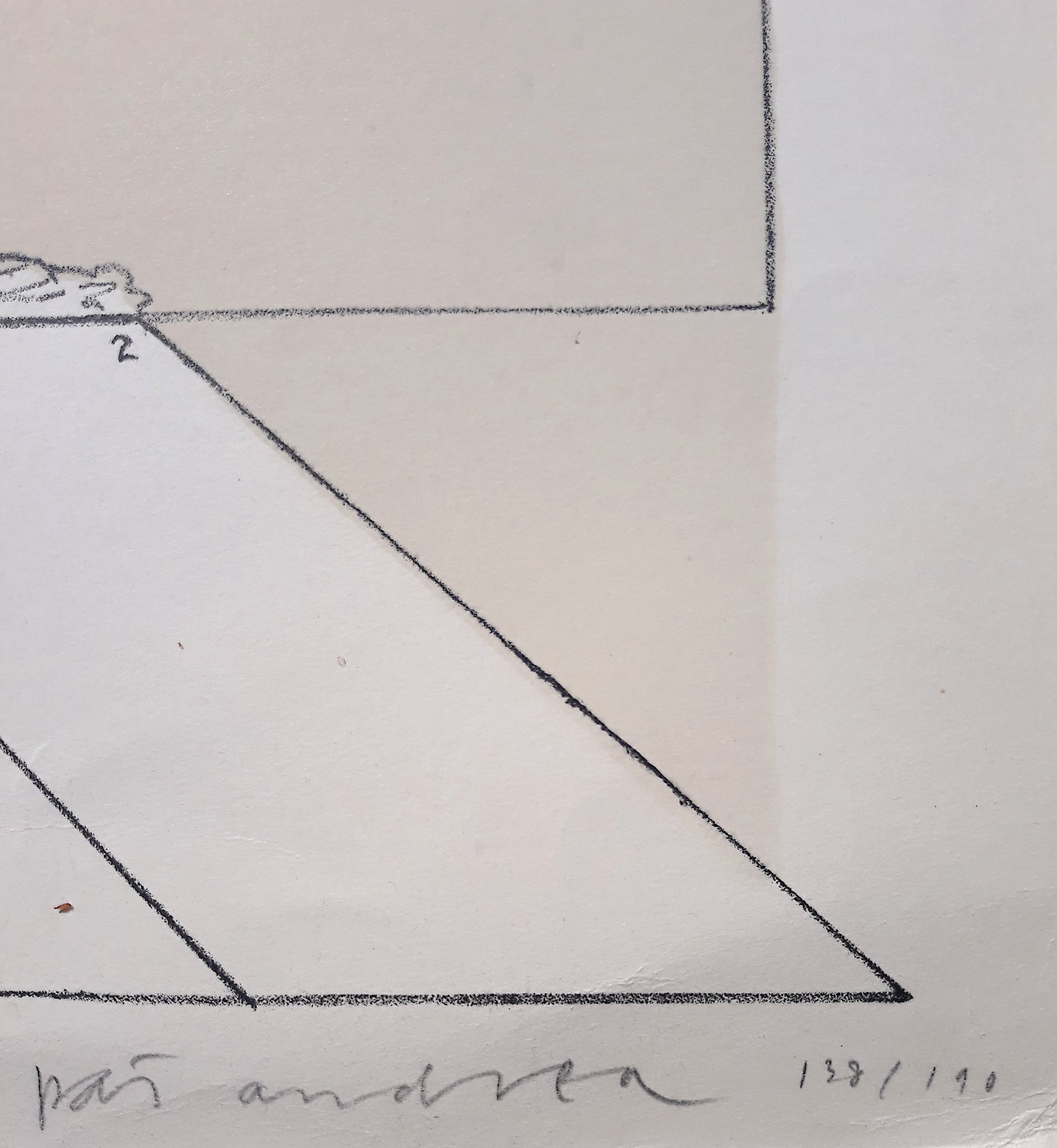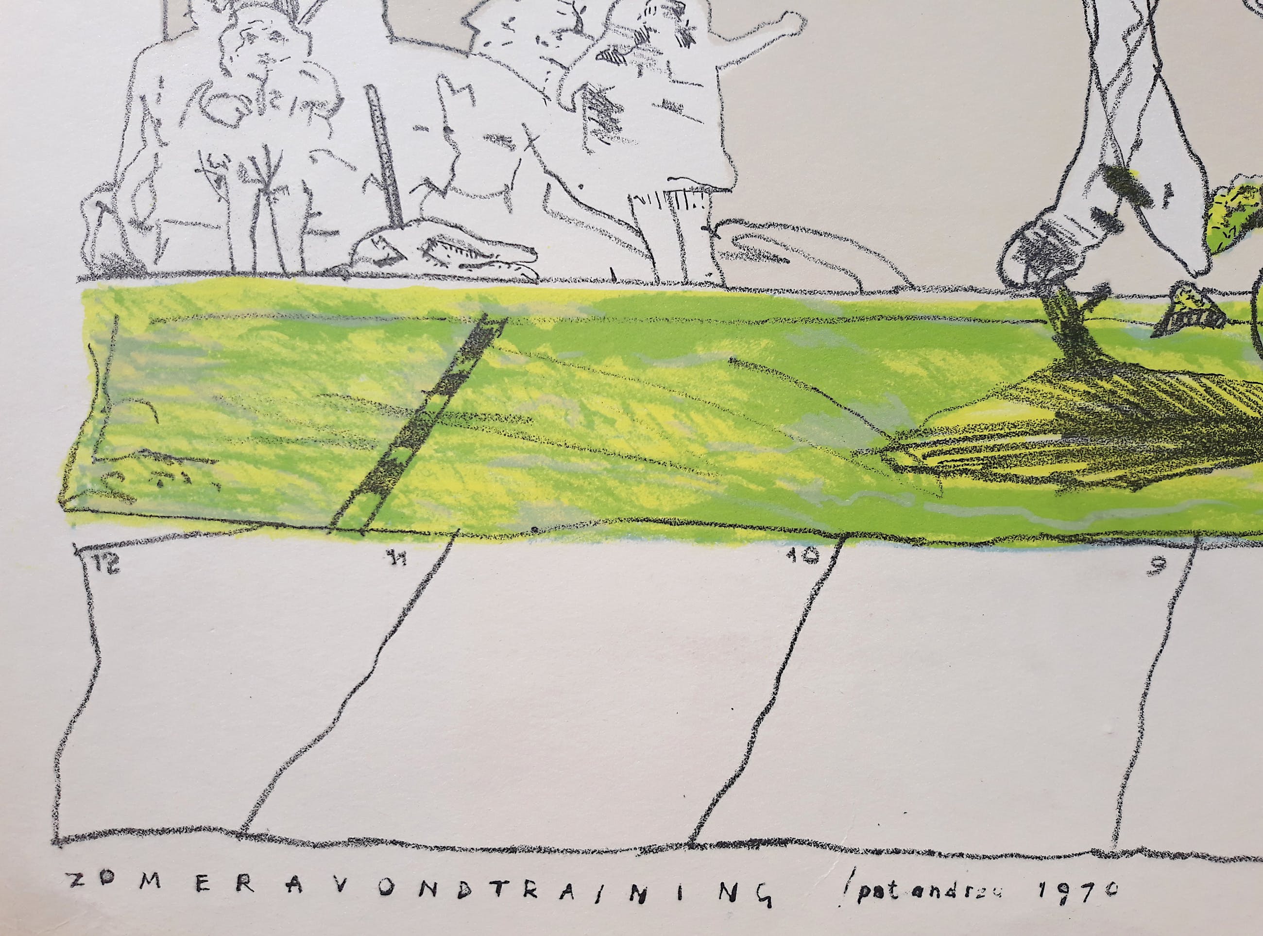Karakteristiek werk van Pat Andrea, uitgegeven door Prent 190. Litho op geschept papier, met potlood gesigneerd en genummerd (138/190), in de druk getiteld, gedateerd (1970) en nogmaals gesigneerd. In redelijke conditie; in de marge zitten kreuken en de uiterste linker marge is verkleurd. Strak ingelijst met passe-partout is het werk prima toonbaar.