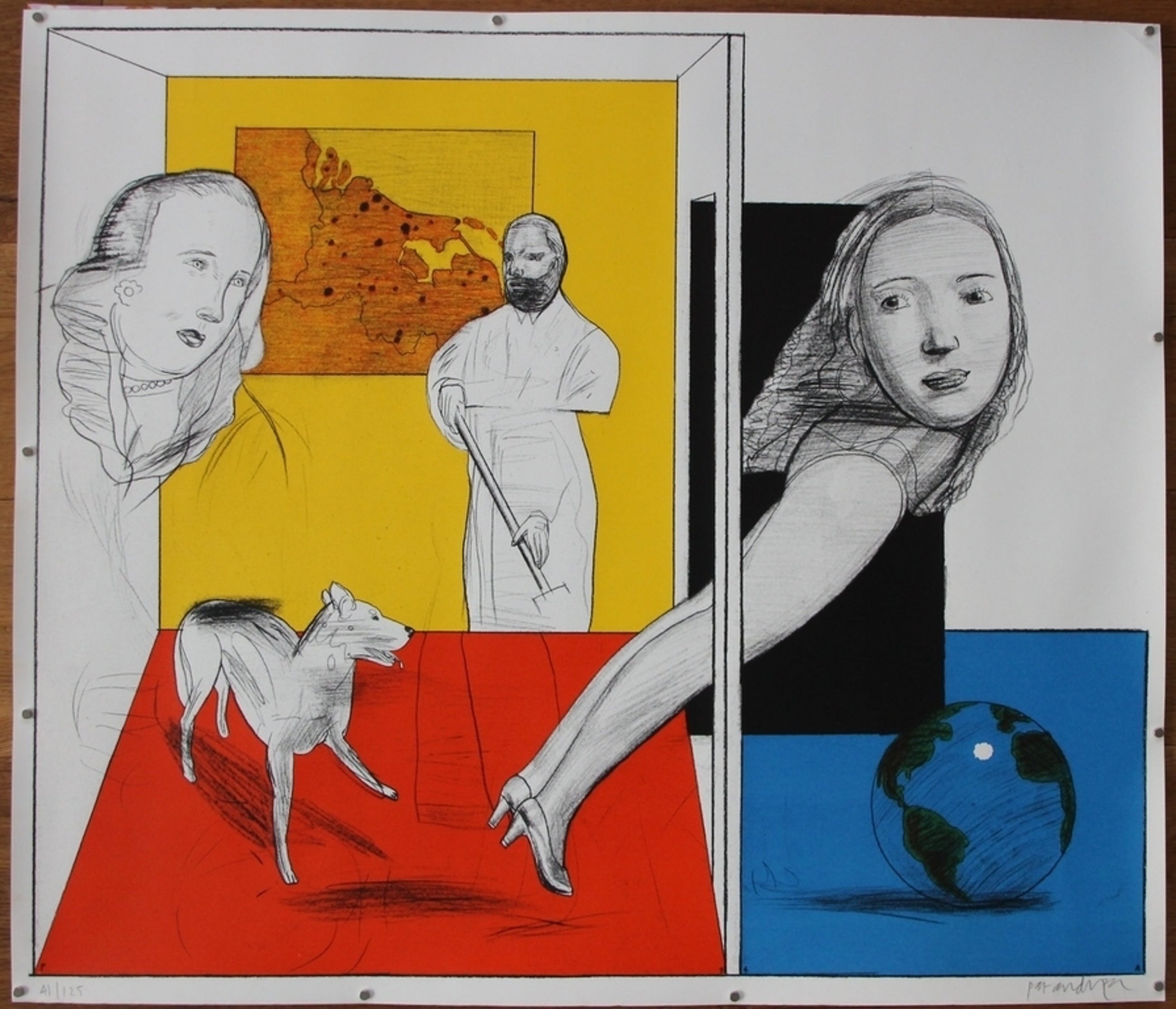Titel: Zonder titel Jaartal: 1994 Afmetingen beeld: h. 60 cm x b. 70 cm Gesigneerd: rechtsonder handgesigneerd Oplage: 41/125 Ingelijst: Nee Conditie: het werk is in goede staat. Er zitten aan de bovenkant een paar lichtbruine kleine vochtvlekjes.
