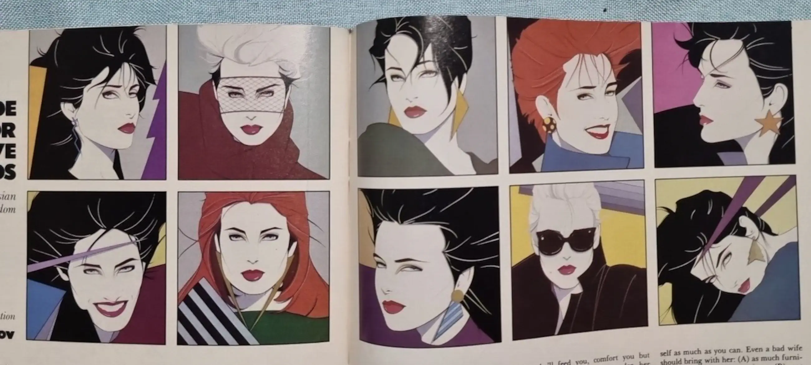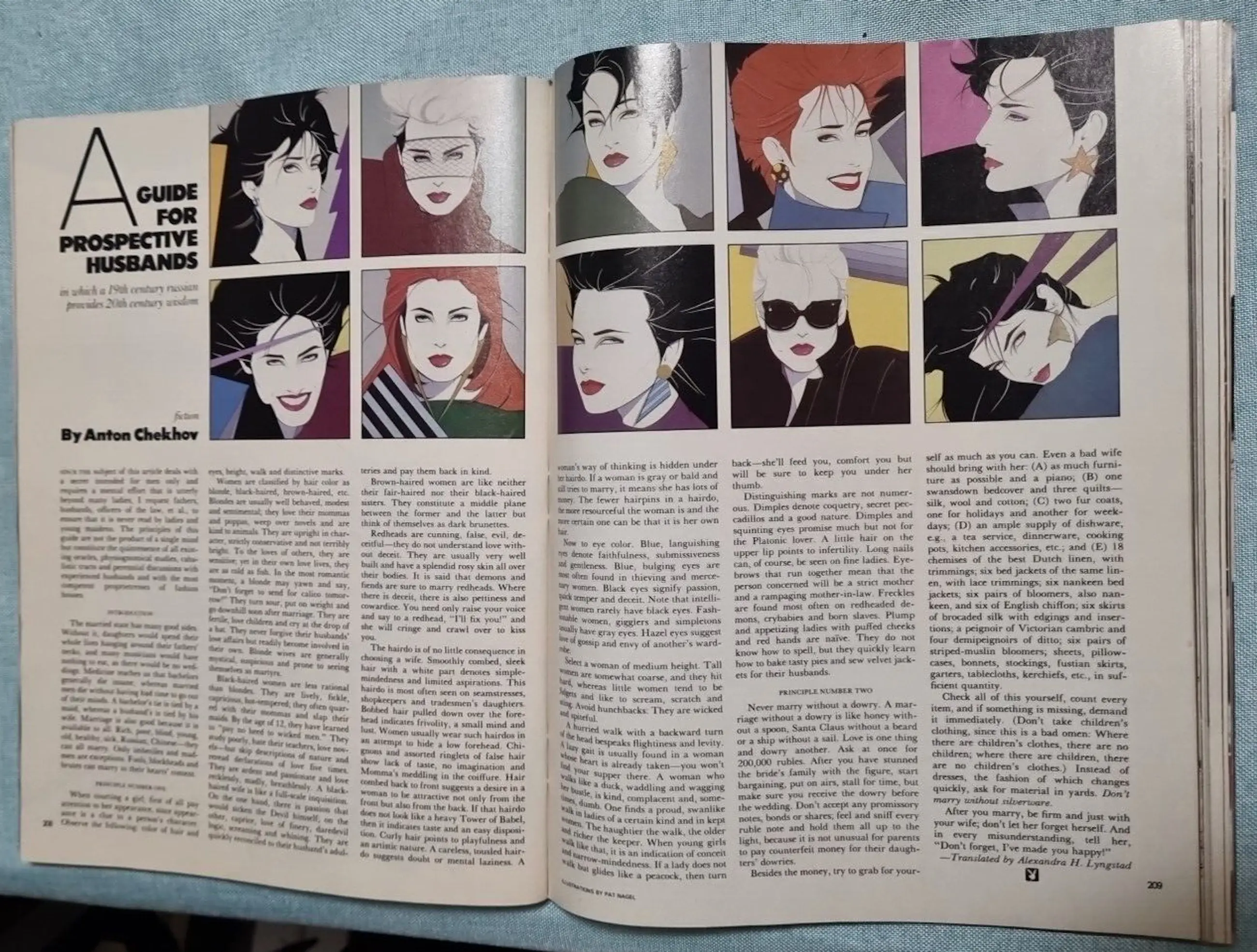 Postume uitgave naar een werk van Patrick Nagel. Toen Playboy haar 'Thirtieth anniversary' nummer publiceerde, stond daar een onderhoudend artikel in van Anton Chekhov. Patrick Nagel illustreerde dit artikel met tien koppen. Sensueel, uitdagend en typisch jaren '80. Excentrieke kapsels, grote oorbellen, veel make-up. Na zijn dood in 1984 zijn deze illustraties gebruikt voor deze zeefdrukken. Patrick Nagel was een Amerikaanse kunstenaar en illustrator. Hij creëerde populaire illustraties op karton, papier en canvas, waarvan de meeste de vrouwelijke vorm benadrukken in een kenmerkende stijl, afstammend van Art Deco en pop-art.