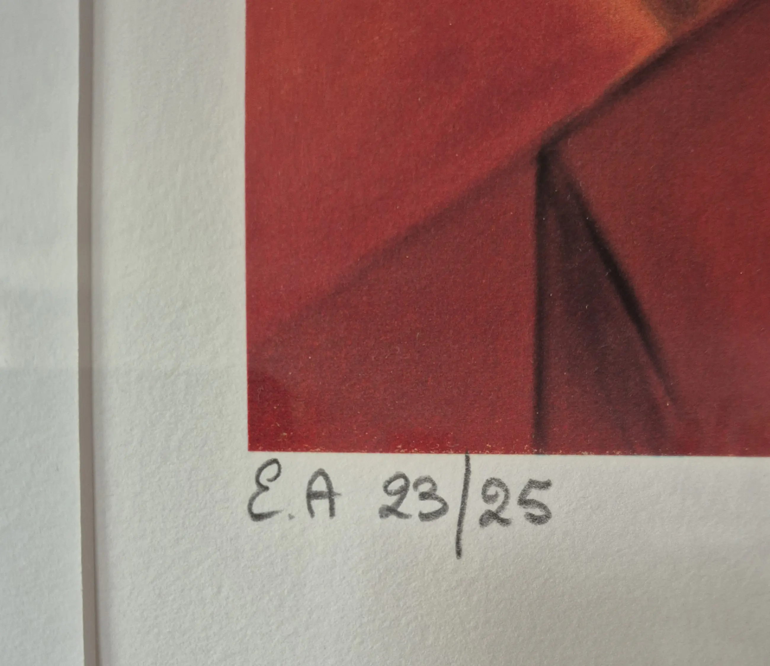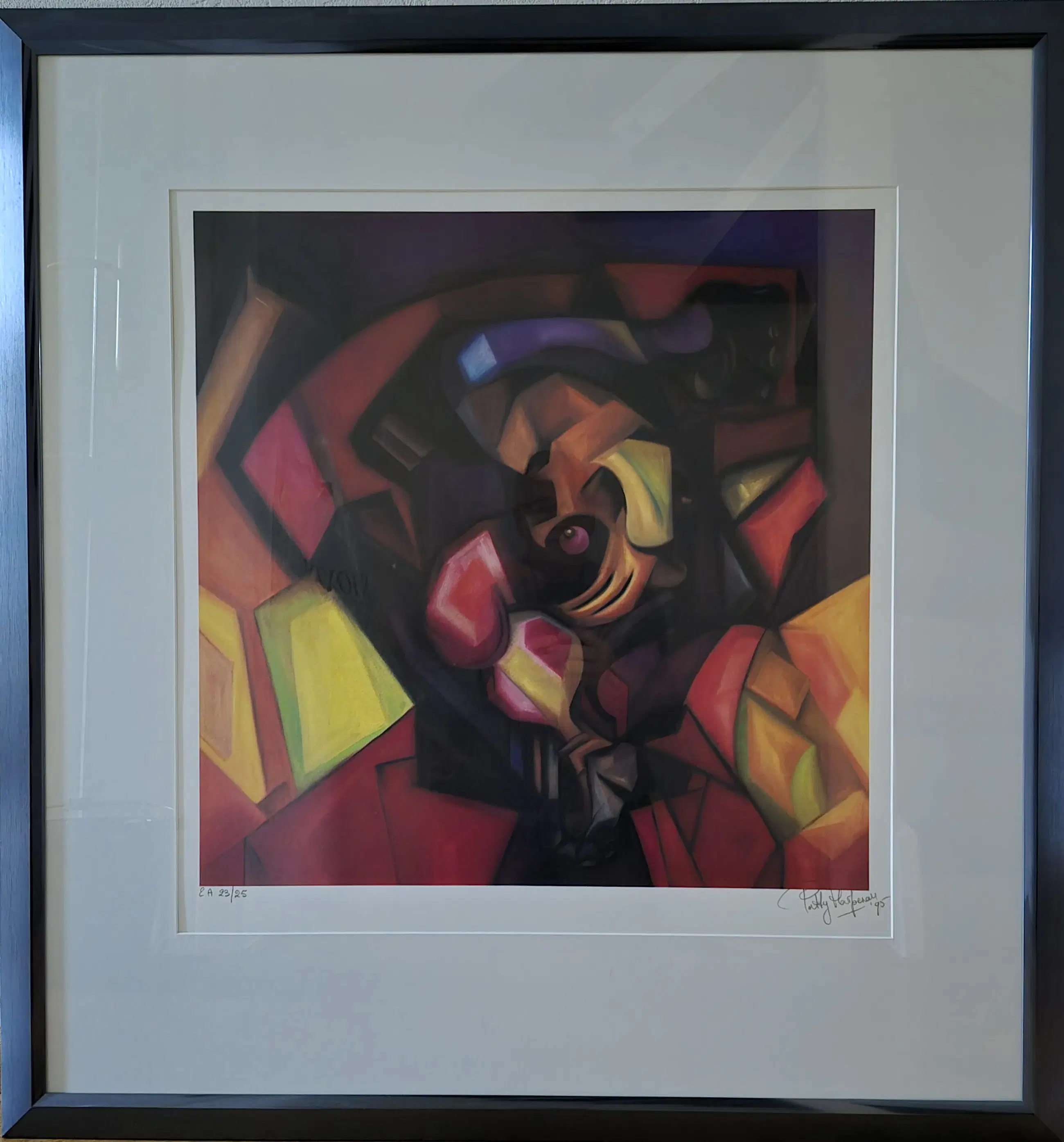 Originele zeefdruk van de bekende kunstenares Patty Harpenau, gesigneerd en voorzien van de aanduiding EA 23/25 (Épreuve d’Artiste). Dit betekent dat het een artist proof is uit een zeer kleine oplage van slechts 25 stuks, wat dit werk zeldzamer maakt dan de reguliere genummerde edities. Het kunstwerk meet circa 90×95 cm en kenmerkt zich door krachtige geometrische vormen en warme kleurcontrasten, geheel in Harpenau's herkenbare abstracte stijl. De zeefdruk verkeert in uitstekende staat: het papier is strak, schoon en vertoont geen verkleuringen. Het geheel is professioneel ingelijst in een stijlvolle donkerblauwe aluminium lijst met een glasplaat, die perfect aansluit bij de kleurstelling van het werk en zorgt voor een moderne, strakke uitstraling. Een ideaal kunstwerk voor liefhebbers van moderne abstracte kunst of voor wie een opvallend en kleurrijk accent zoekt voor thuis of op kantoor.