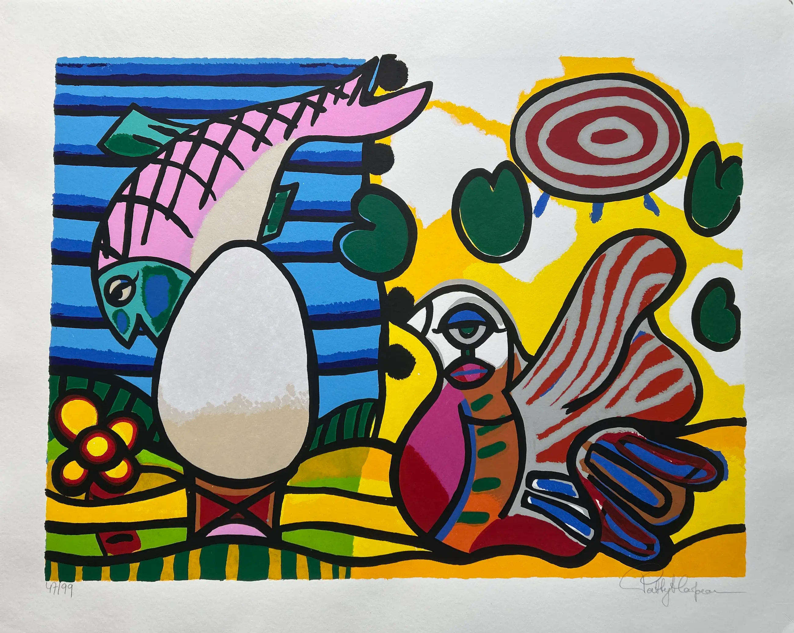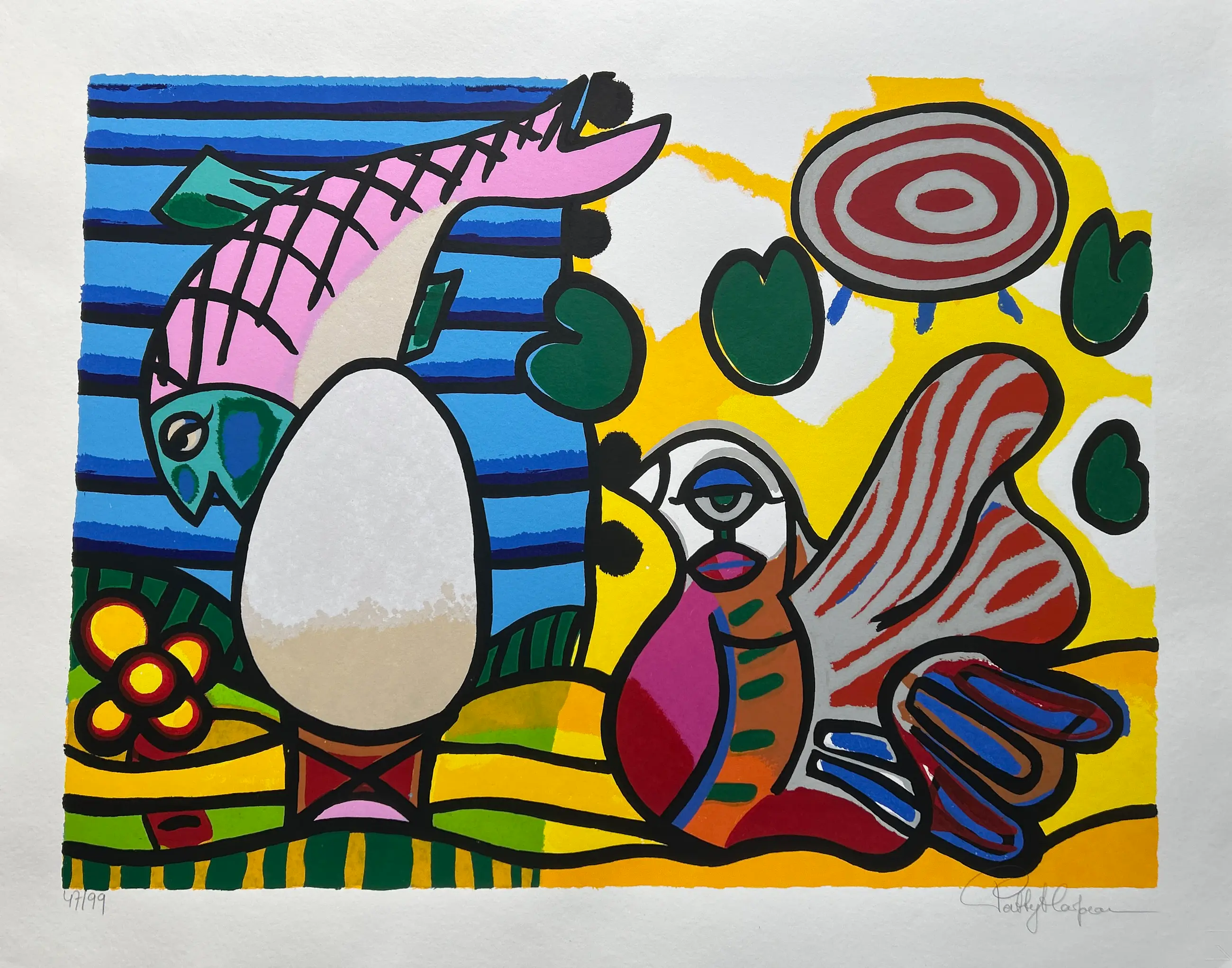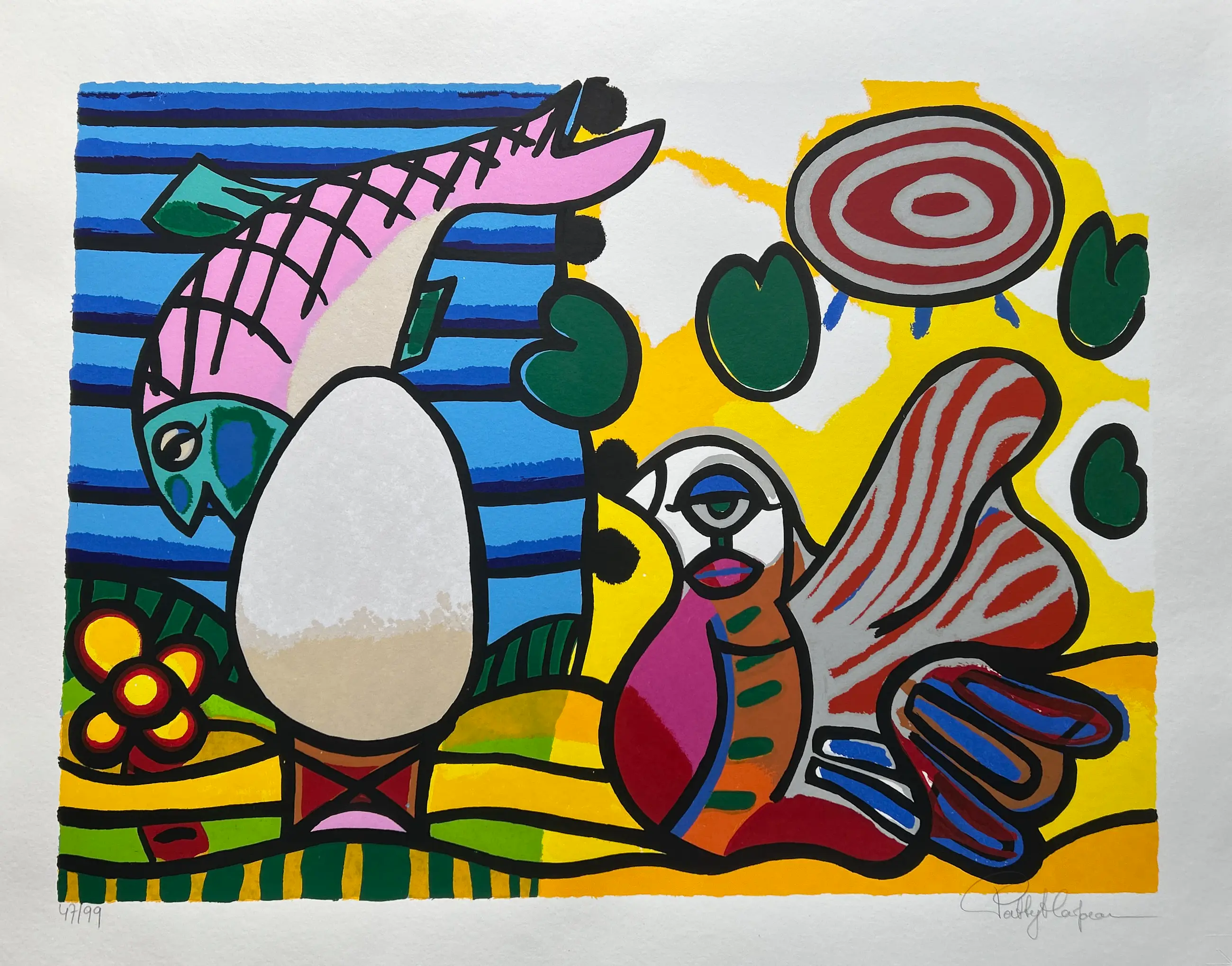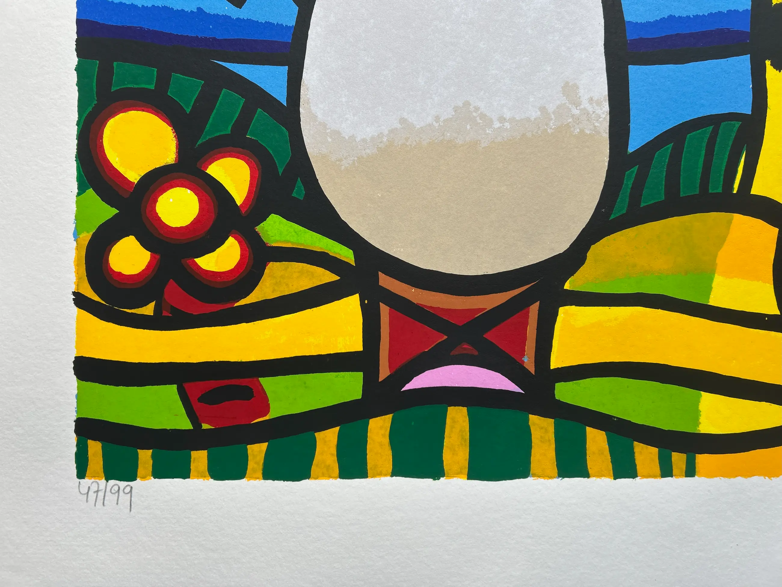Conditie: uitstekend. Rand vel heeft licht deukje en scheurtje 1 cm, zie foto. Oplage: 47/99. Afmeting: afbeelding 61 x 80 cm. Wordt zorgvuldig verpakt en verzekerd verzonden.