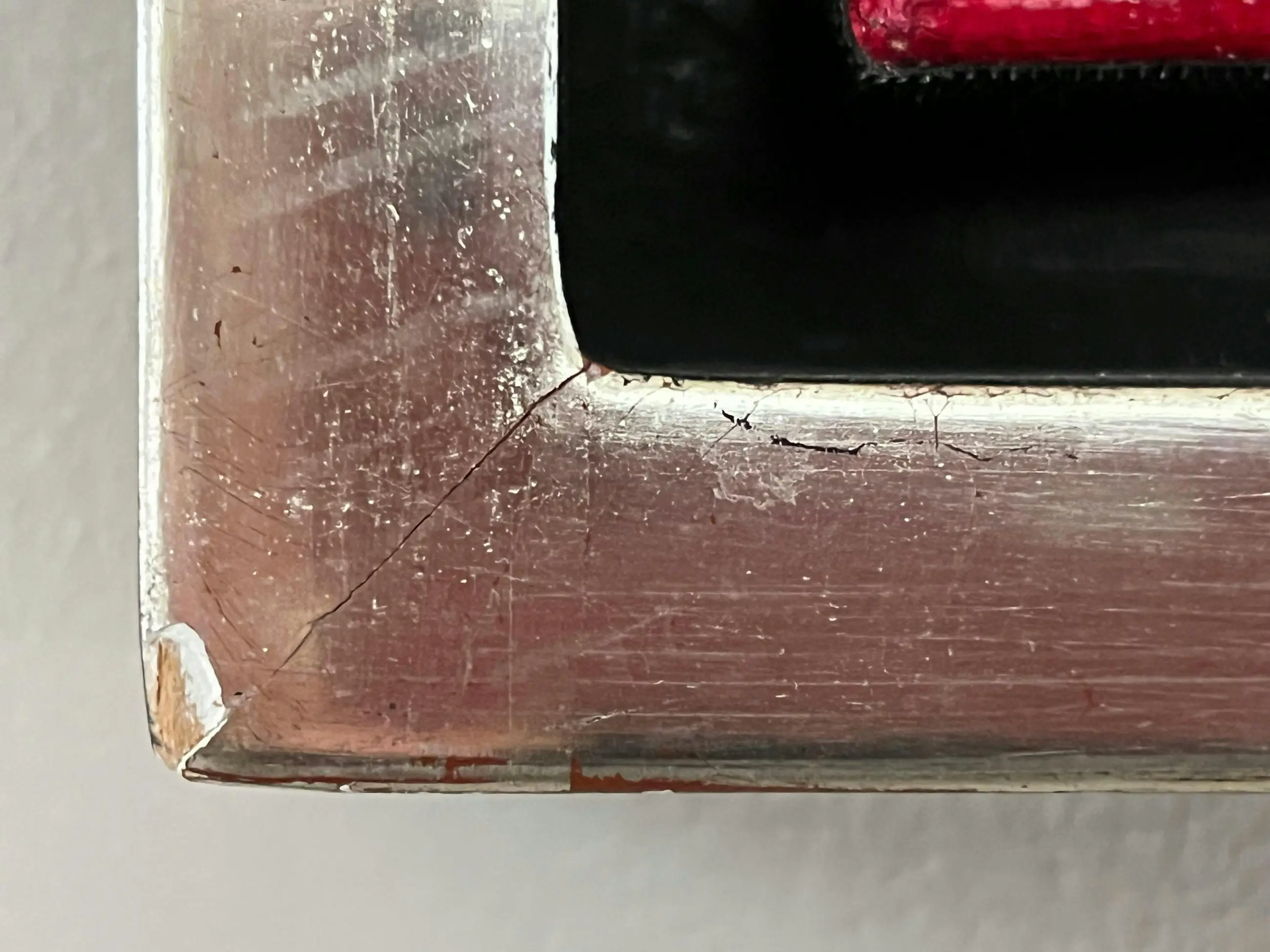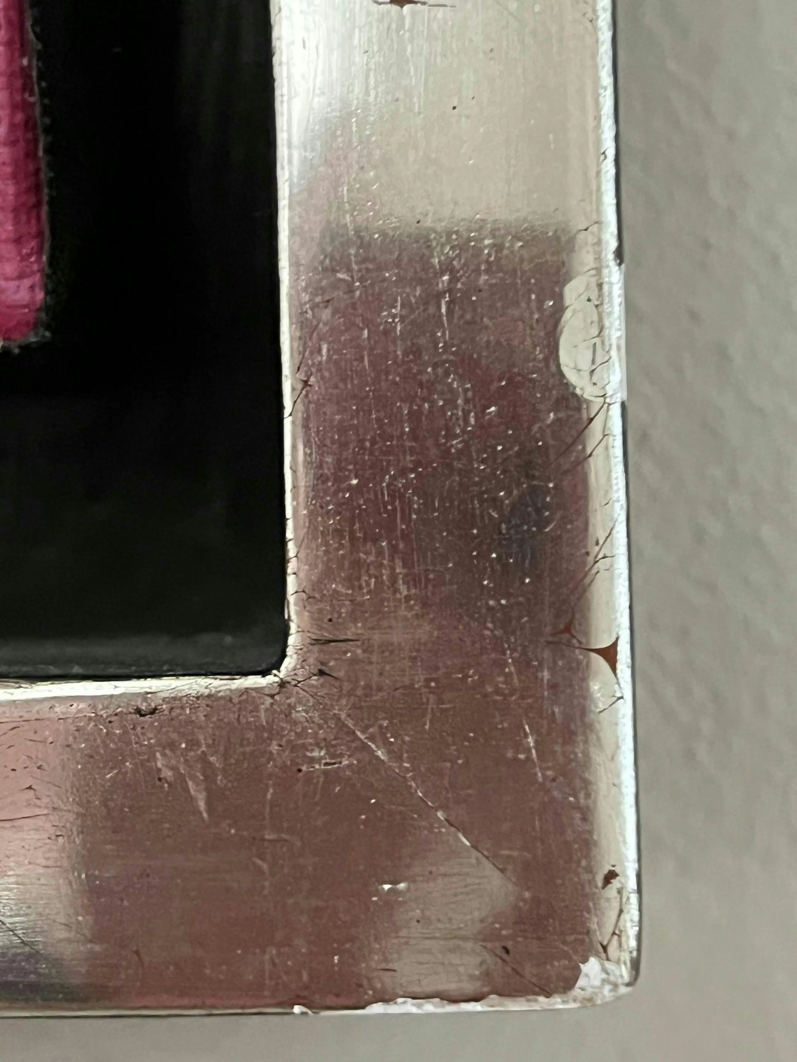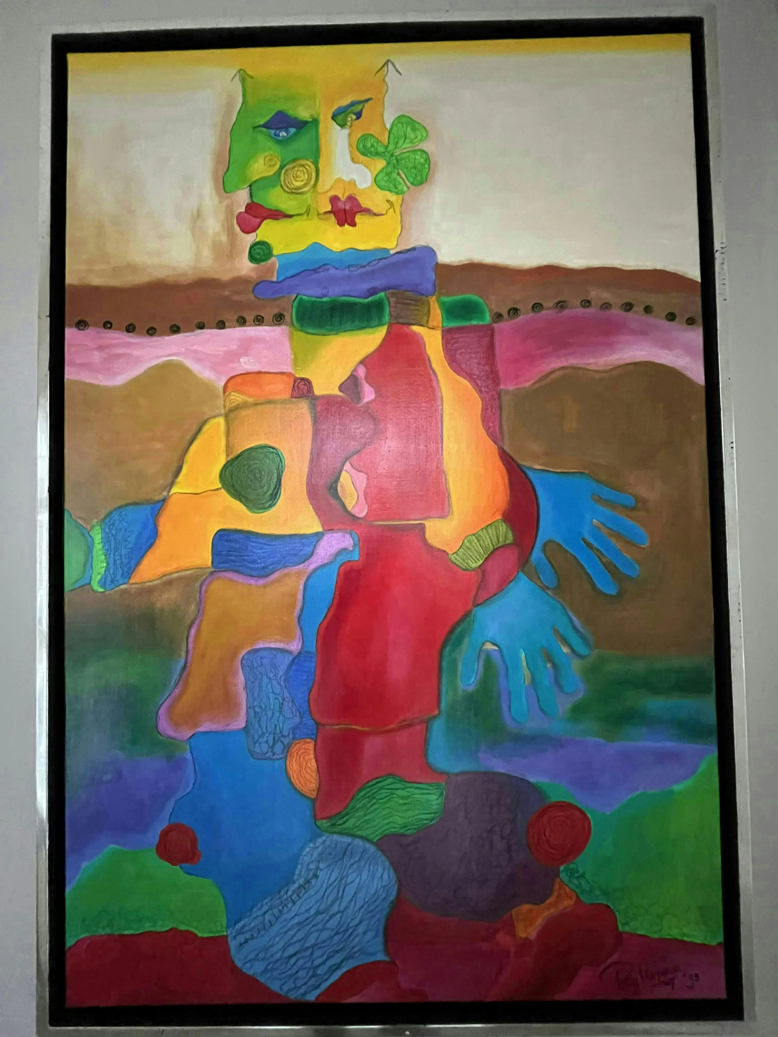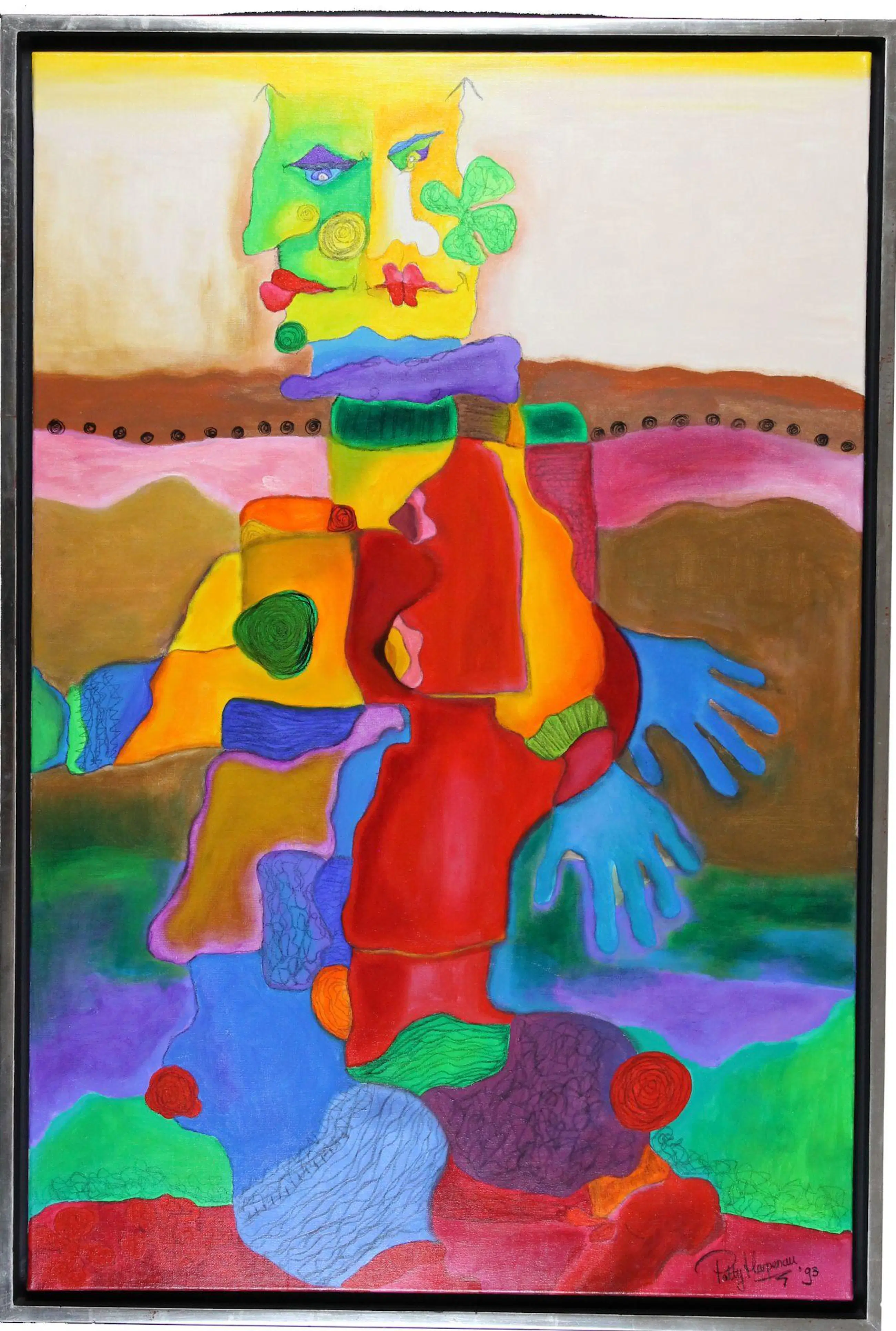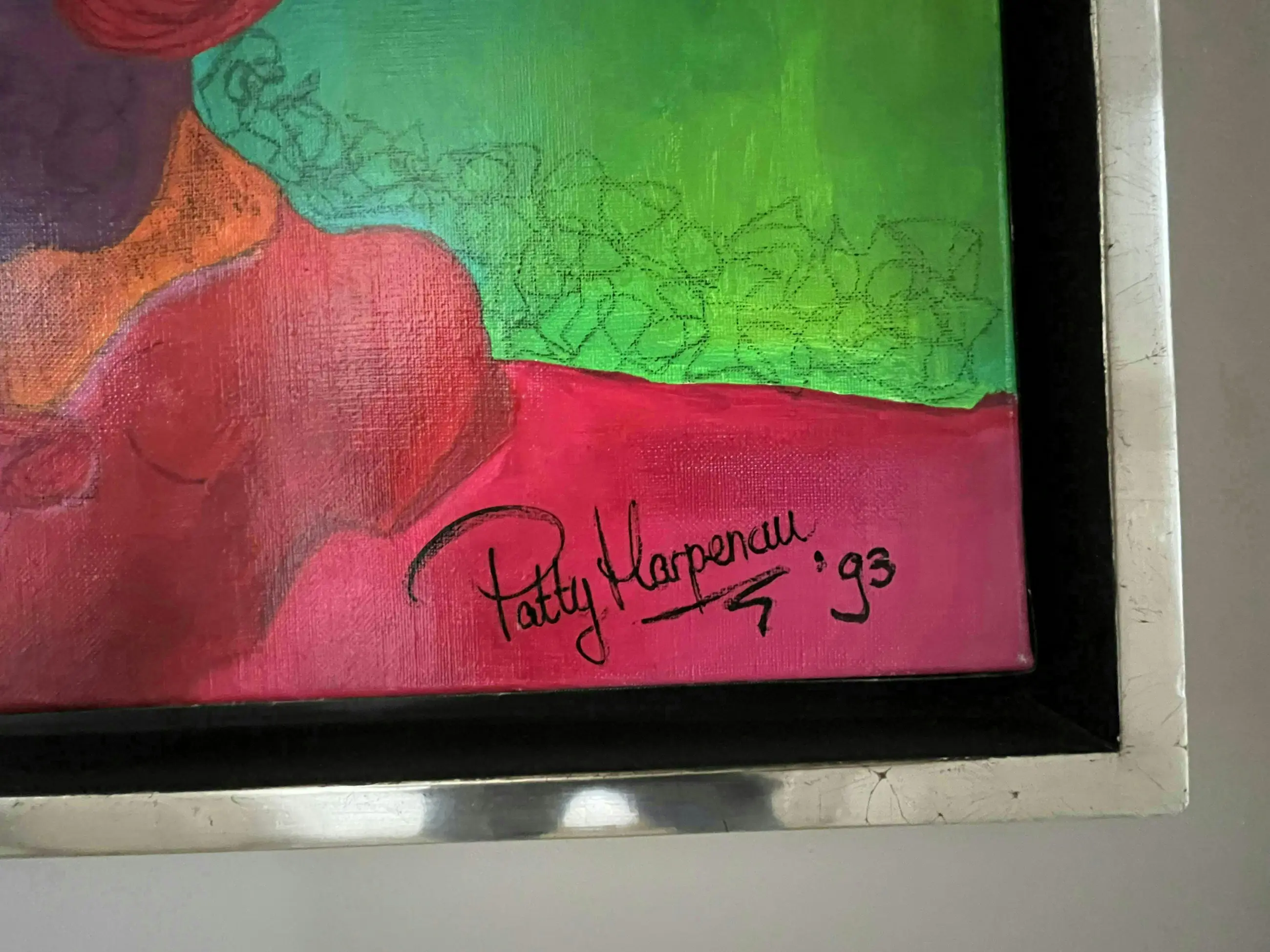 Kleurrijk origineel schilderij uit 1993. Originele werken op doek worden zelden aangeboden. Het werk is gelijst in zilverkleurige houten baklijst. (Lichte gebruikssporen)