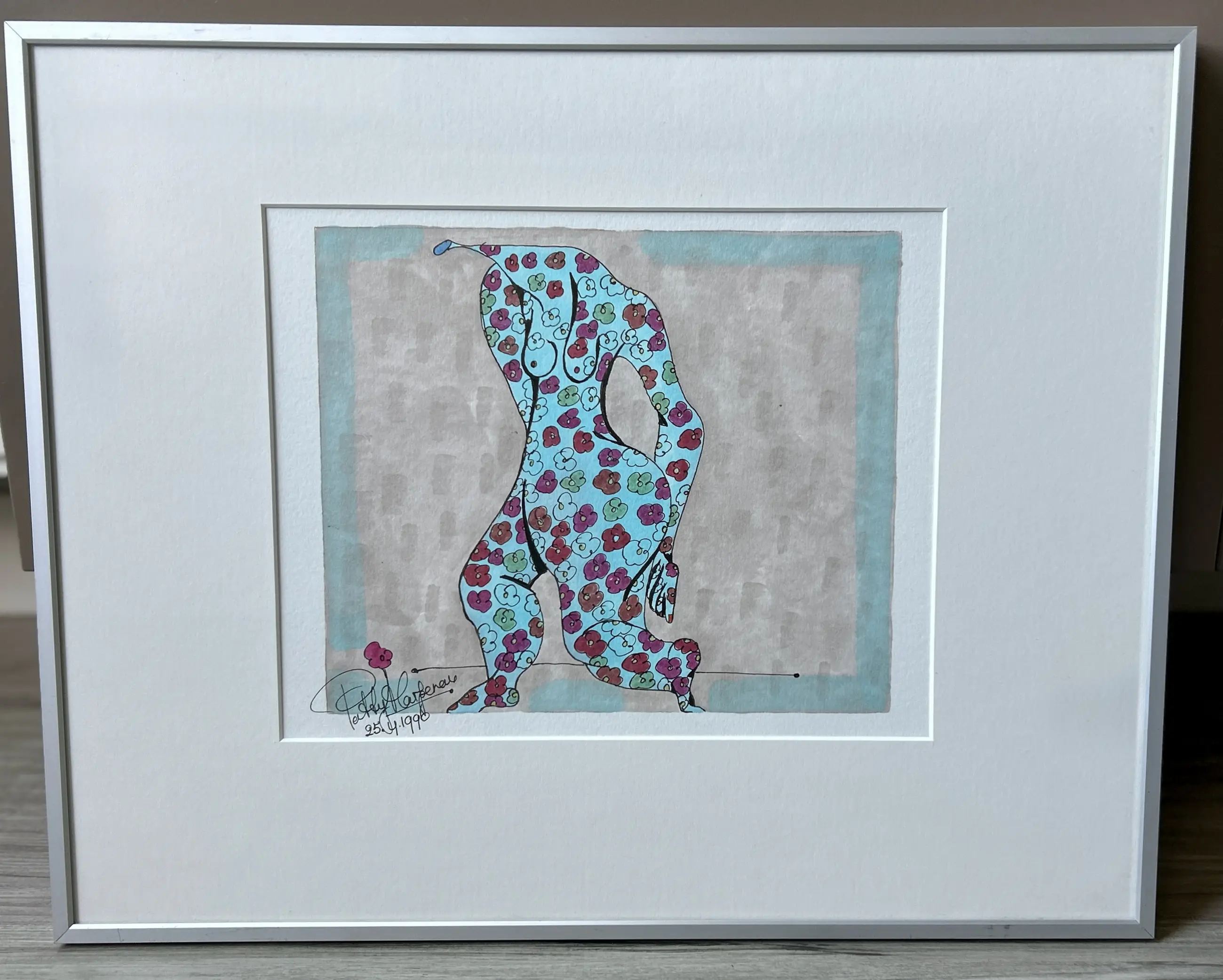 Conditie: zeer goed. Jaar: 25-4-1996. Ingelijst in een zilverkleurige lijst met licht gebruikssporen. Wordt zorgvuldig verpakt en verzekerd verzonden.