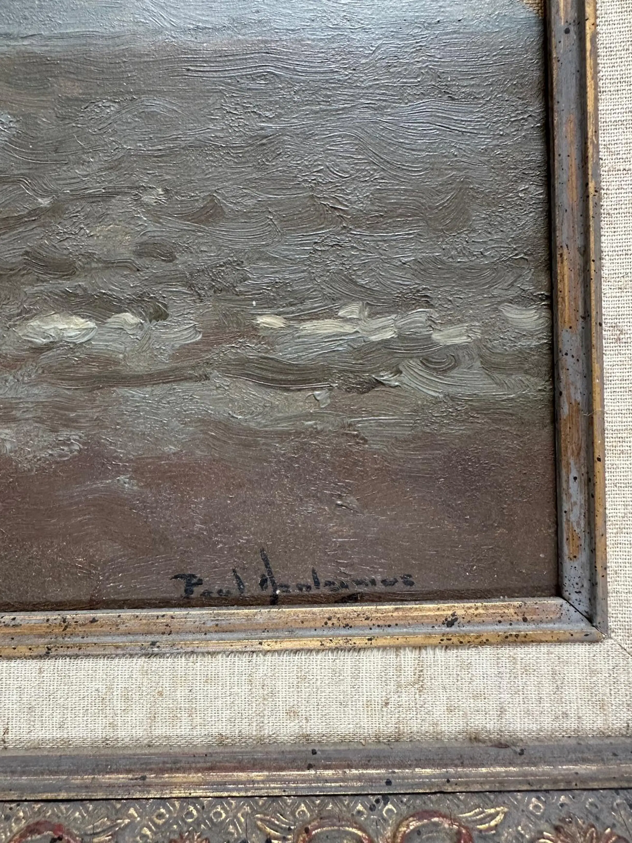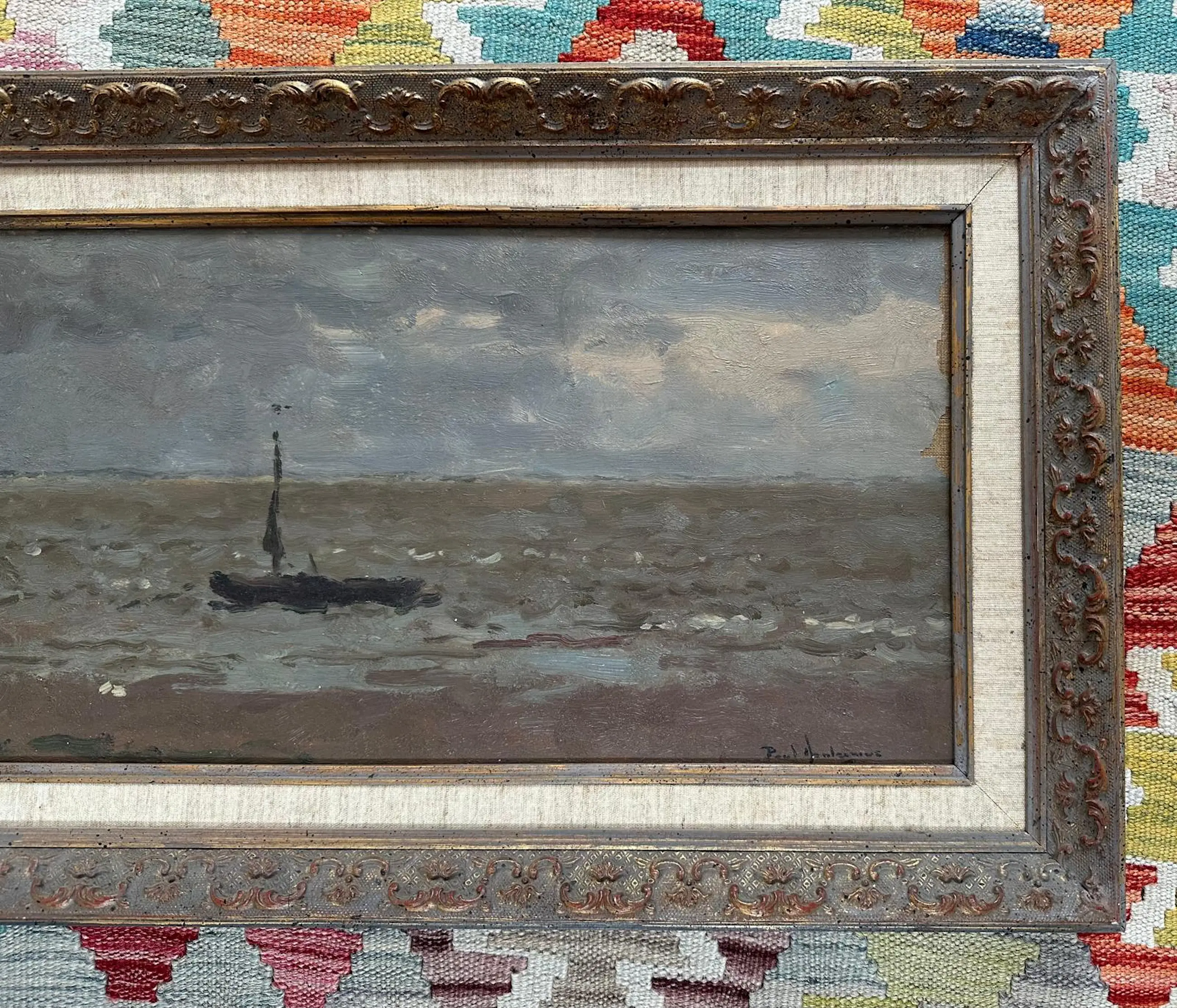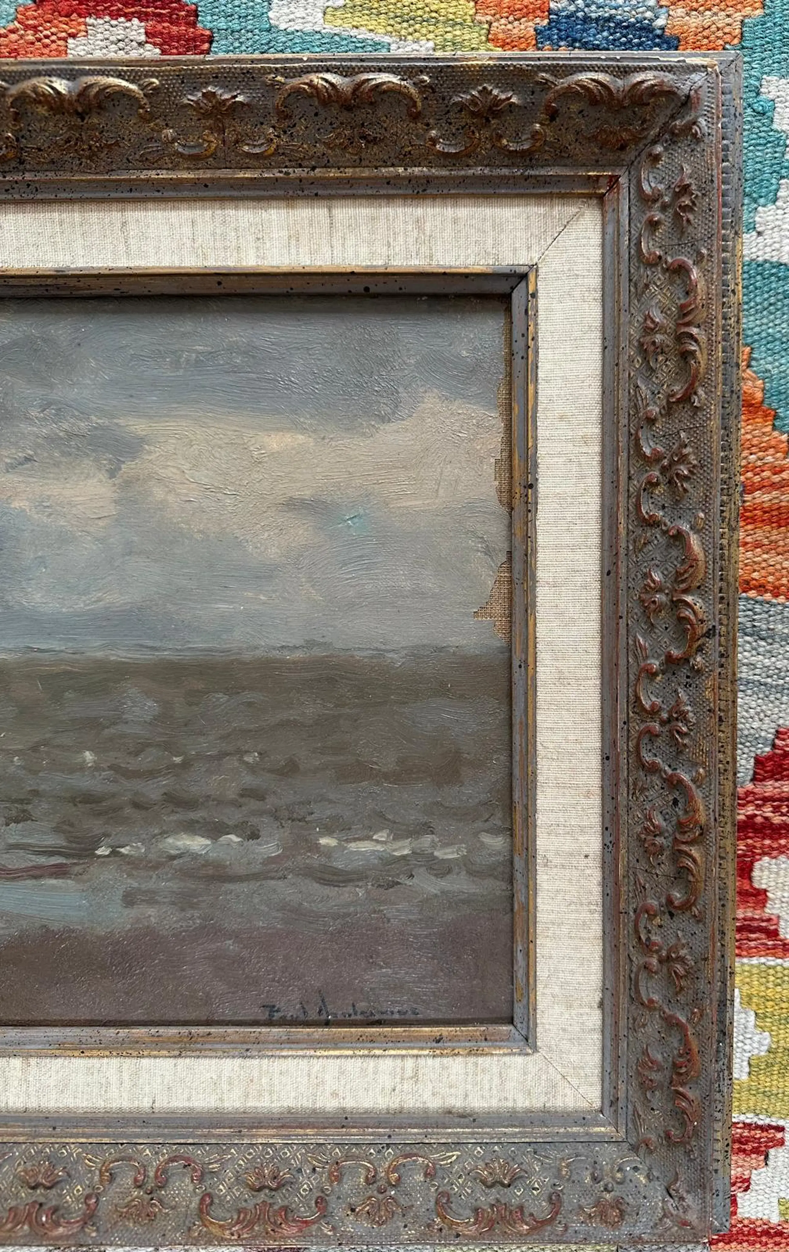 Aan de rechterkant van het schilderij is verfverlies te zien. Dit is helaas ontstaan bij het verhuizen. Vakkundig zou het gecamoufleerd kunnen worden door een passe partout, waarbij de signatuur zichtbaar blijkt. Uiteraard verdisconteerd in de prijs.