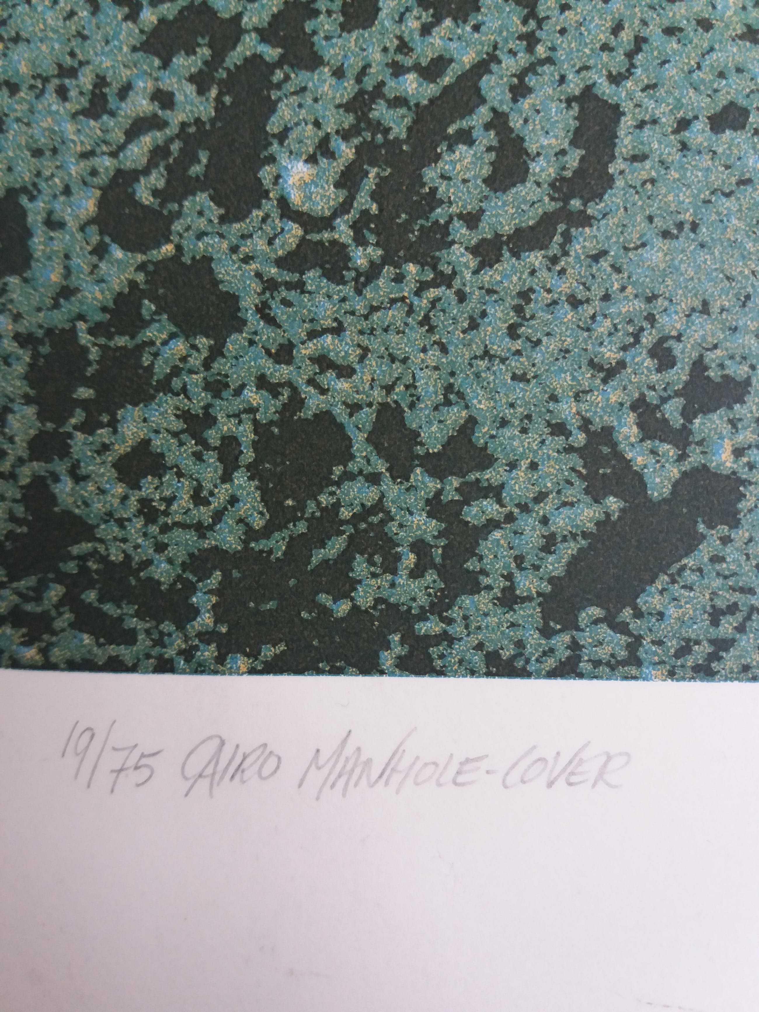 “Manholes/Handholes” (putdeksels). De zeefdruk Airo Manhole-cover is één uit een serie van 12.