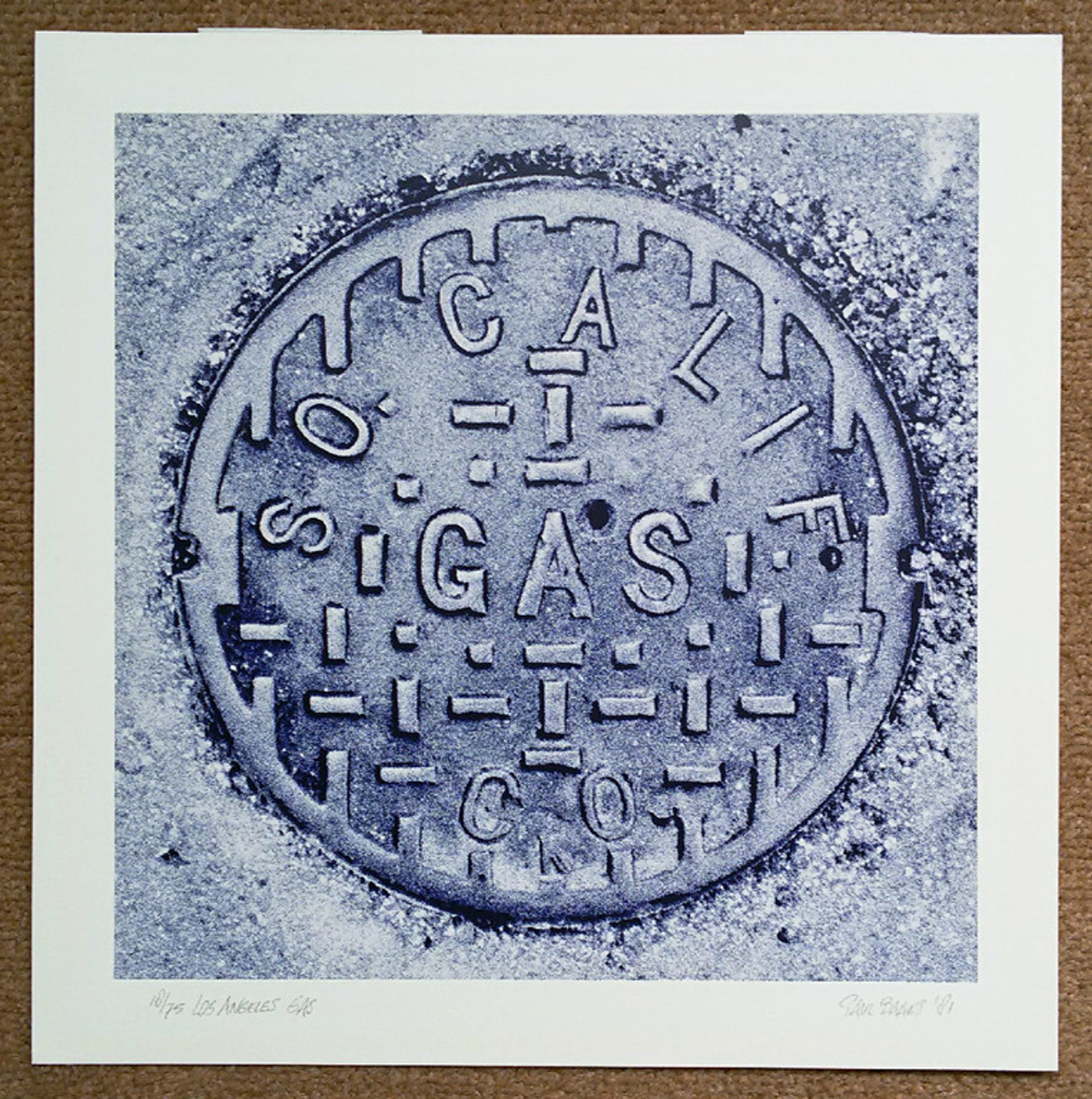 Leuk concept van Paul Baars dat aan mijn asperge syndroom appelleert (door mijzelf gediagnosticeerd ;-); verzamel alle putdeksels ter wereld. Zeefdruk op papier, met potlood gesigneerd, gedateerd (‘81), genummerd (18/75) en getiteld. Afkomstig uit de kunstcollectie van ABNAMRO; in goede conditie.