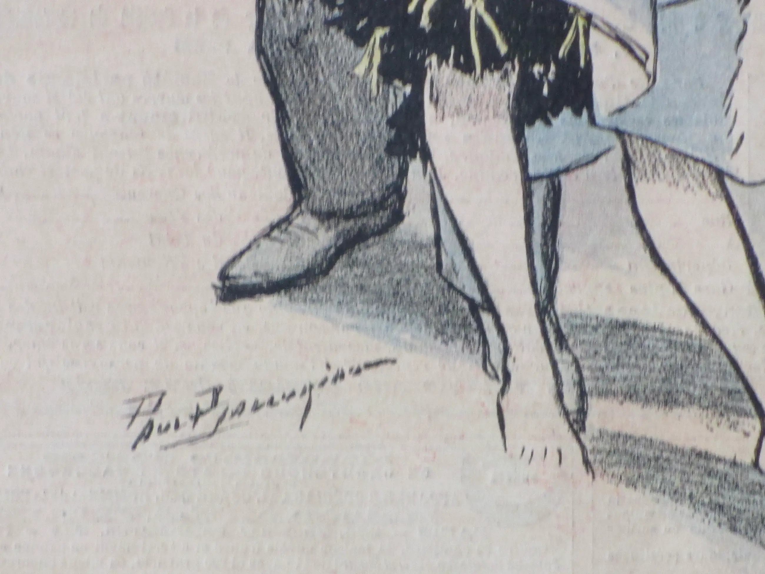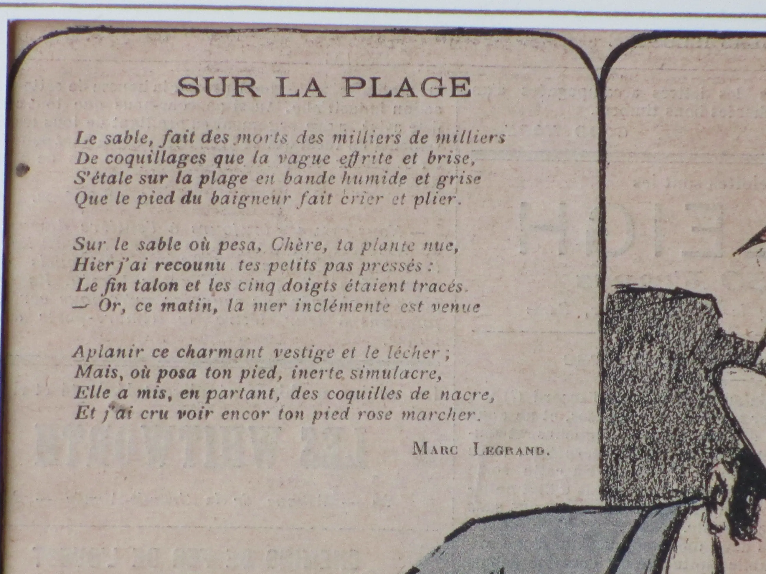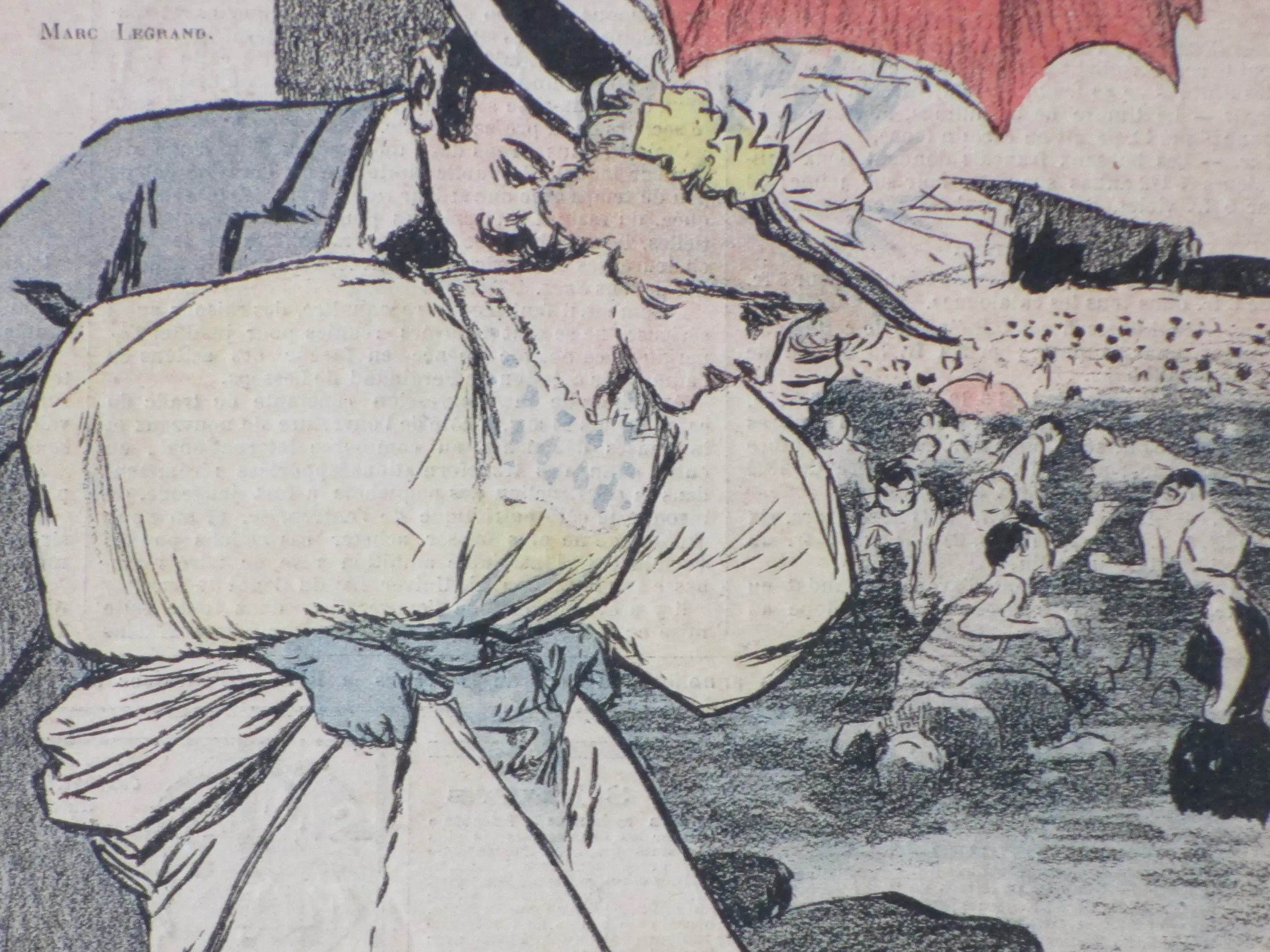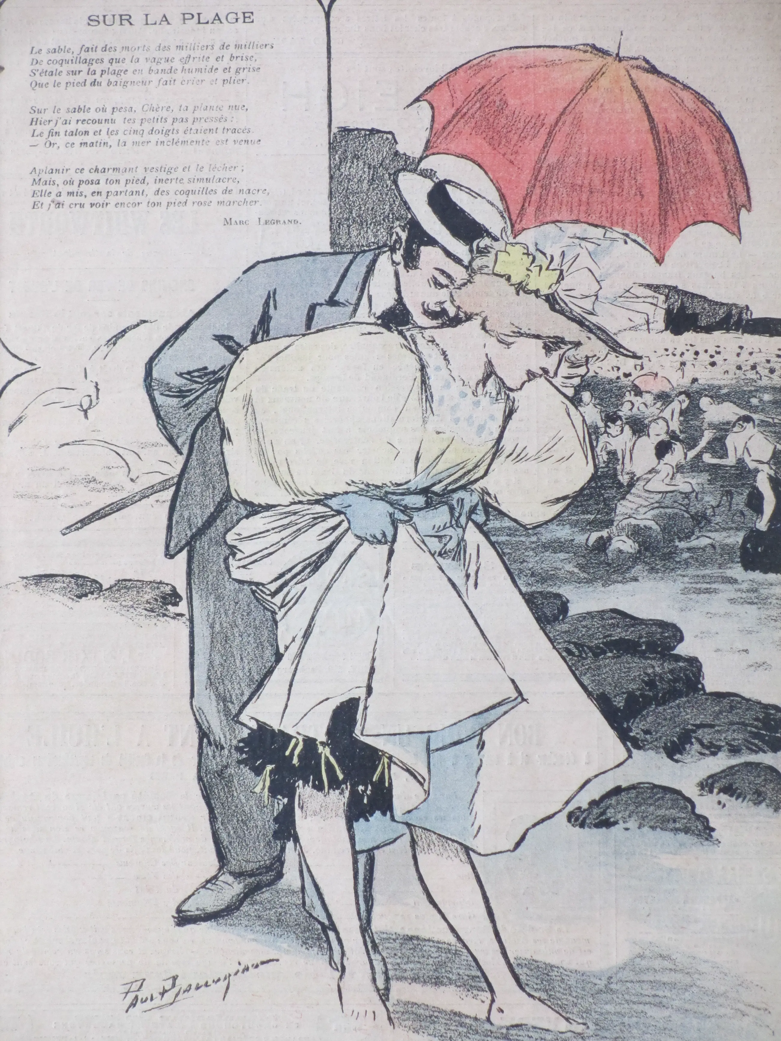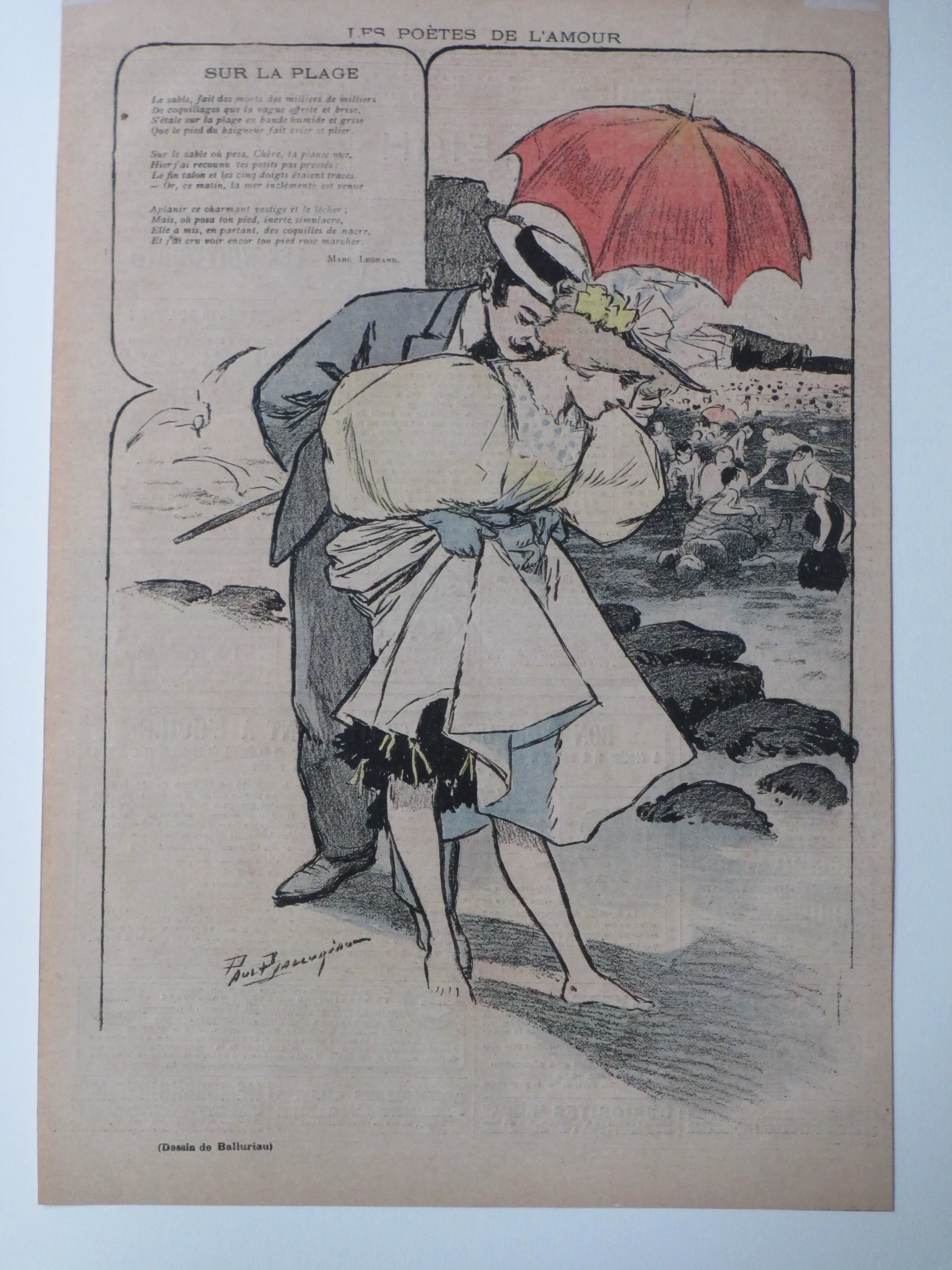 Kleurenlitho door Paul Balluriau Voorstelling van een amoureus koppel op het strand Losbladig onder passepartout, beeldmaat 30x22, bladmaat 37x26, p.p.maat 48x32 Gesigneerd in de druk l.o.: 'Paul Balluriau' Gedicht 'Sur la Plage' van Marc Legrand Herkomst: Gil-Blas 1896 Authenticiteit volledig gegarandeerd