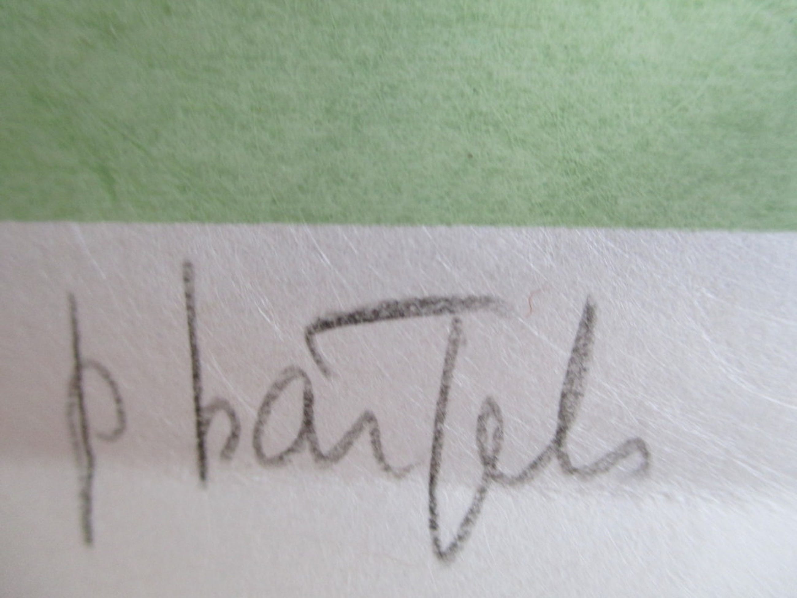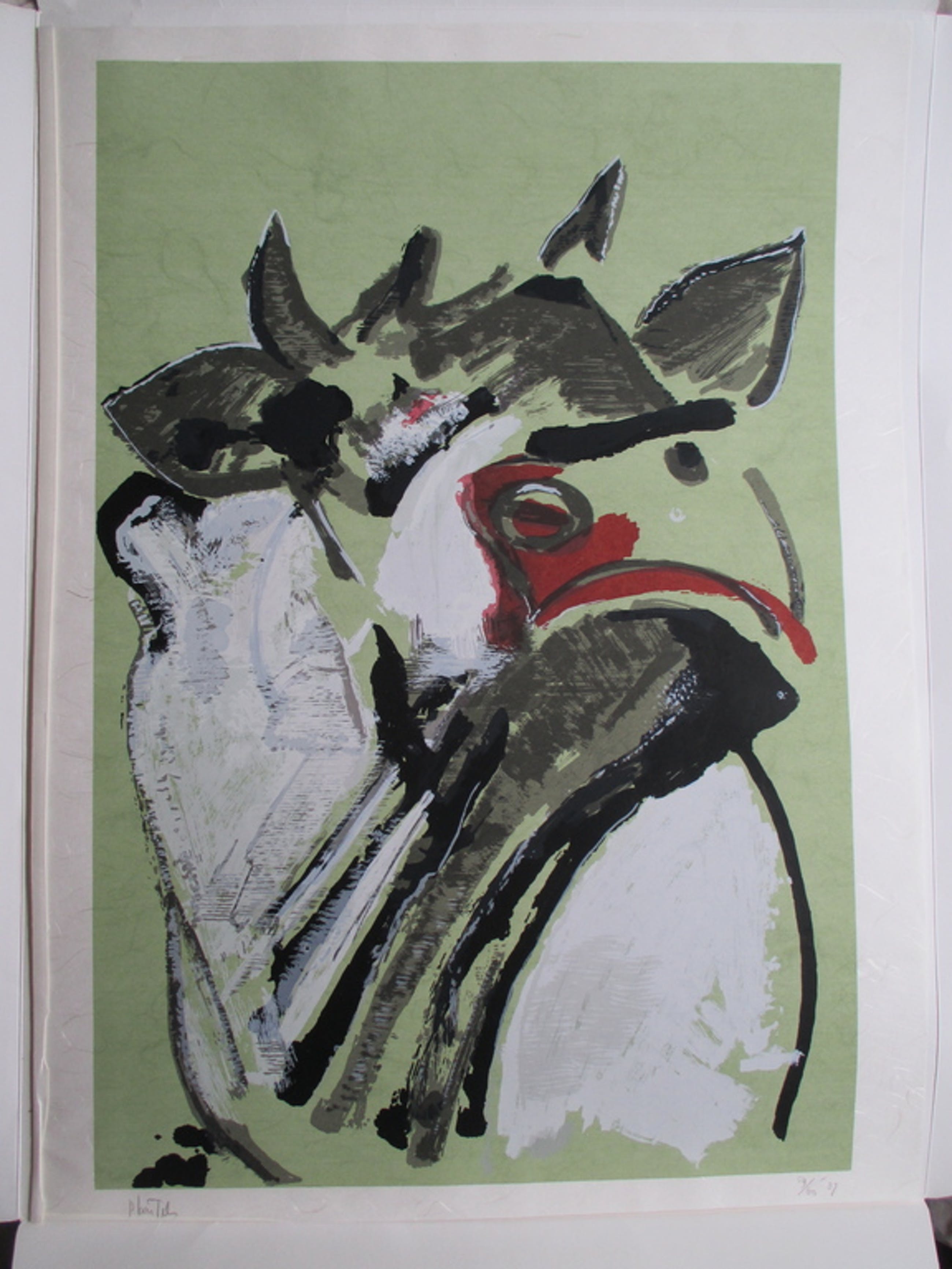 Map met twee zeefdrukken van Paul Bartels (1942-) uit 1987 uit de serie getiteld "Stiertjes of de zonen van St. Lukas". Beide gesigneerd in potlood en genummerd 59/60. Afmetingen blad(en): 60x80 cm. Het papier is een soort dun rijstachtig papier met vezels, zie de detailfoto's. In goede staat, sommige randen (in de marge) zijn gevouwen, zie foto's