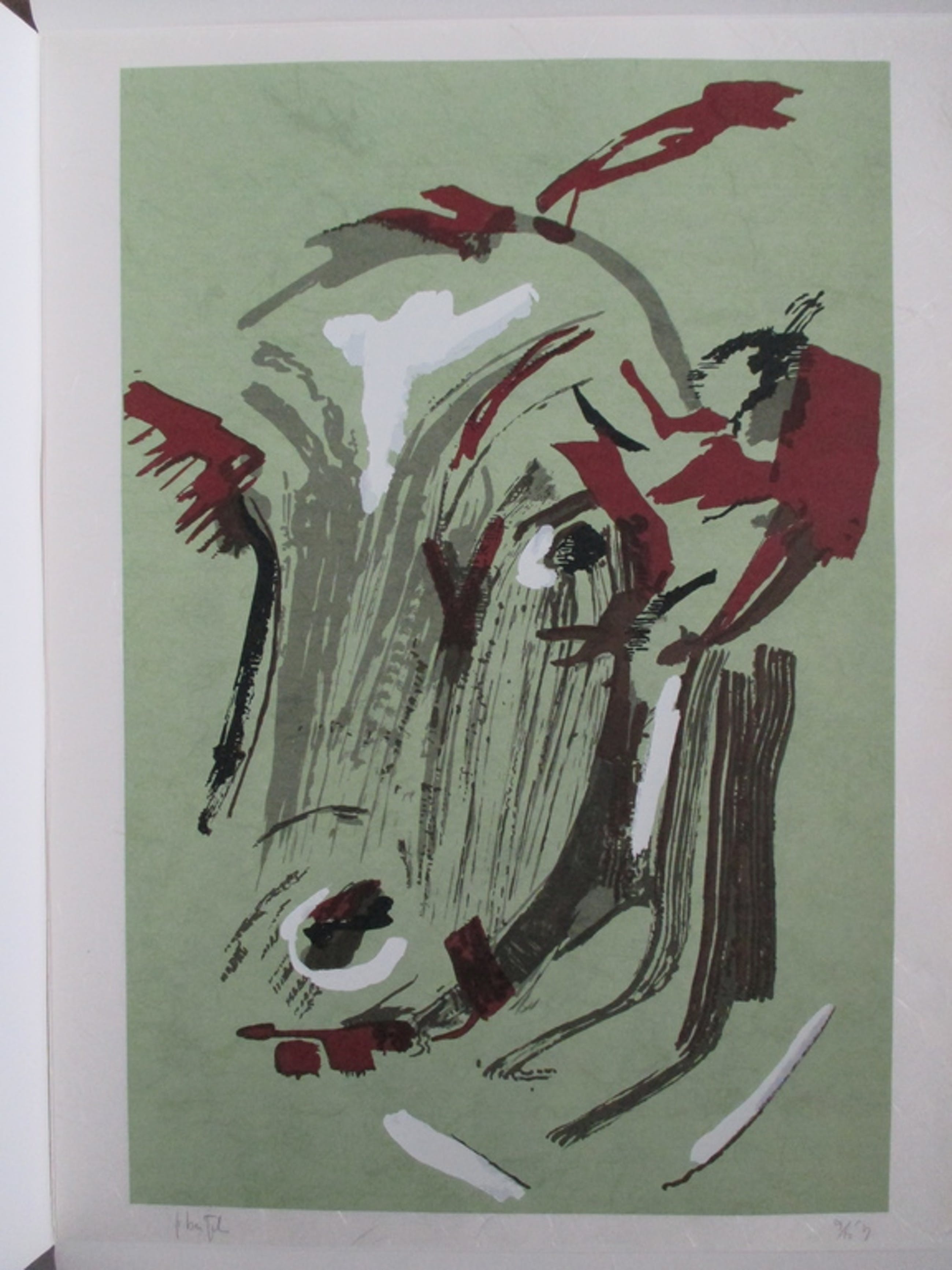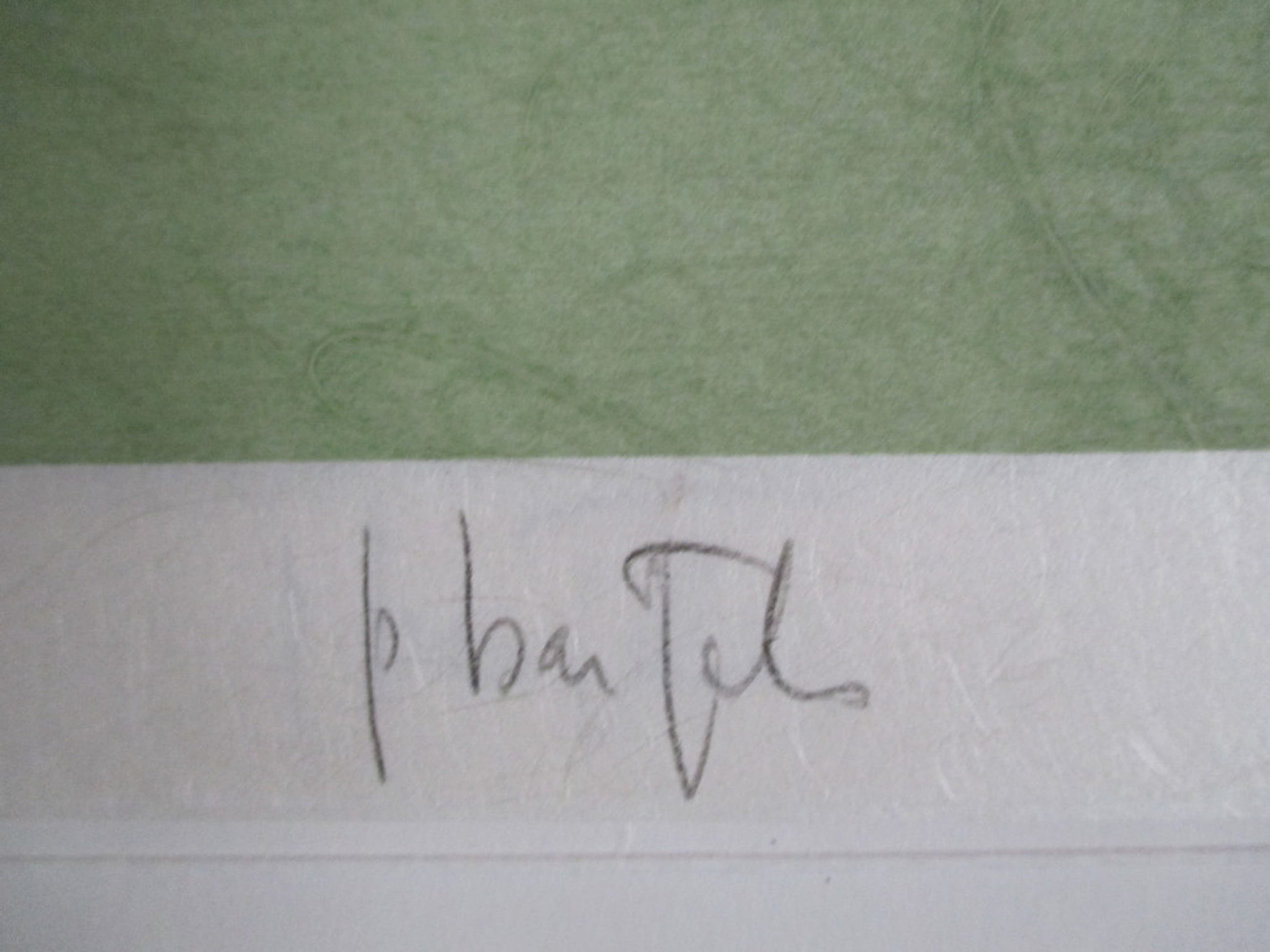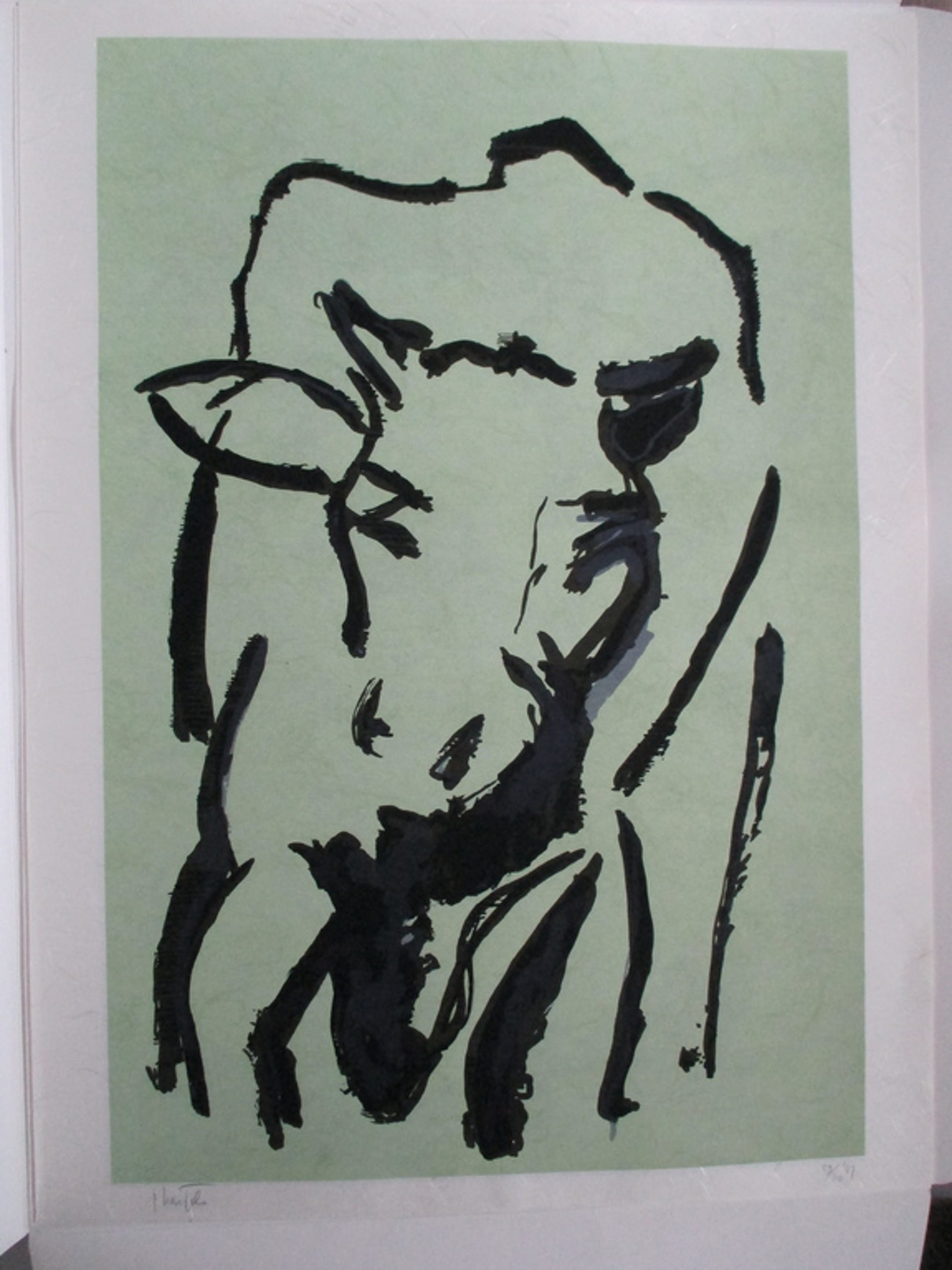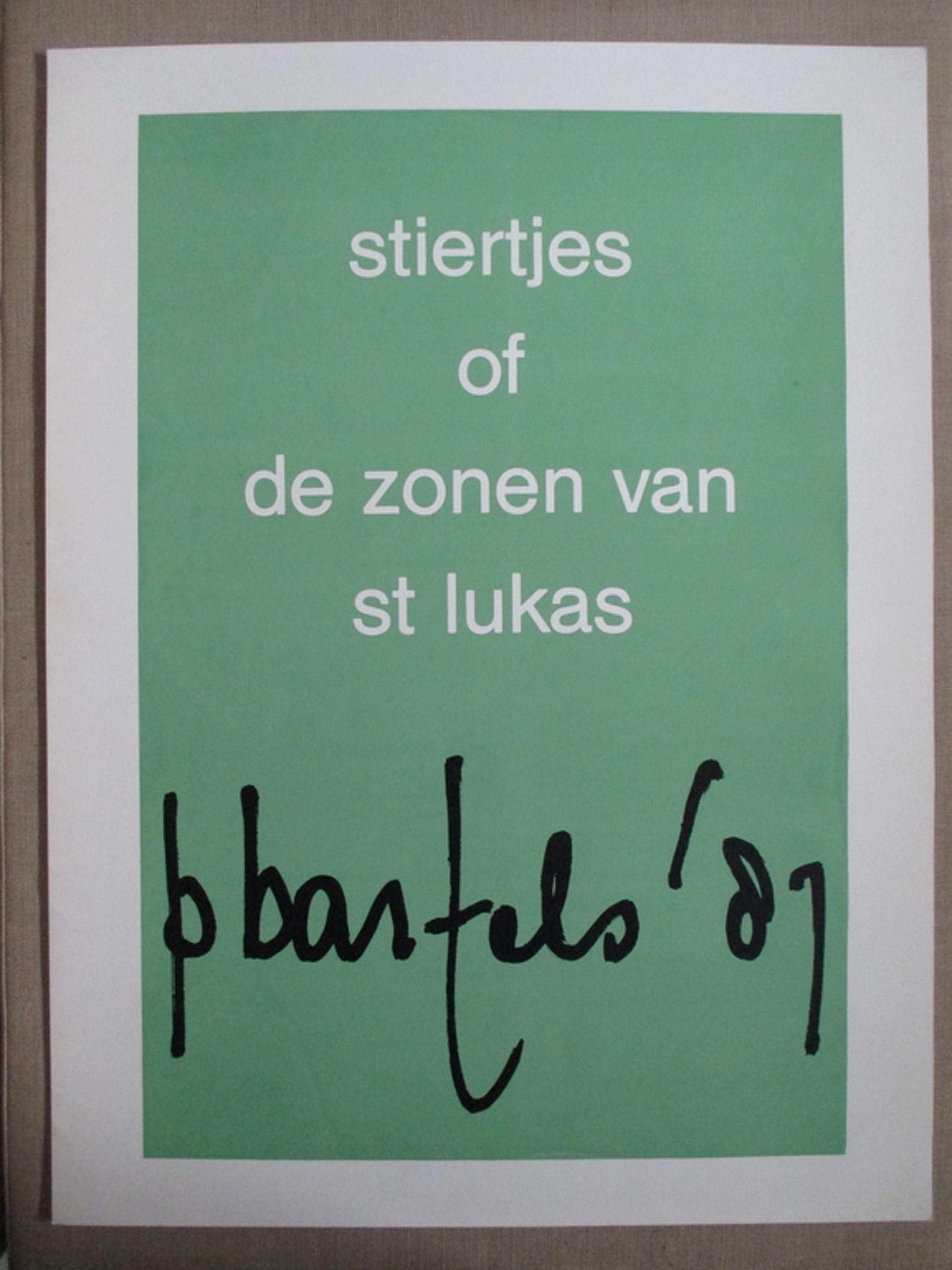 Map met drie zeefdrukken van Paul Bartels (1942-) uit 1987 uit de serie getiteld "Stiertjes of de zonen van St. Lukas". Alle gesigneerd in potlood en genummerd 59/60. Afmetingen blad(en): 60x80 cm. Het papier is een soort dun rijstachtig papier met vezels, zie de detailfoto's. In zeer goede staat.
