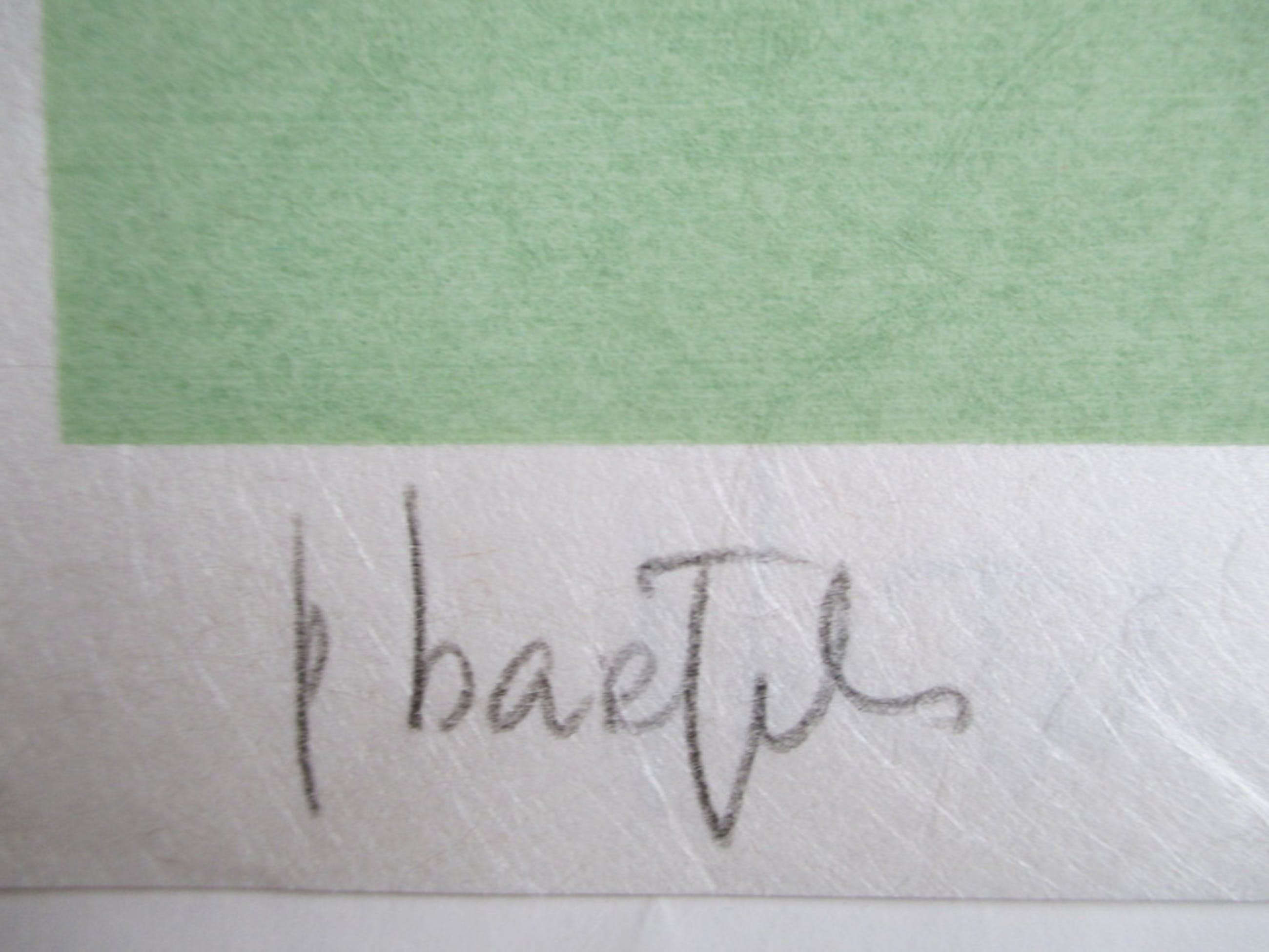 Map met drie zeefdrukken van Paul Bartels (1942-) uit 1987 getiteld "Stiertjes of de zonen van St. Lukas". Allen gesigneerd in potlood en genummerd 59/60. Het papier is een soort dun rijstachtig papier met vezels, zie de detailfoto's. In perfecte staat, alleen op de derde zitten vlekjes linksboven in de marge, zie foto 6.