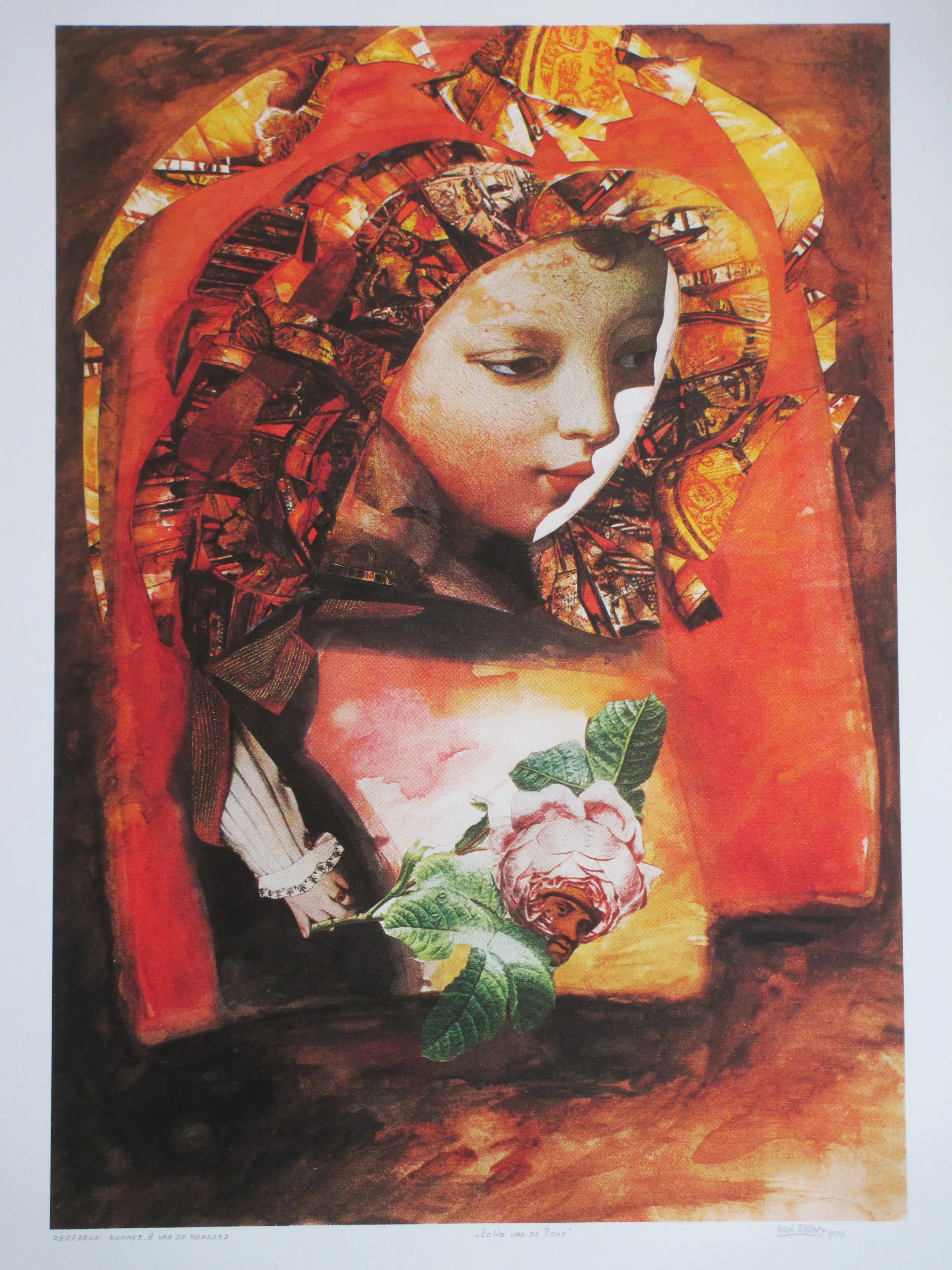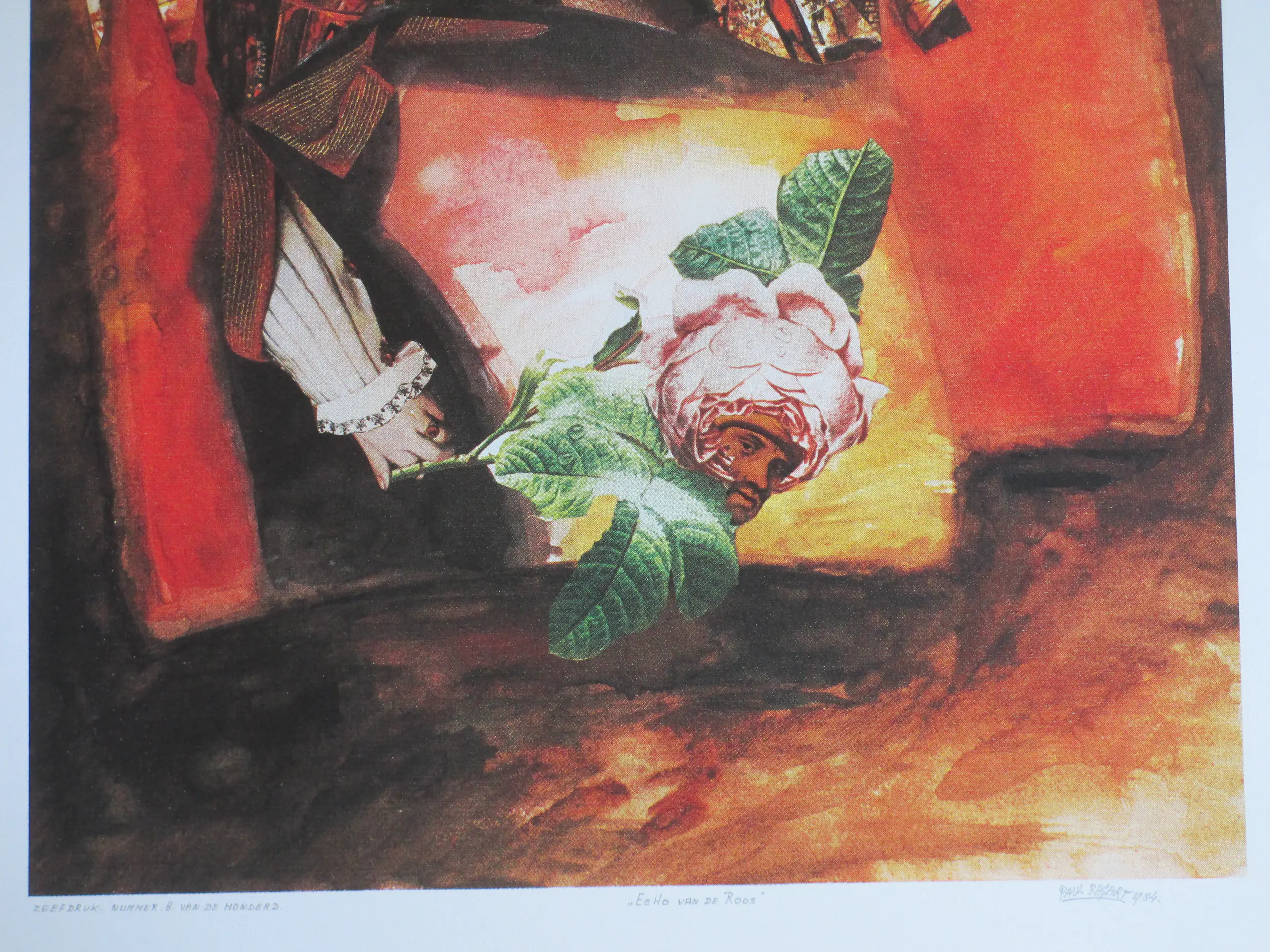 Zeefdruk door Paul Basart Voorstelling getiteld: 'Echo van de Roos' Losbladig, beeldmaat 57x40, bladmaat 69,5x50 Gesigneerd en gedateerd in potlood r.o.: 'Paul Basart 1984' Getiteld in potlood m.o.: "Echo van de Roos" Genummerd in potlood l.o.: 'nummer 8 van de honderd' Authenticiteit volledig gegarandeerd