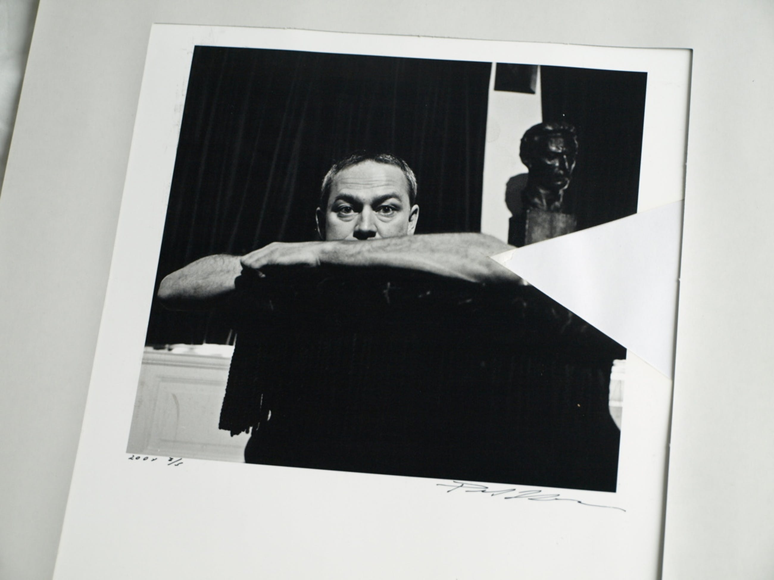De foto zit achter een papieren passe-partout en is door de kunstenaar ingeknipt waardoor er een inkeping is te zien aan de rechterrand van de foto.