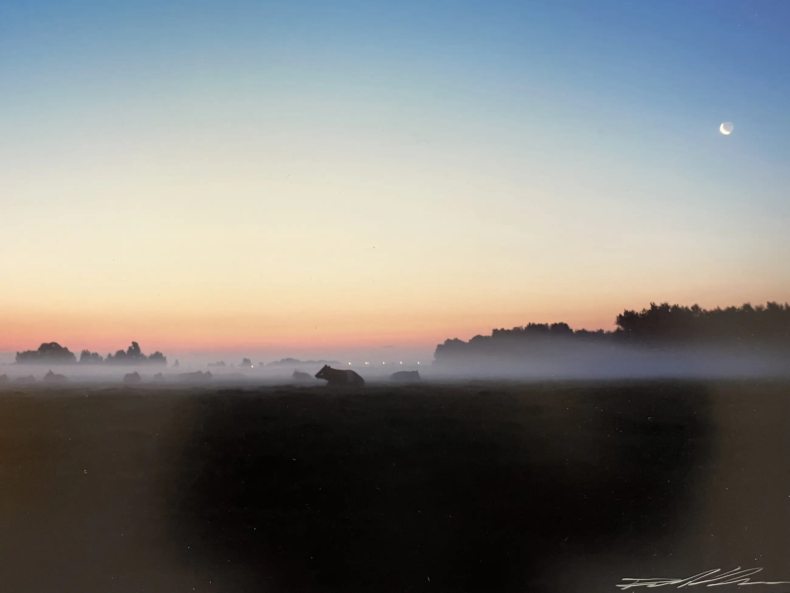 Bij de serie “Rondje Nederland” zien we een andere kant van Blanca. Voor deze serie reisde hij in 2010 door Nederland om speciale plaatsen vast te leggen. Op deze foto een sfeervol avondlandschap met liggende koeien. Gesigneerd met zilverpen. Afmeting fotoblad 30 x 42 cm. Afbeelding 25 x 38 cm.