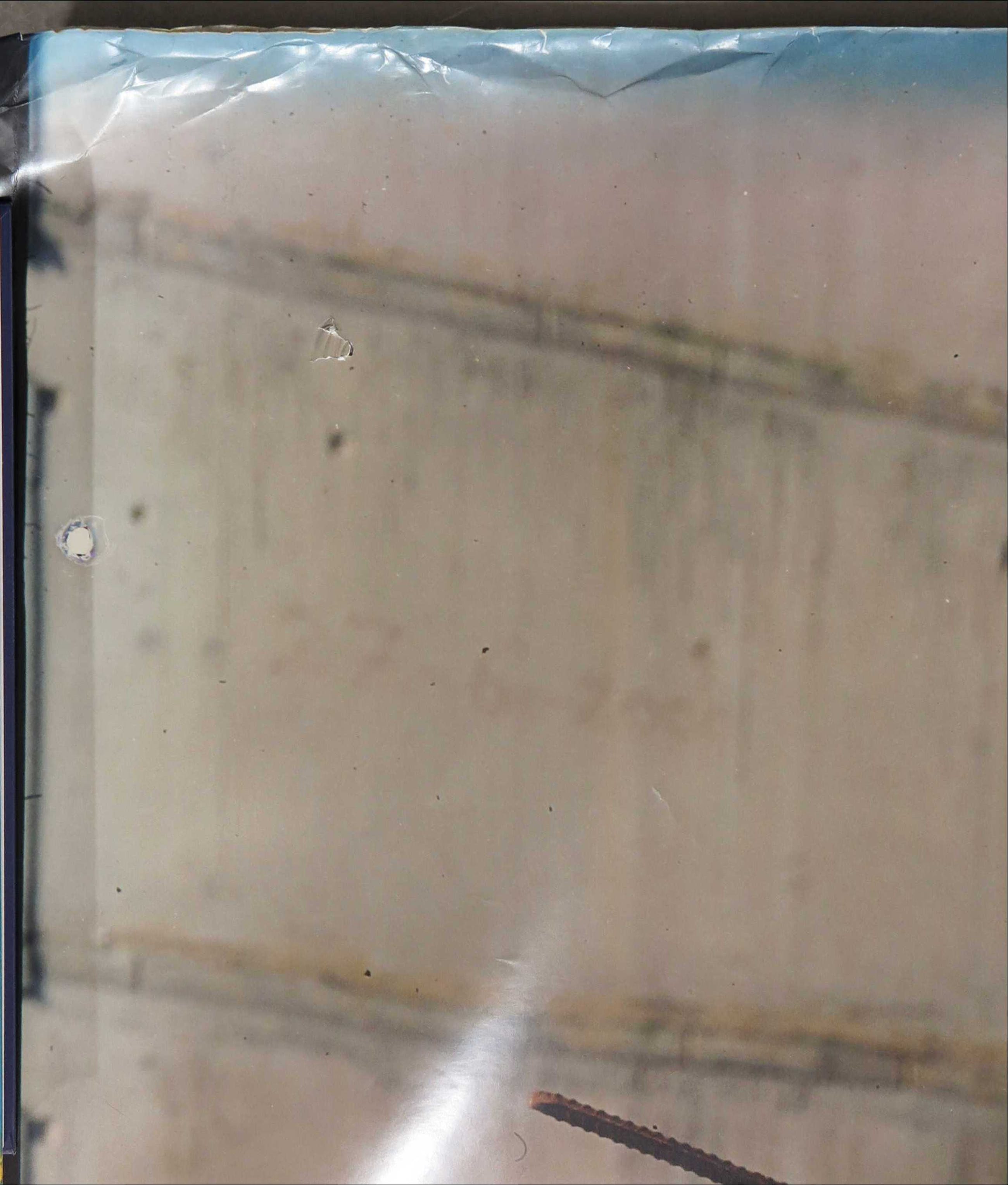 | Dit zeer grote is opgerold (bewaard geweest), en blijft daardoor niet plat liggen of hangen. Er zitten een aantal lichte vouwen/knikjes in het fotopapier. In de hoek linksboven zit een kleine beschadiging in het papier. | |