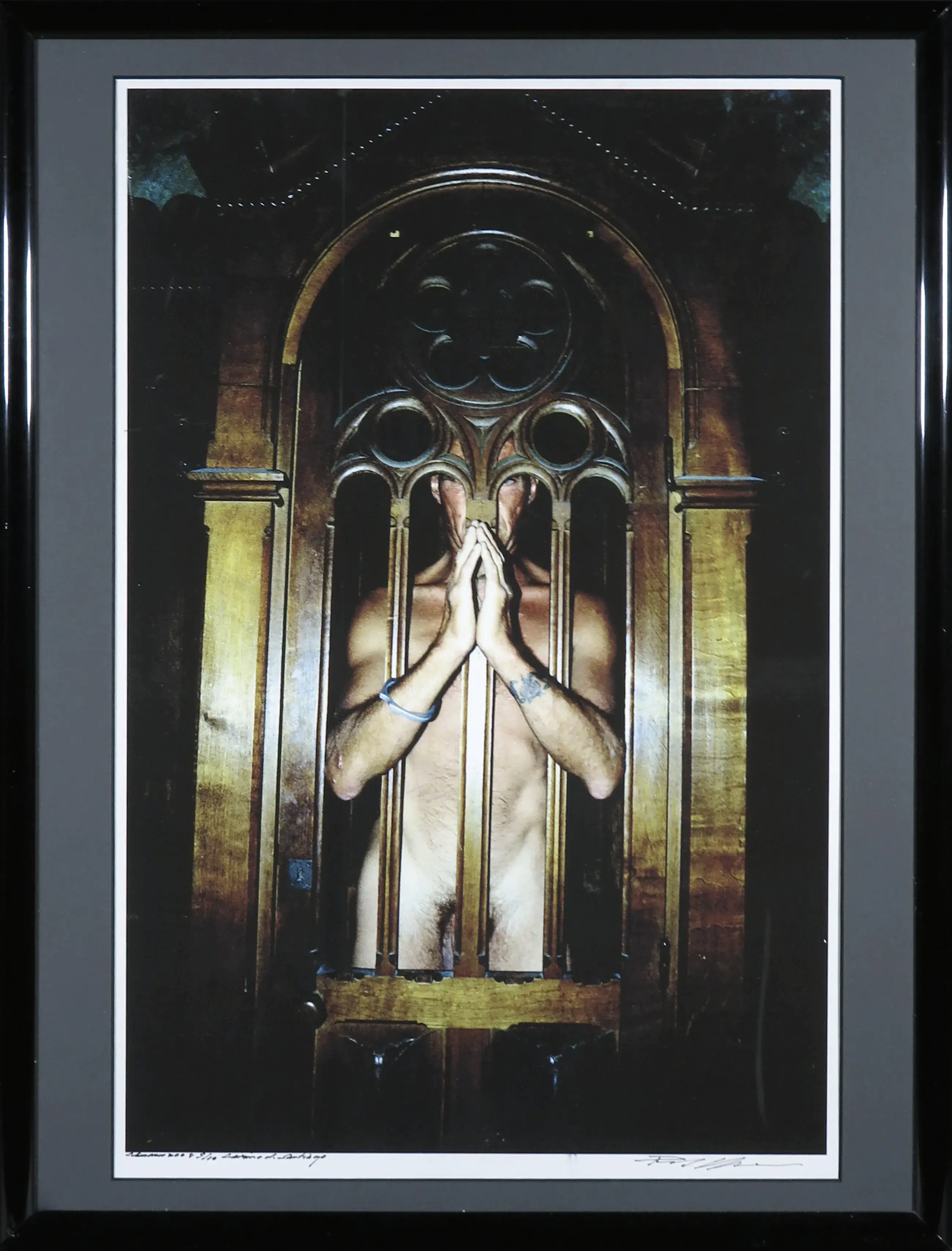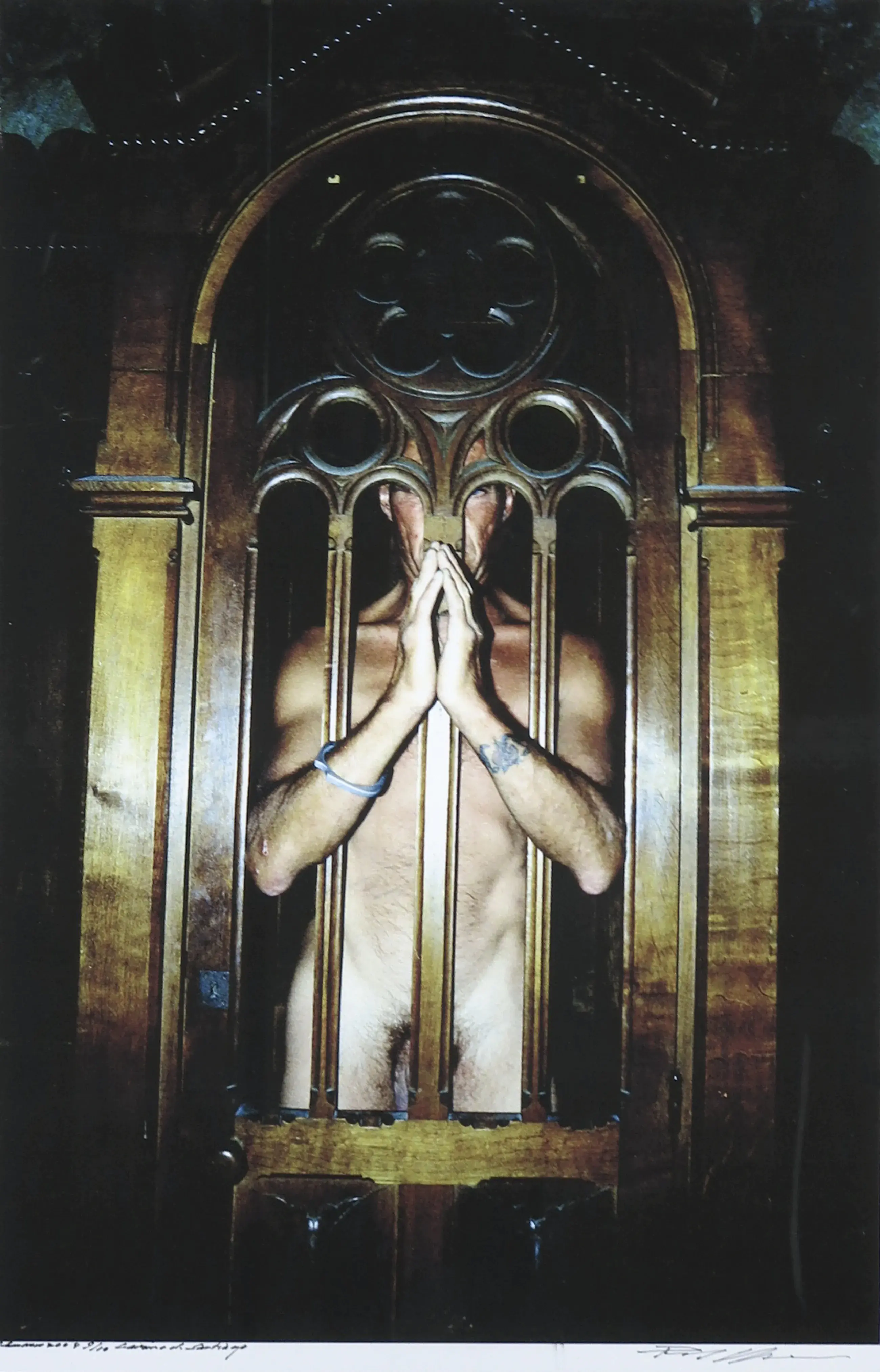 Klassieke foto uit 2005 van een naakte Paul Blanca in de biechtstoel.