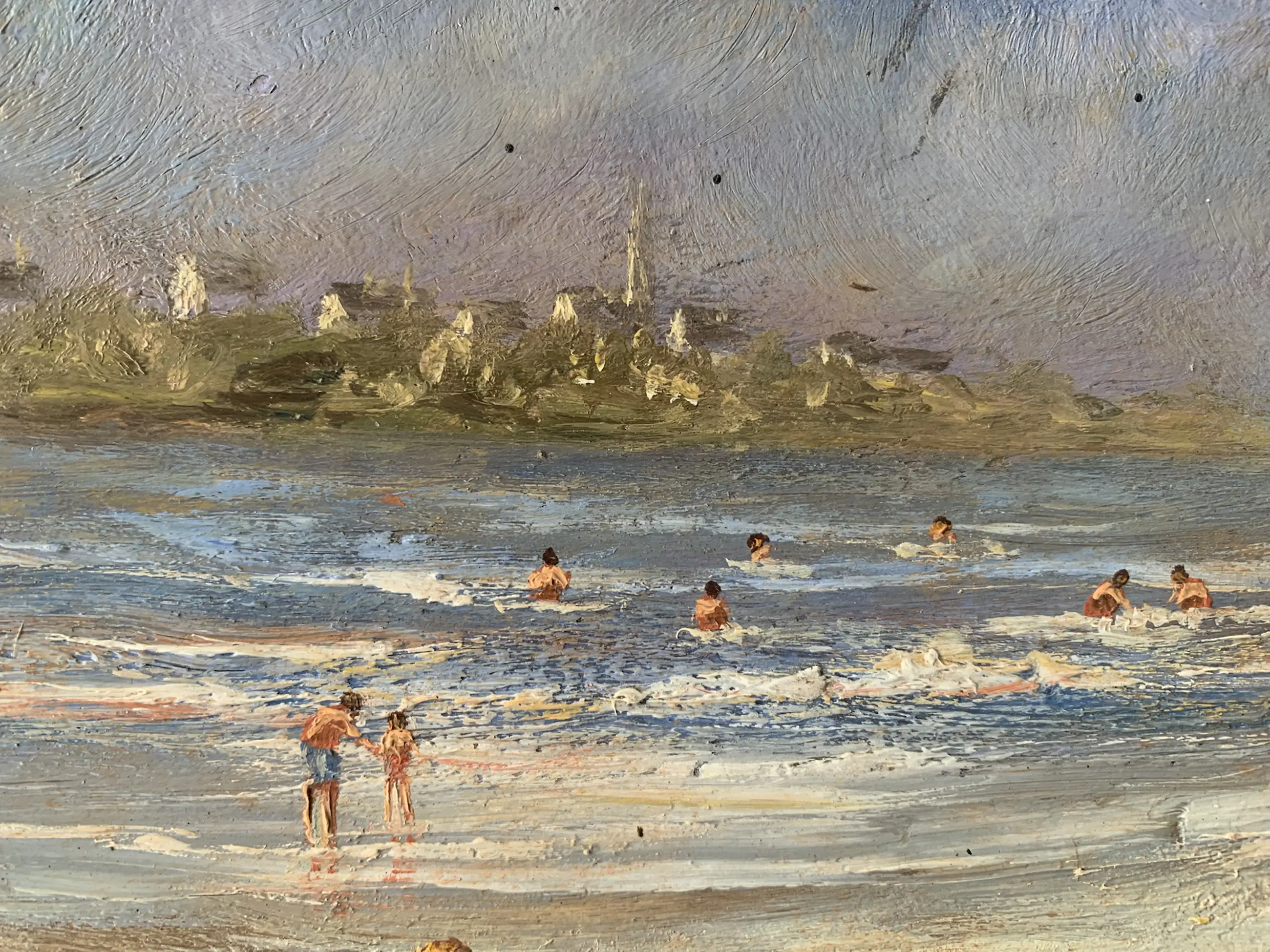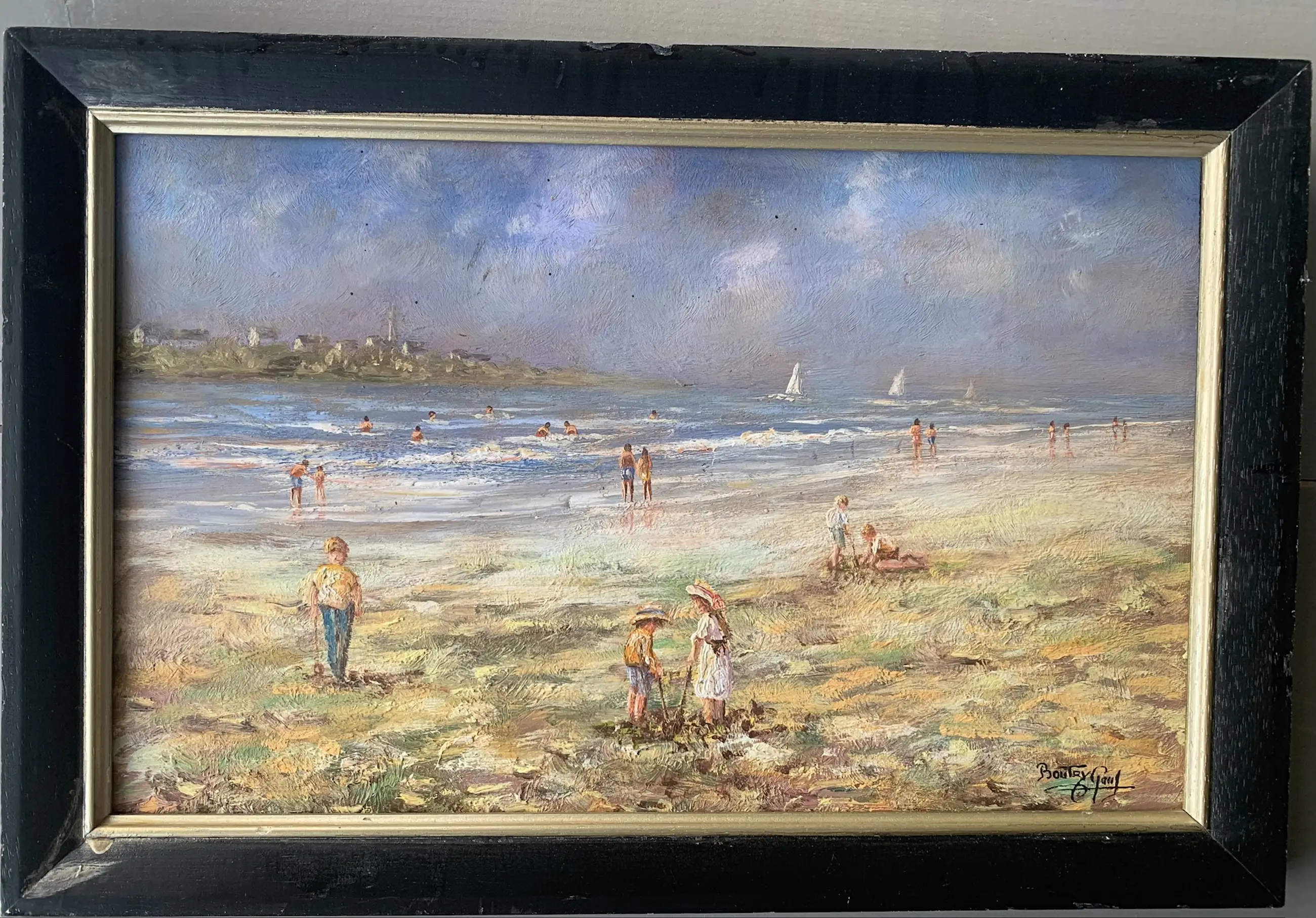 Sfeervol strandgezicht waarin Paul Boutry op karakteristieke wijze het zomerse leven aan zee verbeeldt. Op de voorgrond spelen kinderen in het duinachtige gras, terwijl verderop badgasten zich in zee begeven en zeilboten de horizon accentueren. De compositie is levendig maar harmonieus, met een natuurlijke dieptewerking van voorgrond naar achtergrond.
