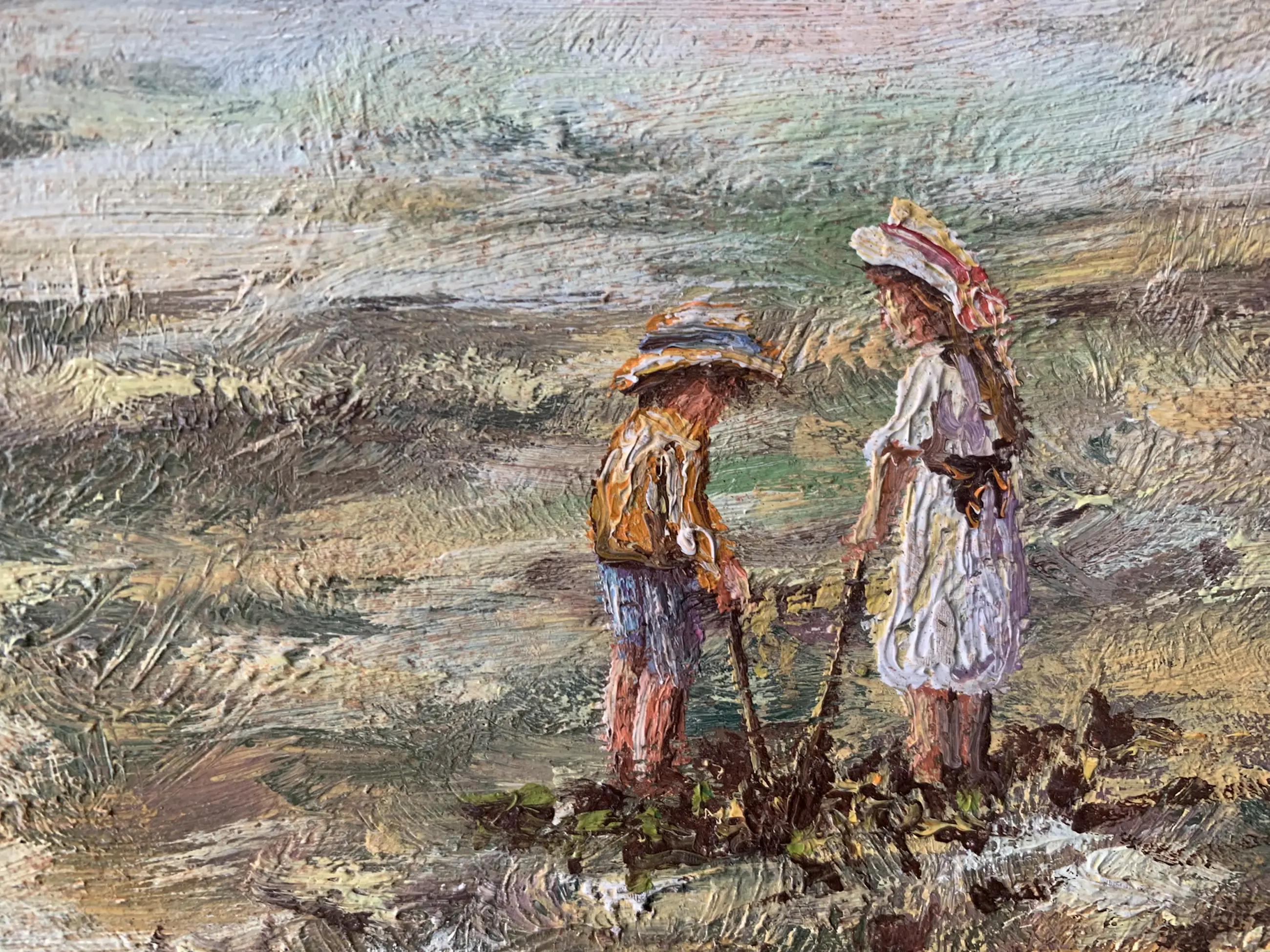 Boutry hanteert een losse, impressionistische penseelstreek en een zacht, licht palet waarin blauwtinten en warme aardkleuren elkaar afwisselen. De figuren zijn schetsmatig uitgewerkt, wat de nadruk legt op sfeer en beweging in plaats van detail. Het werk ademt rust, zomers licht en nostalgie, typerend voor Boutry’s figuratieve, post-impressionistische stijl.