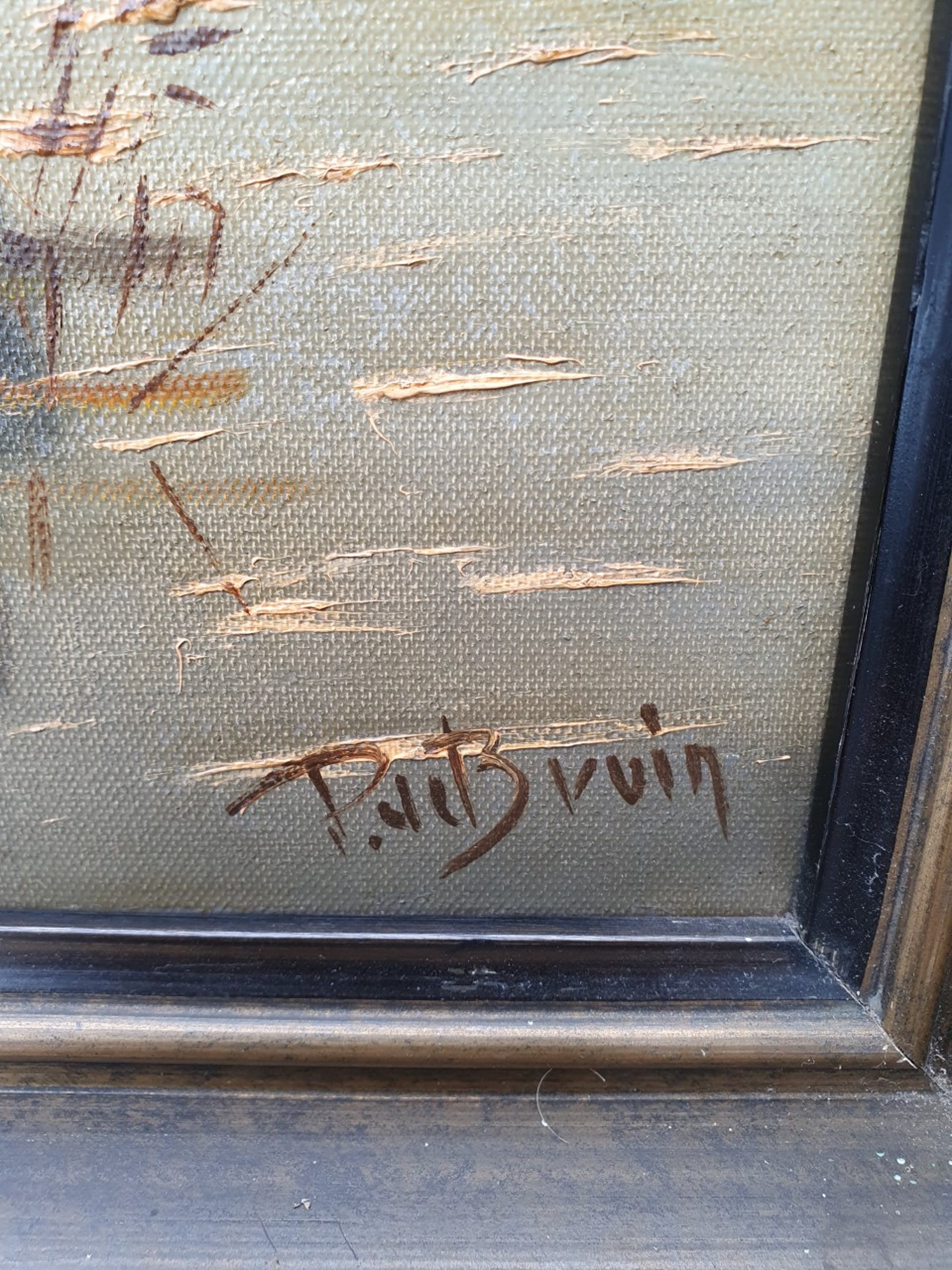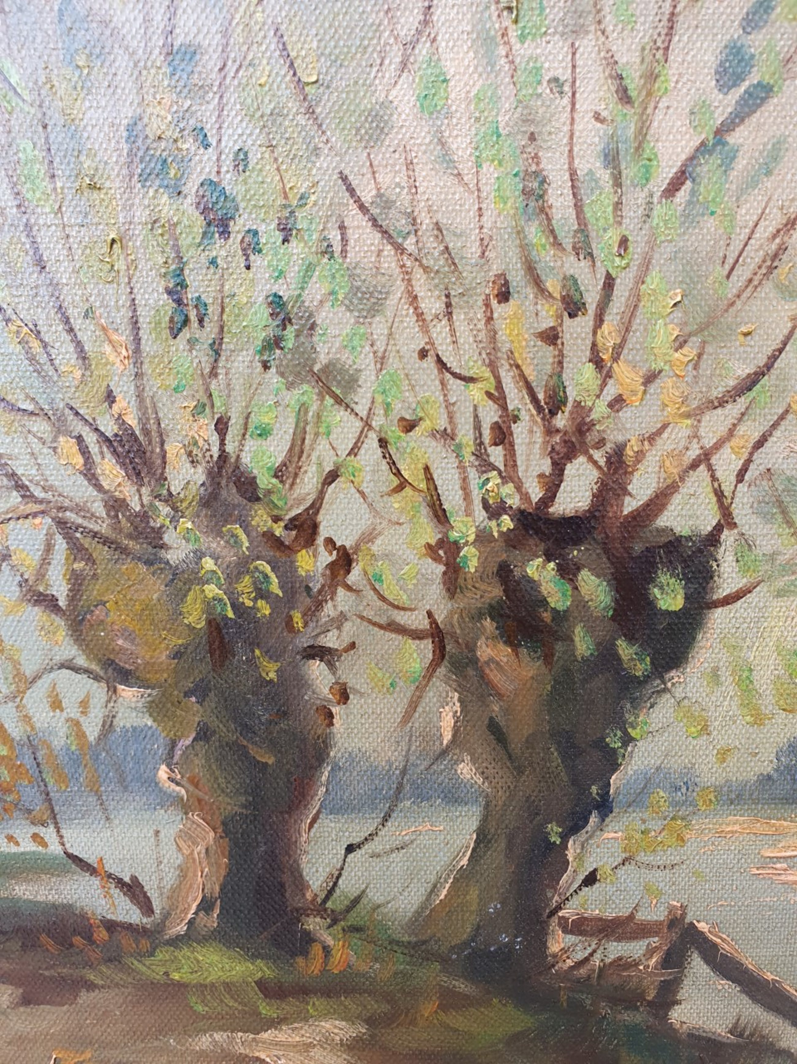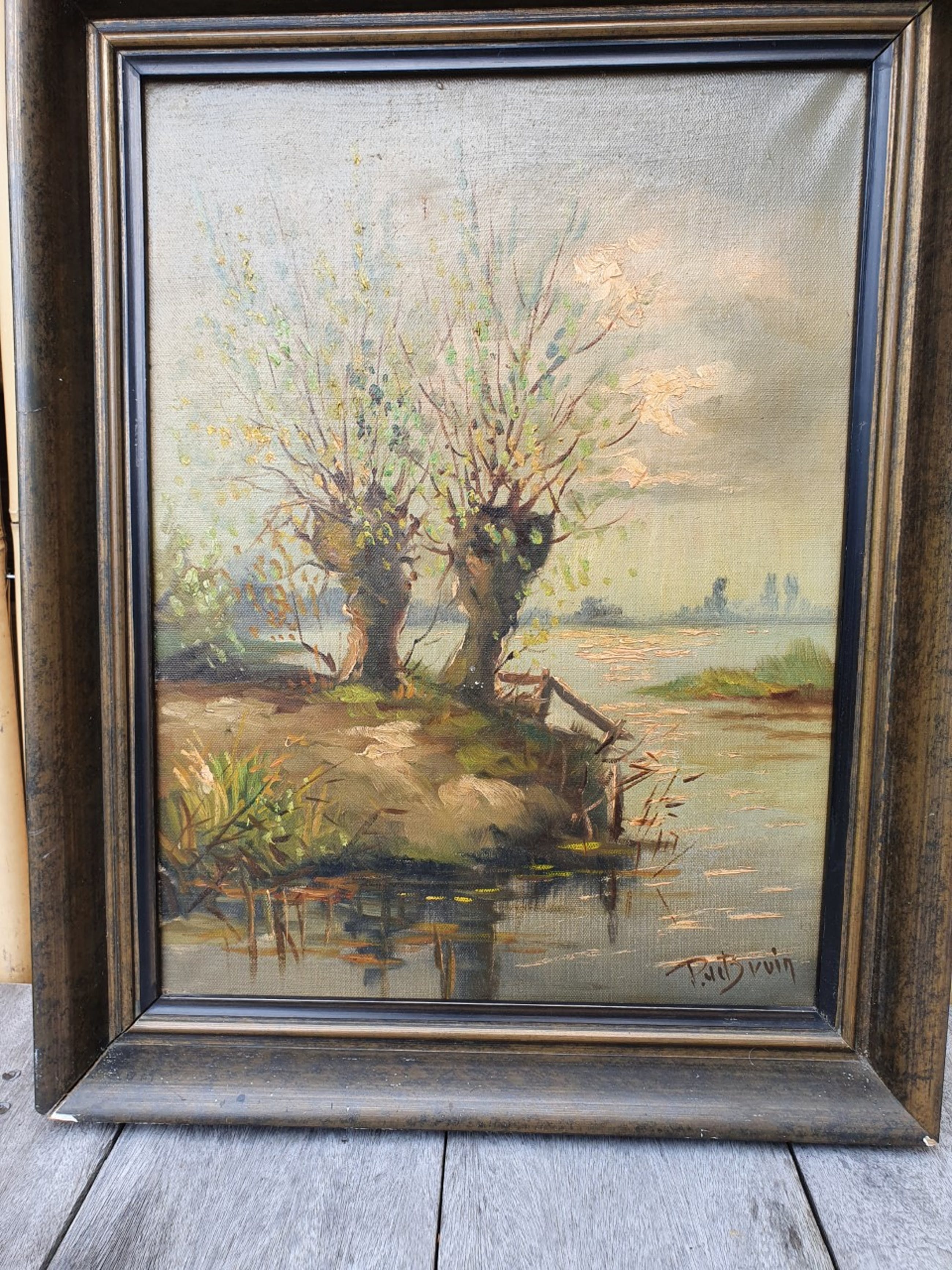 Fraai schilderij gesigneerd door P. de Bruin. Hollands tafereel aan het water met op de voorgrond knotwilgen. Voorzien van een mooie lijst, met kleine beschadigingen. Het doek zelf is in goede staat en zonder beschadigingen, is in verleden gerestaureerd aan een klein plekje, zie foto 8 met de achterzijde van schilderij. Het is impressionistisch geschilderd.