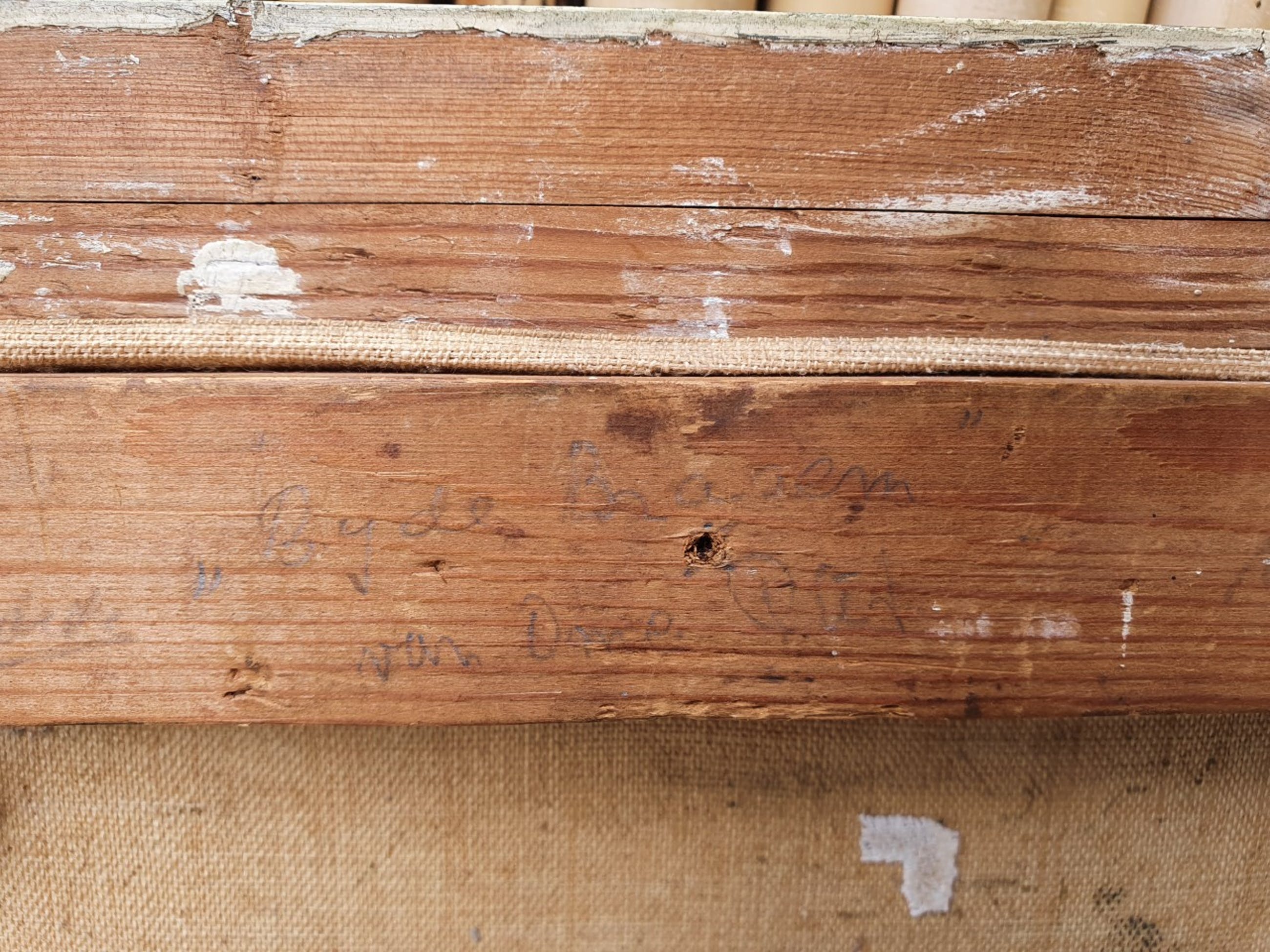 Doek heeft geen beschadigingen, lijst kleine gebruikssporen.