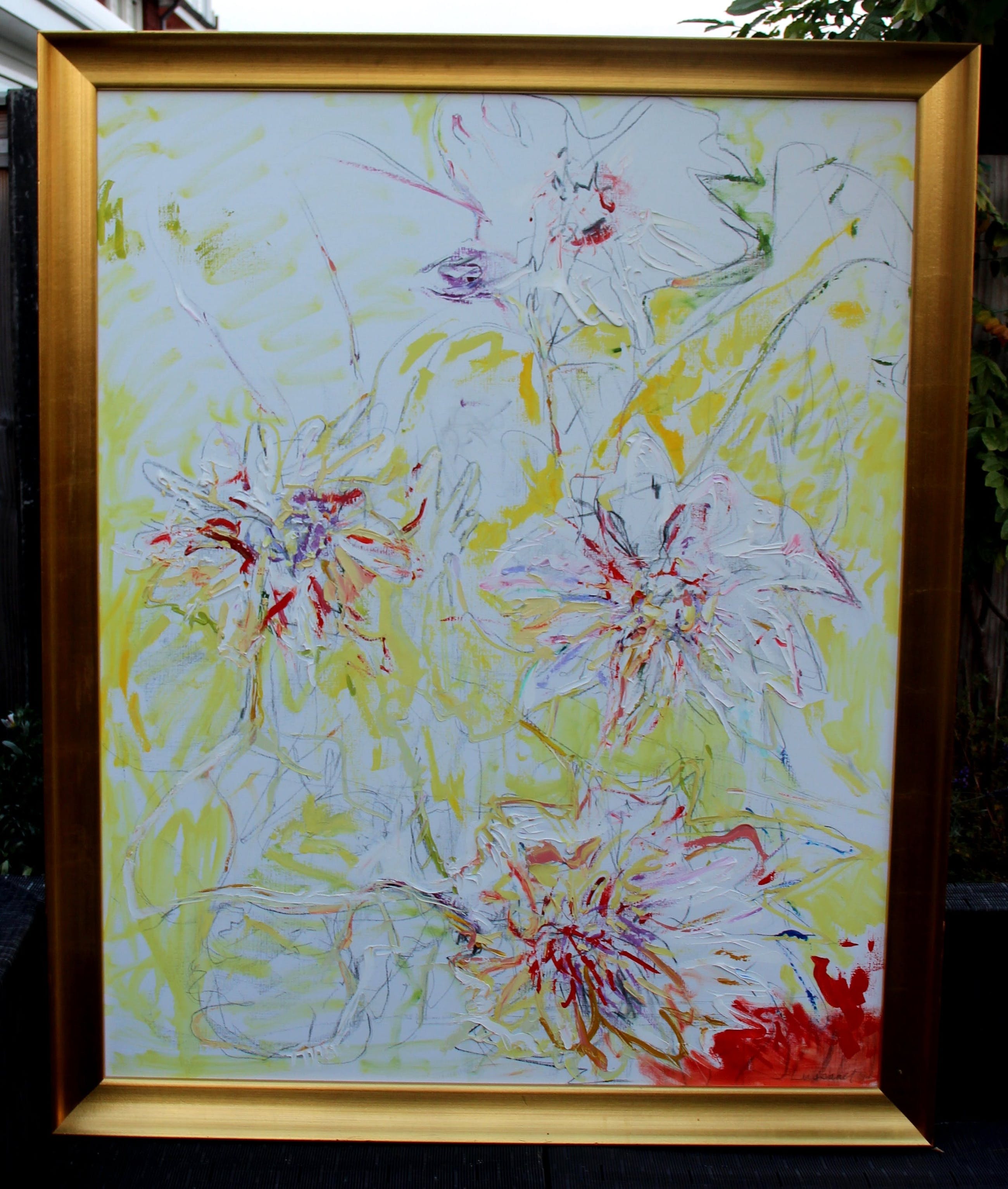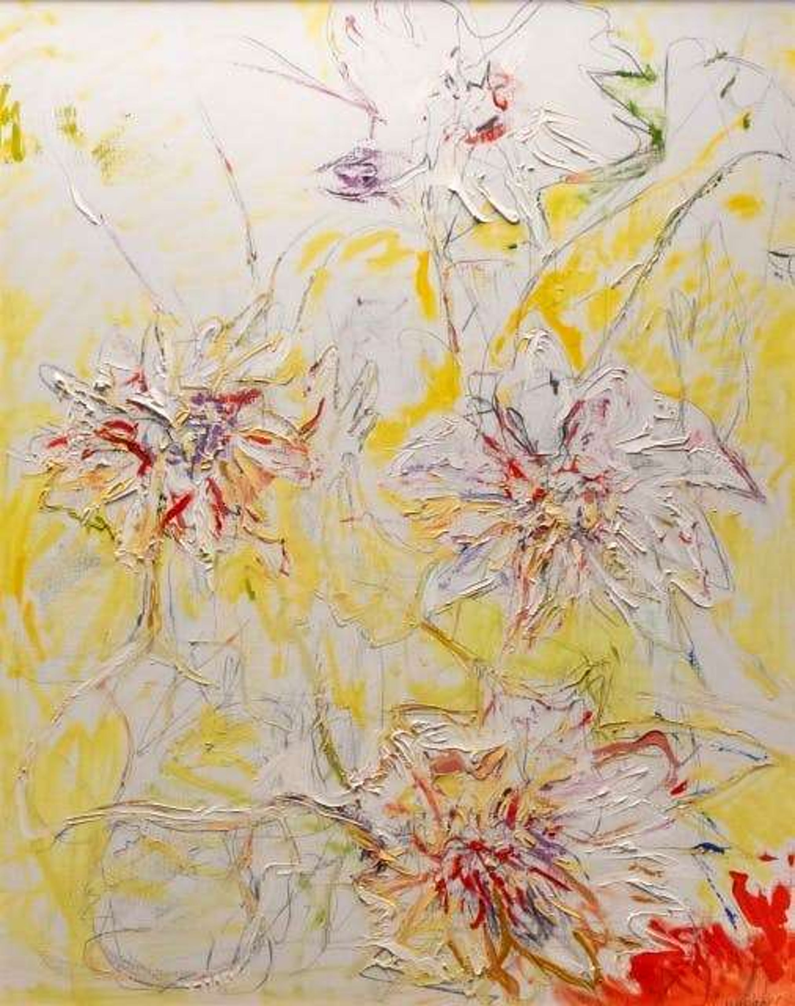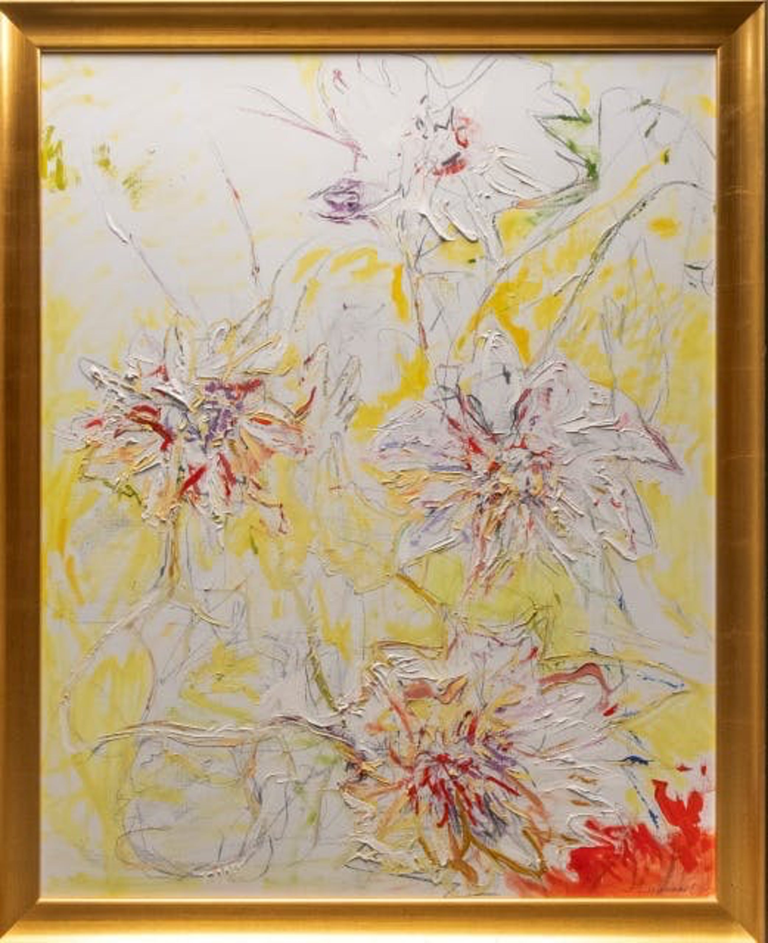 Prachtige Margrieten op doek van de Nederlandse kunstenaar Paul de Lussanet. Het werk is ook te vinden op zijn website: https://www.pauldelussanet.com/pauldelussanet1994-2003. Van de kunstenaar komt eind van dit jaar een monografie uit. Ook volgt er in het het voorjaar van 2022 een tentoonstelling in "Singer Laren". De woonplaats van de kunstenaar. Het werk is verkocht door Jan des Bouvrie die, in de woonwinkels van zijn ouders, o.a. kunst van "De Lussanet " had hangen. Zie: https://mastersexpo.com/zijn-passie-voor-kunst/