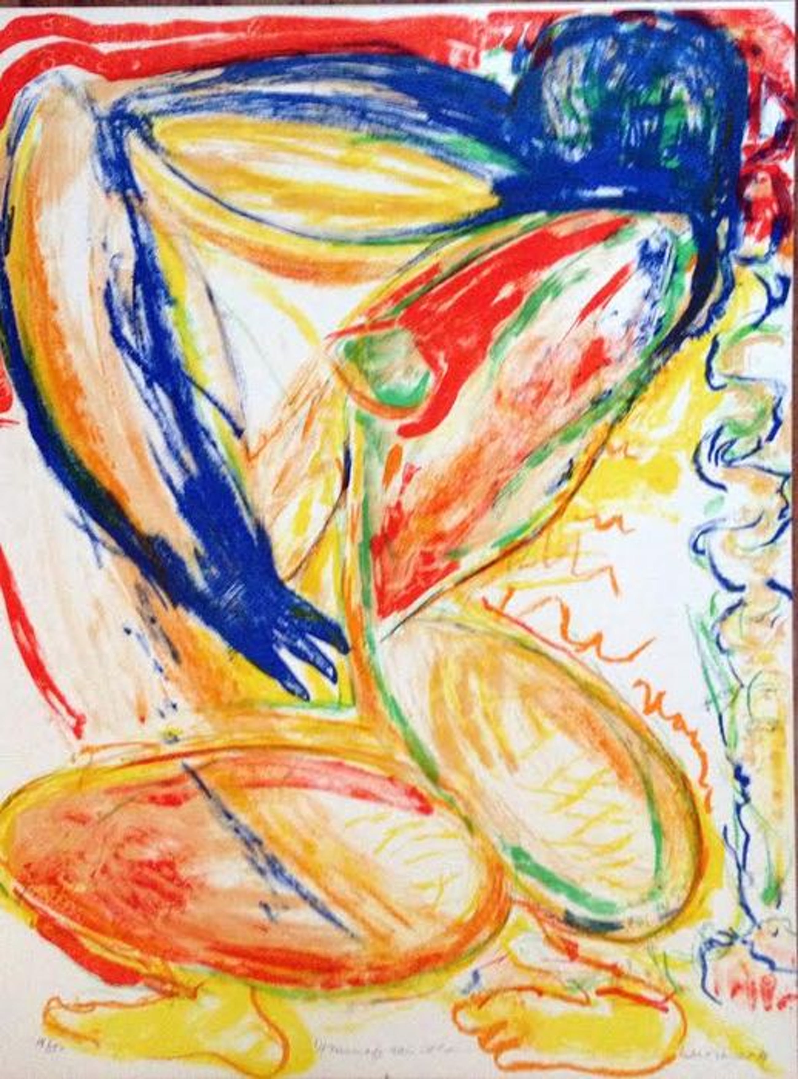 Kleurrijke in aluminium ingelijste litho van Paul de Lussanet. Titel: Hommage aan Cobra. Jaar: 1989. Afmetingen litho: H 64 x b 49 cm. Nummer: 145/250. Het werk is rechtsonder, met potlood, door de kunstenaar gesigneerd.
