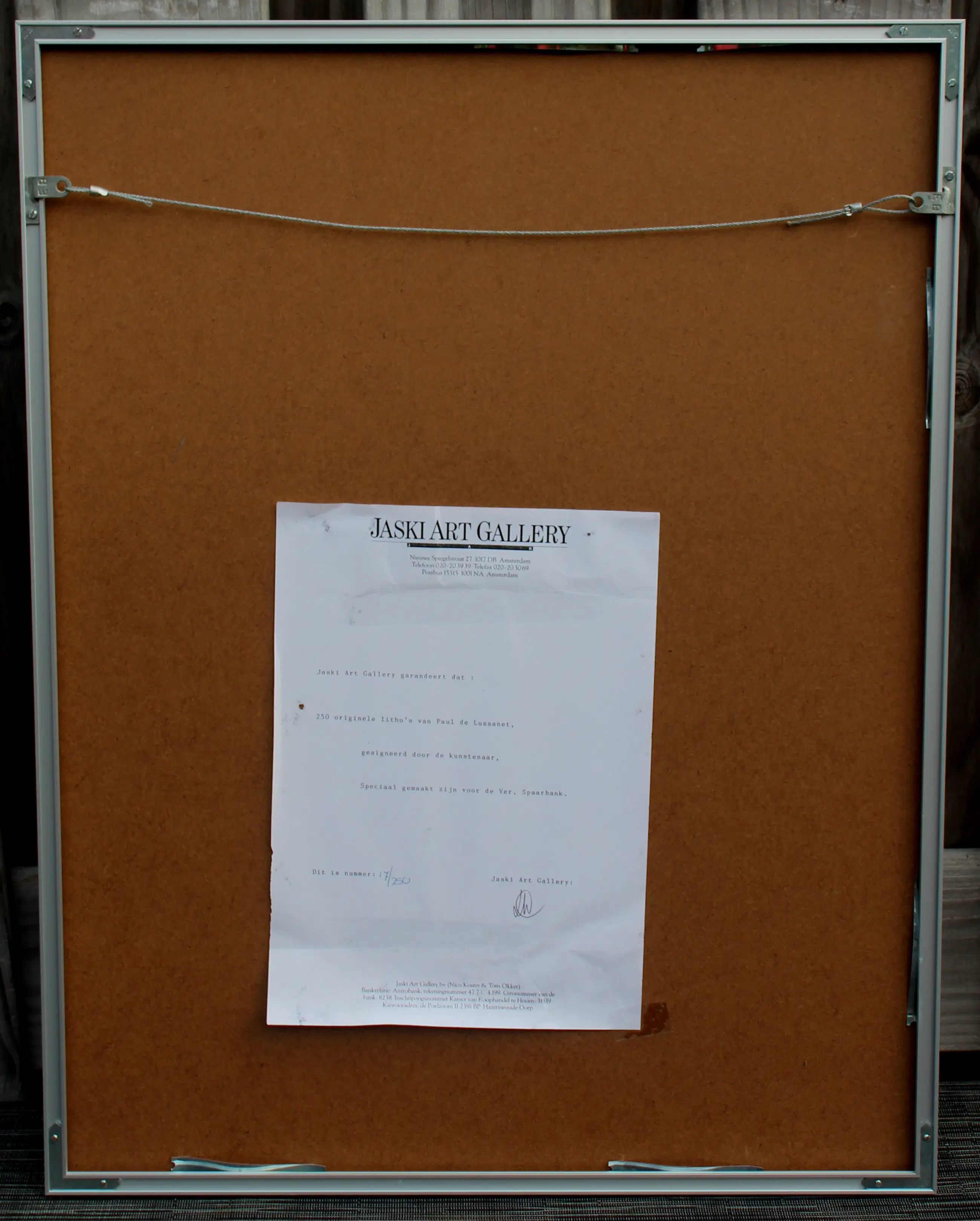Bij ingelijst werk gaat onze voorkeur uit naar ophalen. Als dit niet mogelijk is, verzenden wij het werk goed verpakt. Eventuele glasschade is echter niet verzekerd. Wij kunnen het werk ook met een kunstkoerier verzenden. De kans op schade is dan minimaal. Bij verzenden ontvangt u, per mail, de Track & Trace code. Onze verzenddagen zijn dinsdag en donderdag.
