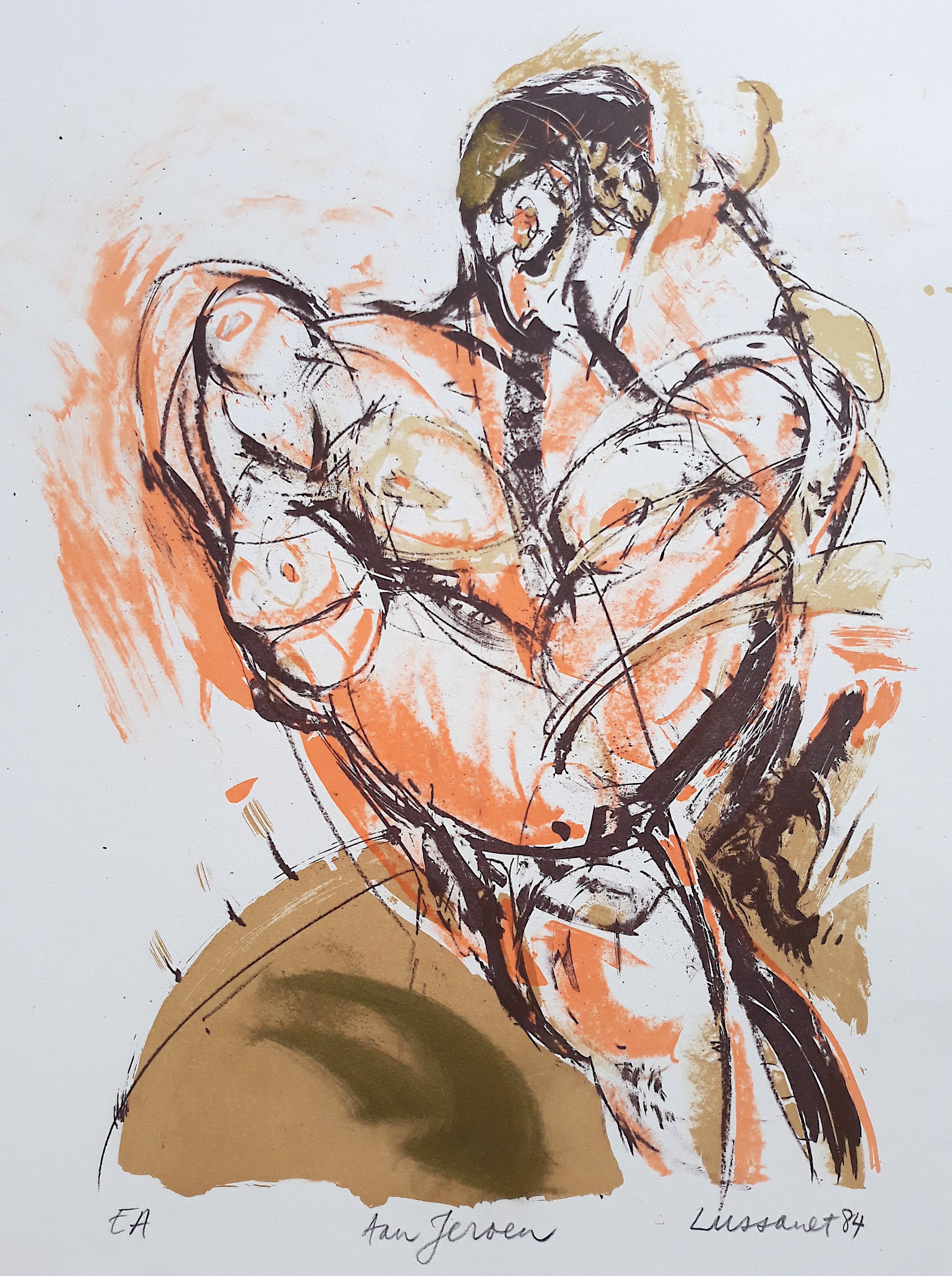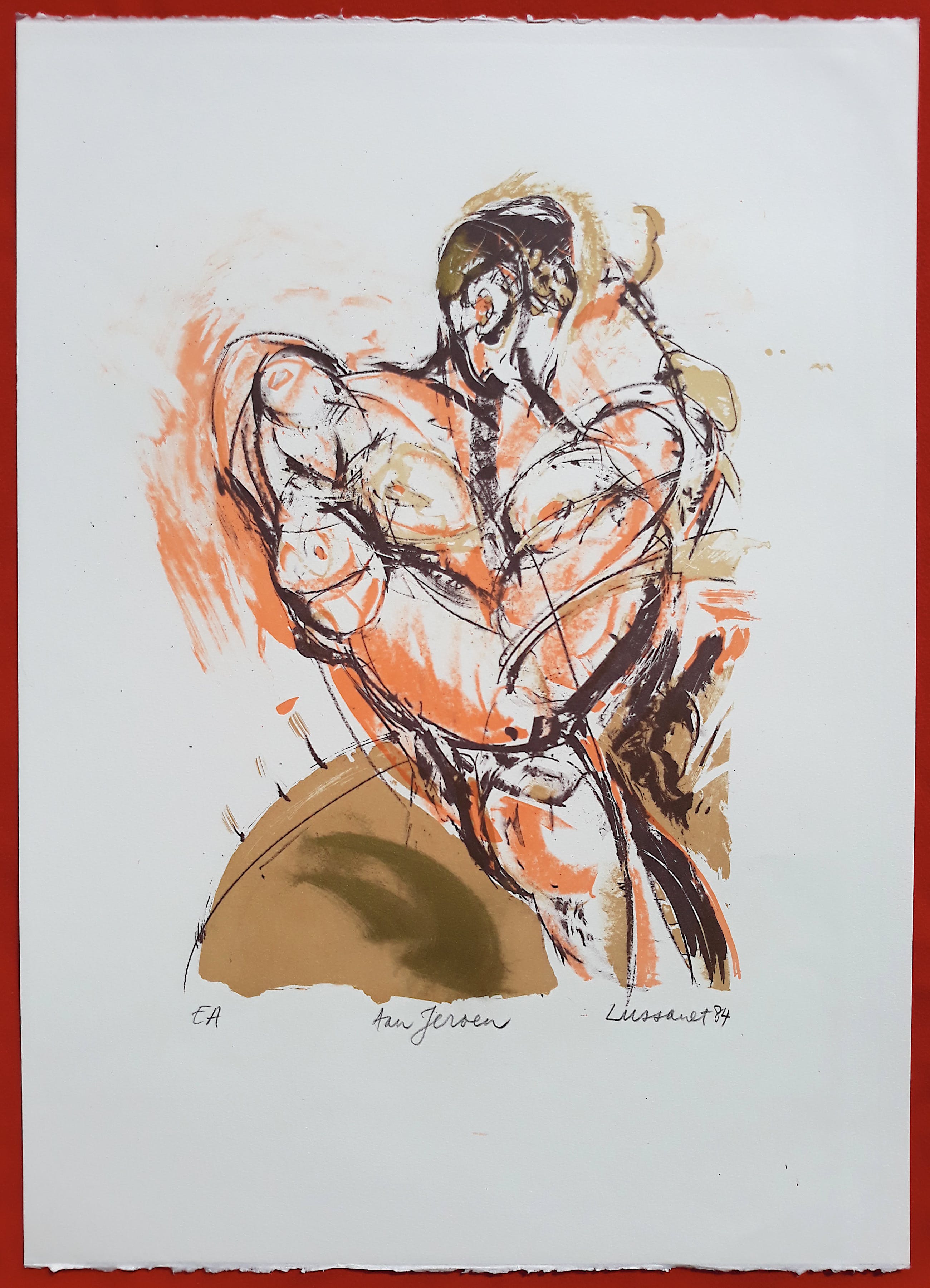 Karakteristiek werk van Paul de Lussanet. Ik dacht een moeder met kind te ontwaren, met de aantekening dat ik wel Jeugdzorg zou bellen want moeder ziet er gespierd en dreigend uit. Litho op Arches papier, met potlood gesigneerd, gedateerd (’84) en met opdracht “Aan Jeroen”, een E.A. (Épreuve d’Artiste) exemplaar. In uitstekende conditie.