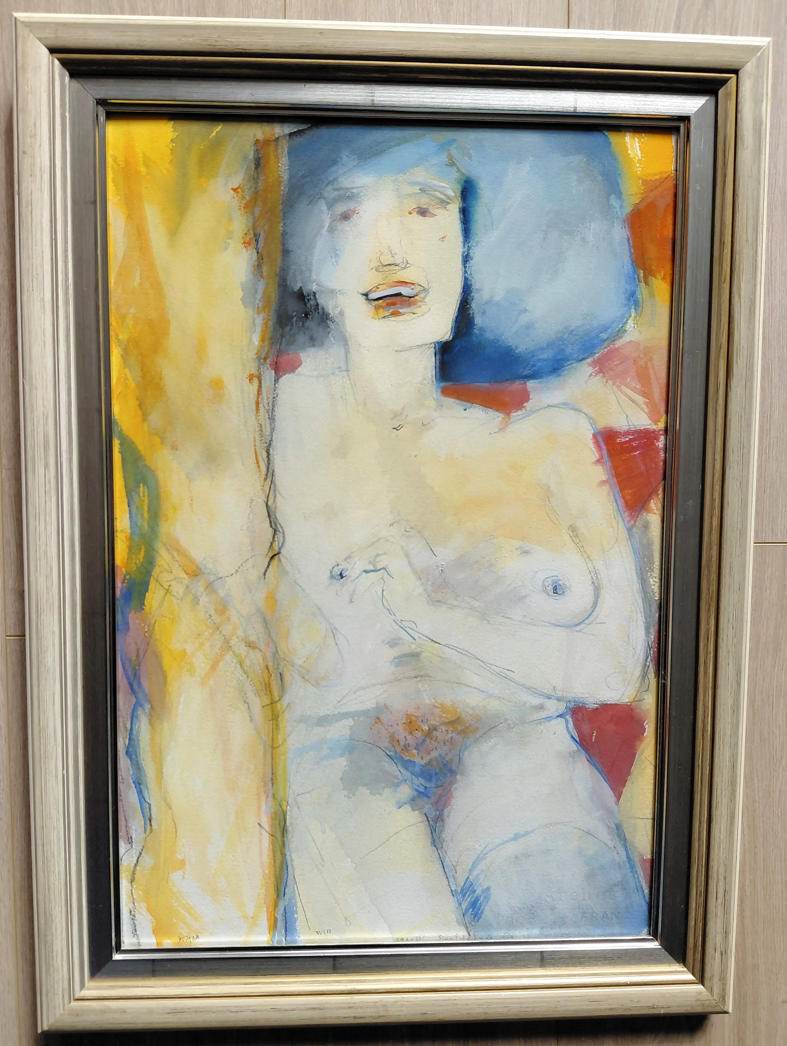 Karakteristiek naakt van Paul de Lussanet. Gemengde techniek (aquarel, gouache, krijt) op papier, gesigneerd middenonder (net leesbaar), in nette lijst en achter glas. In zeer goede conditie.