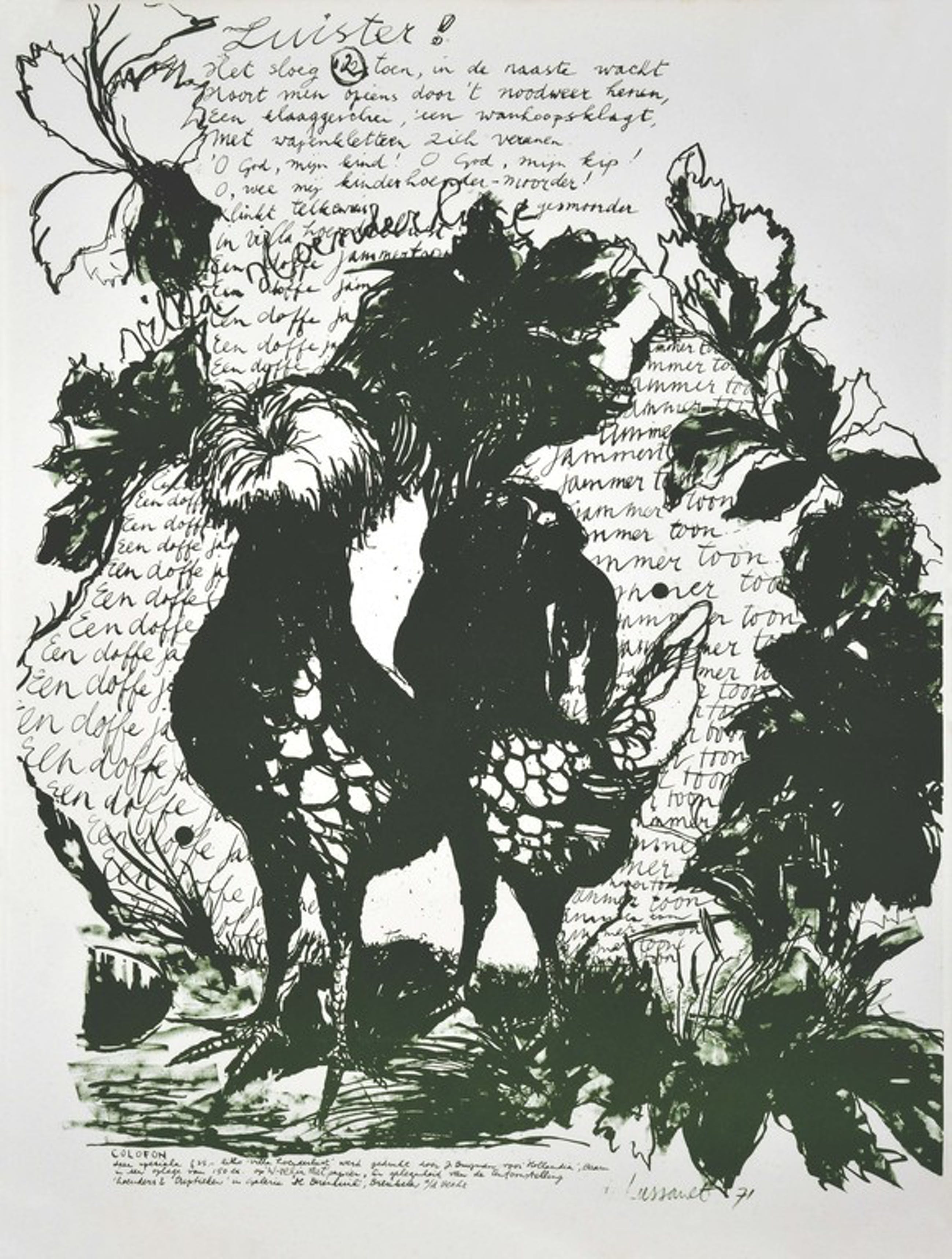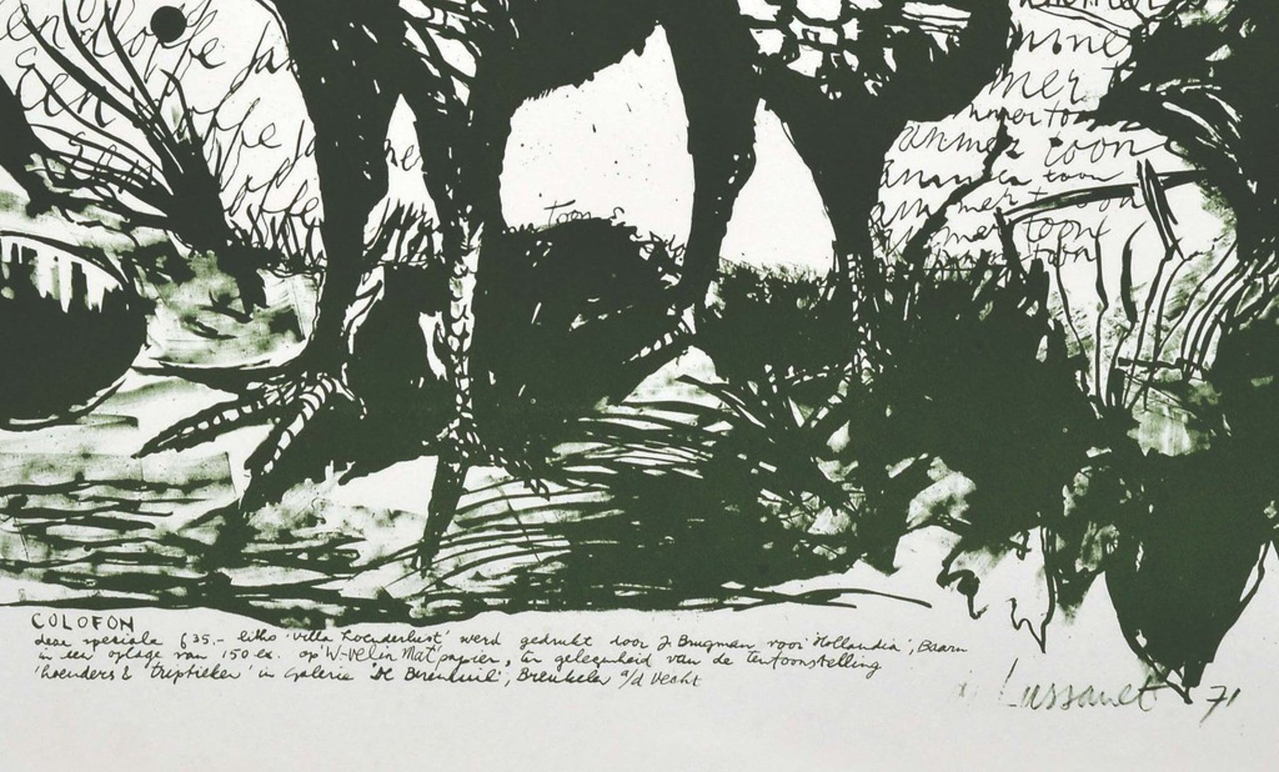 Colofontekst onder afbeelding: 'deze speciale f 35,- litho 'villa hoenderlust' werd gedrukt door J. Brugman voor 'Hollandia', Baarn in een oplage van 150 ex. op 'W-velin Mat' papier, ter gelegenheid van de tentoonstelling 'hoenders en triptieken' in Galerie 'De Berenkuil', Breukelen a/d Vecht' de Lussanet '71(gesigneerd in druk)