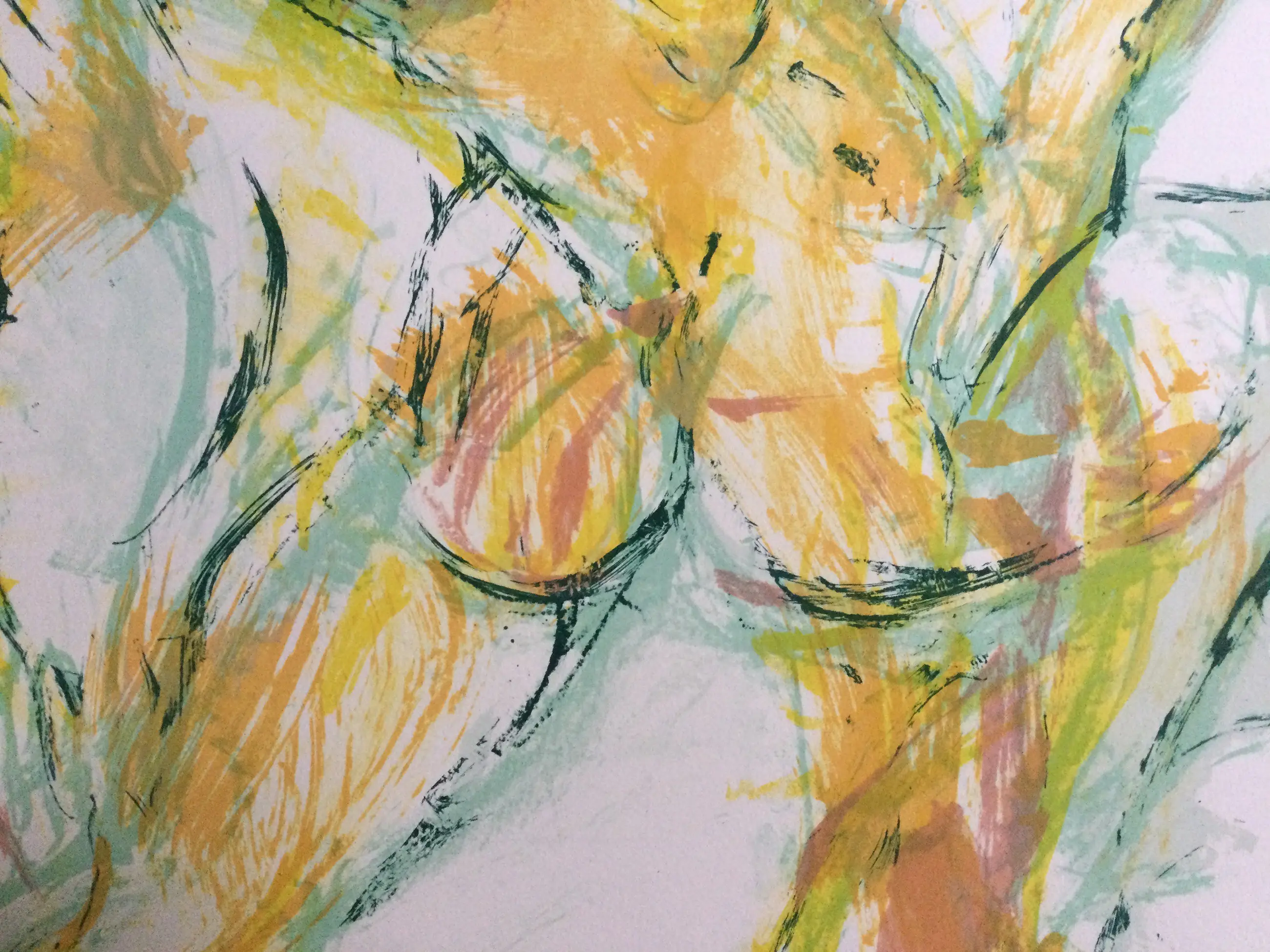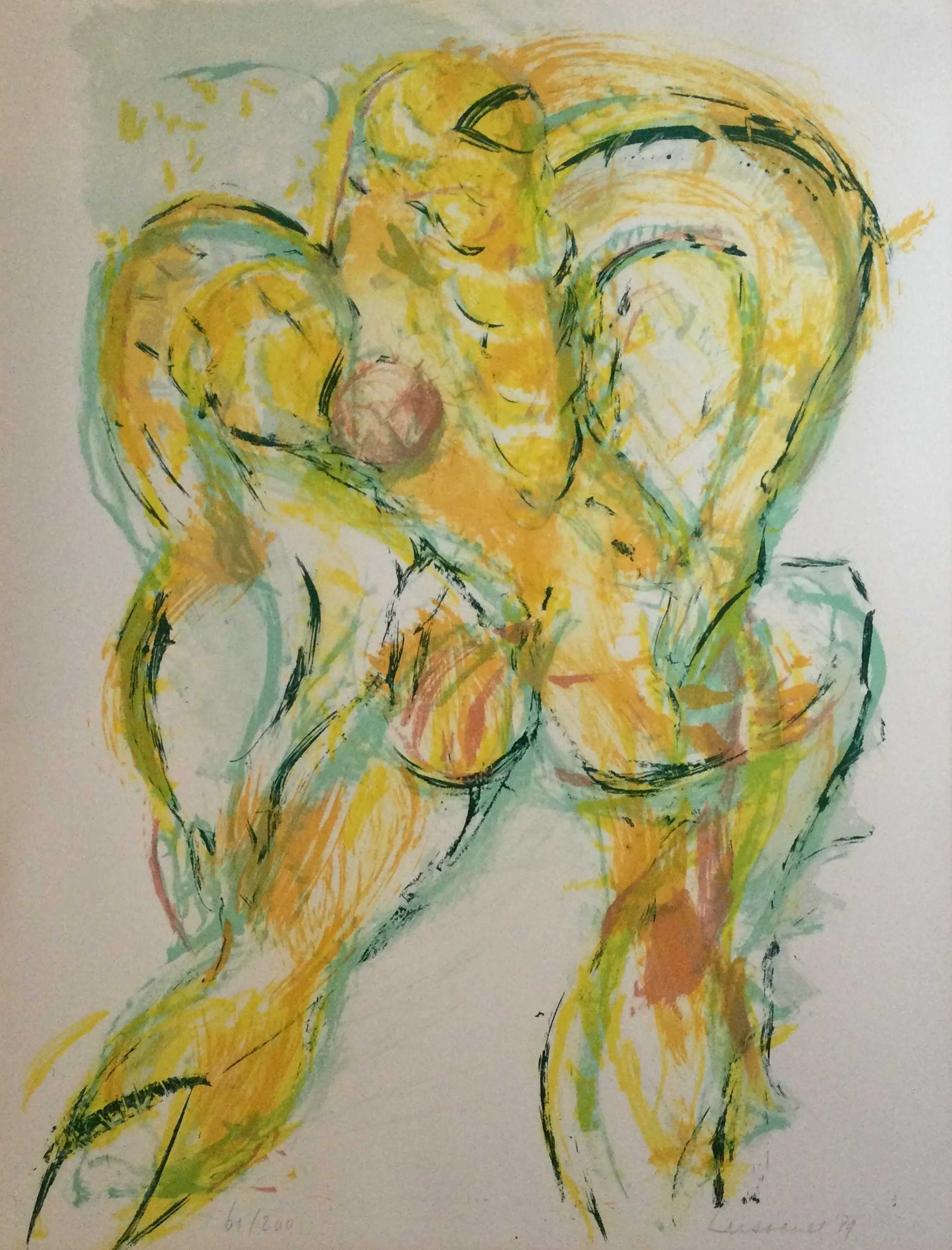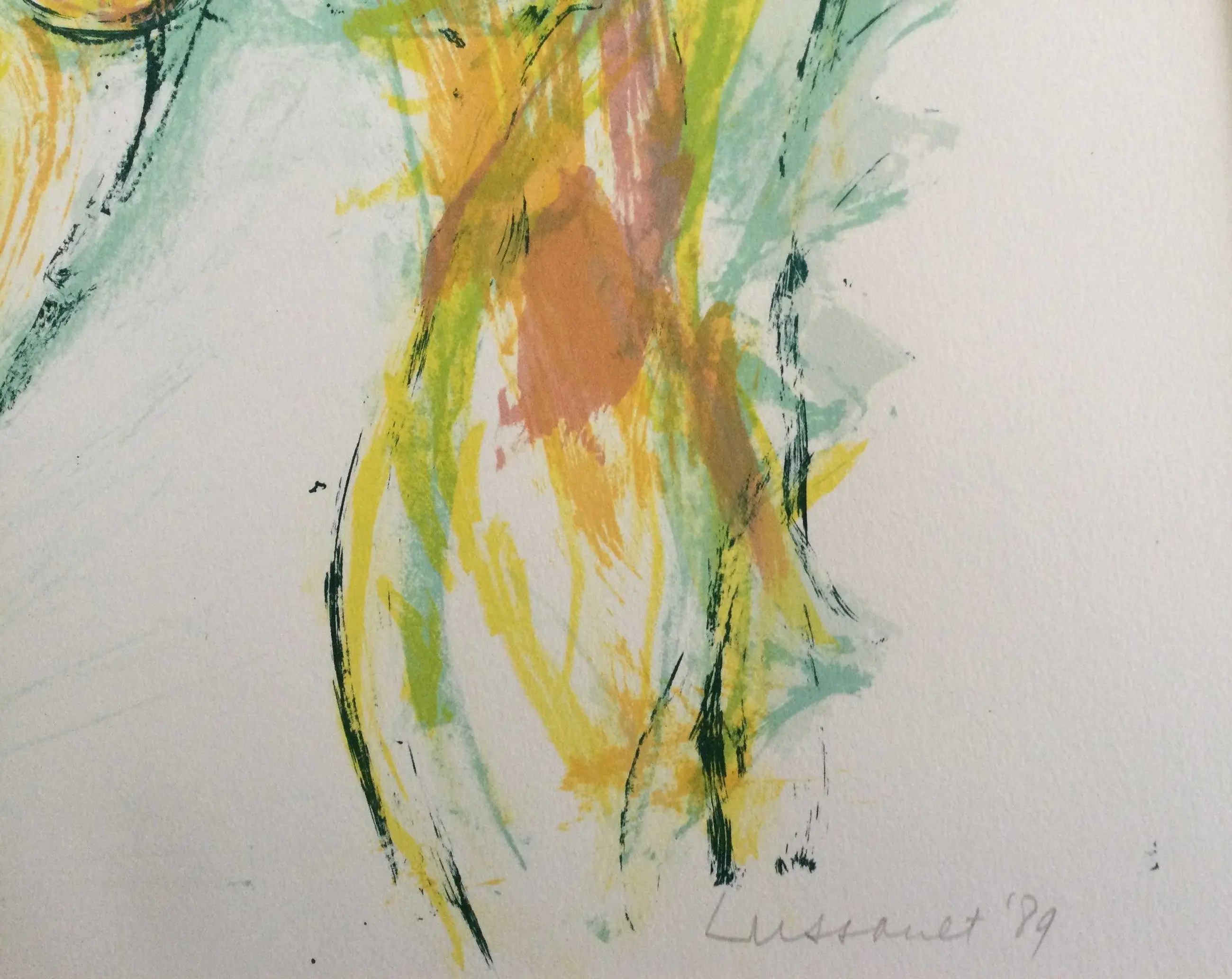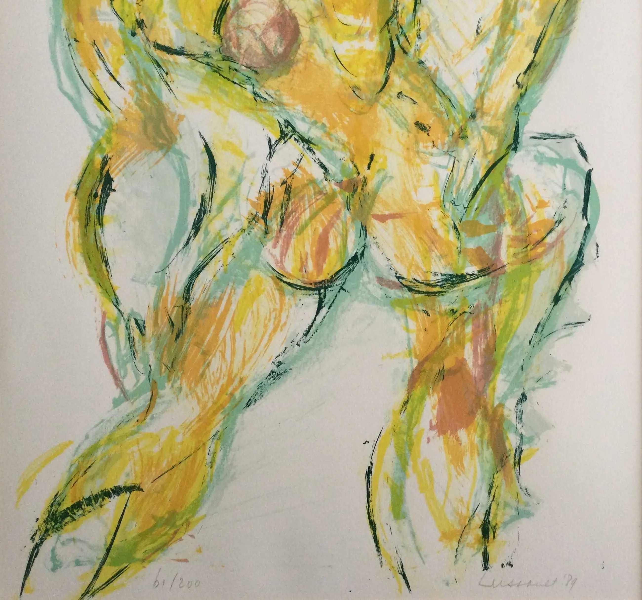 Prachtige litho van Paul de Lussanet (1940). Vrouwelijk naakt is het favoriete onderwerp van De Lussanet. Door zijn dynamisch en expressieve schilderstijl zijn de naakten echter niet heel expliciet, maar juist lichtelijk geabstraheerd.