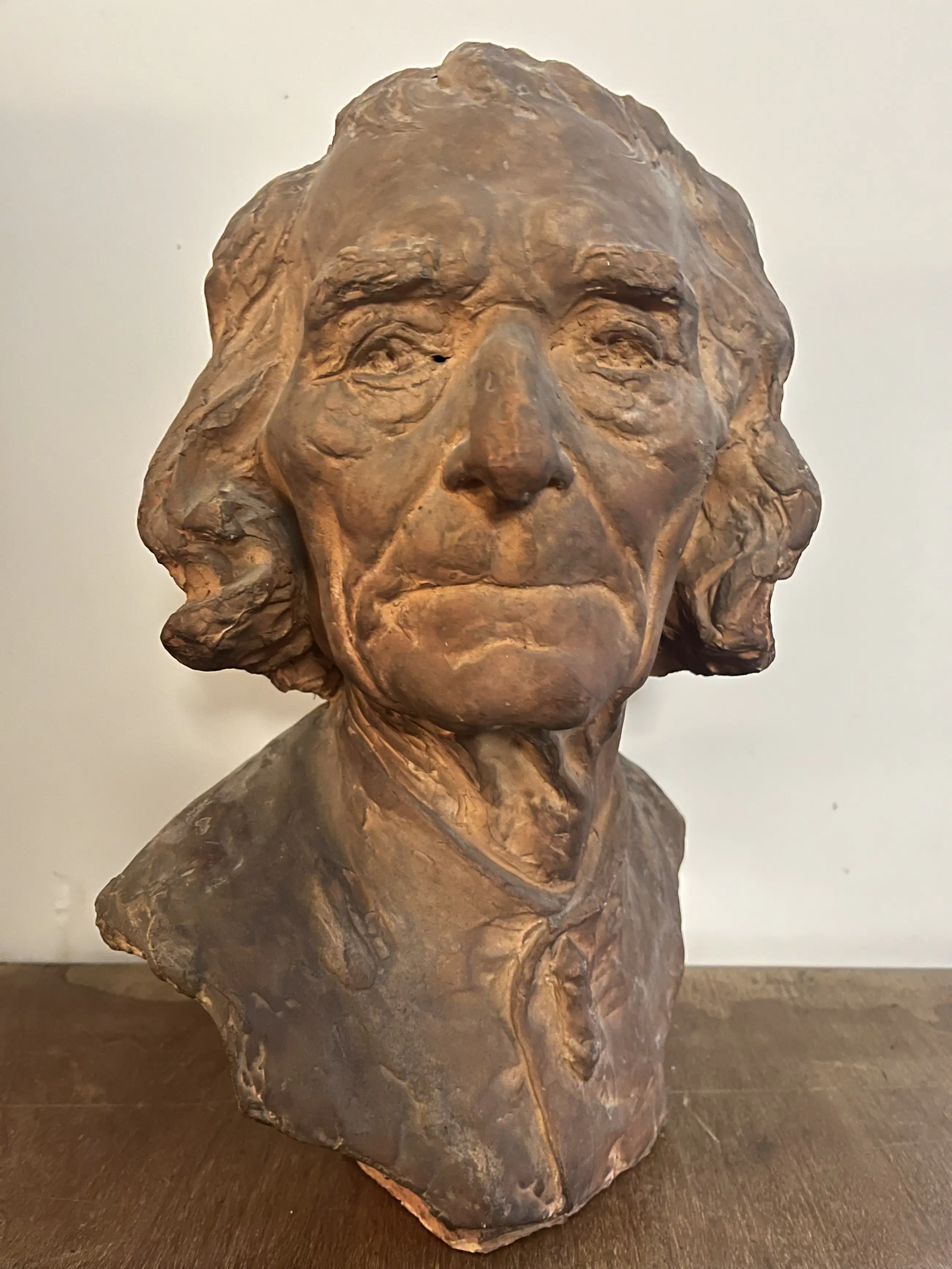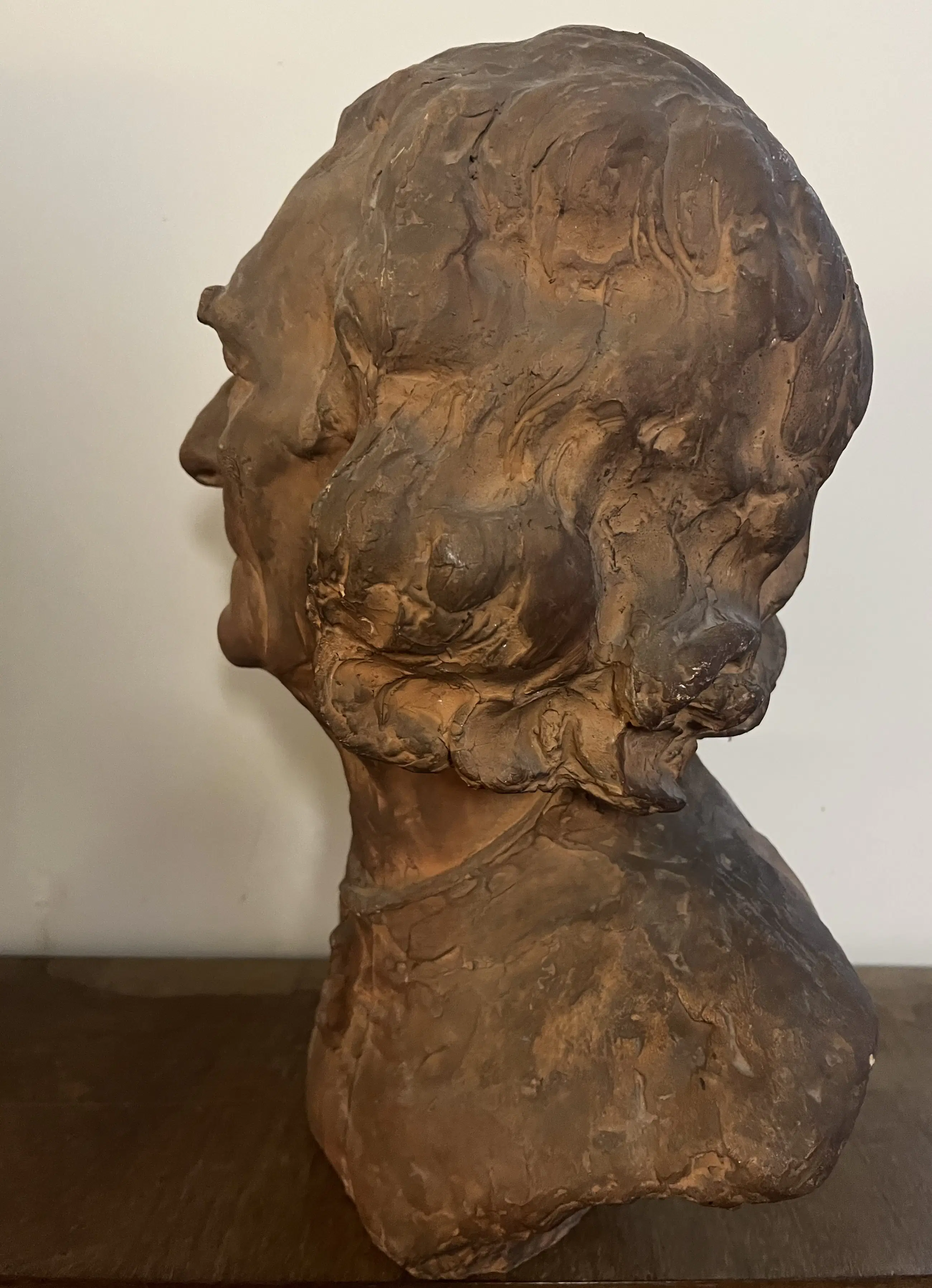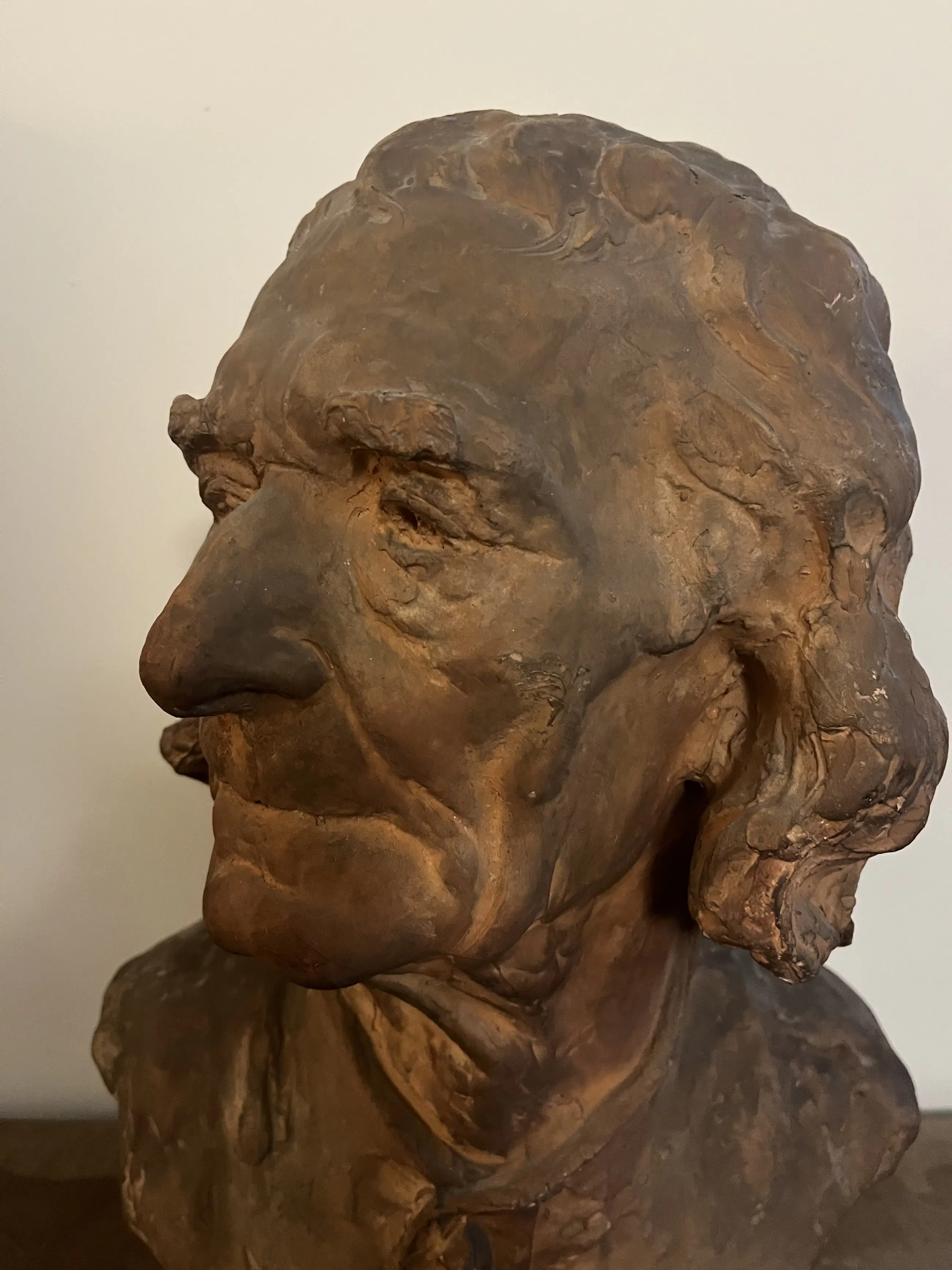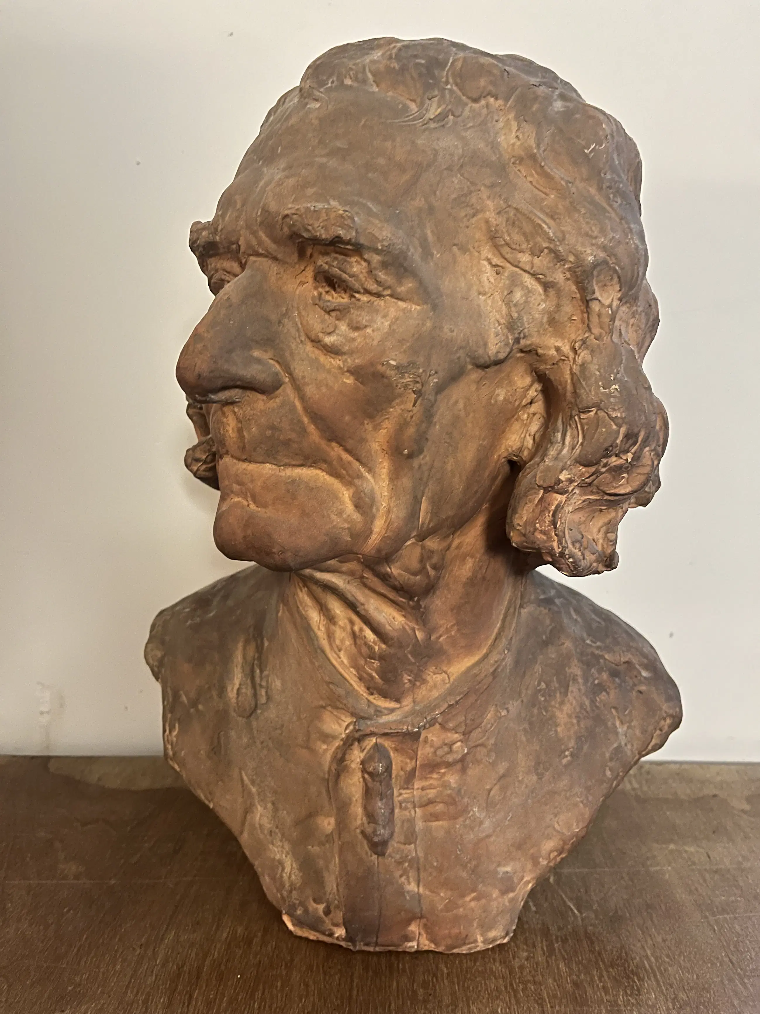 Terra- cotta beeld van Paul de Vigne met afbeelding van Pieter de Coninck. Dergelijke bustes in verschillende grondstoffen in Musea Gent en Antwerpen. De Vigne vooral gekend van grote bronzen beelden op pleinen in Gent en Brugge. Niet gesigneerd . Enkele malle lijnen zichtbaar . Kleur donkerder door ouderdom. In goede staat 39/28/23 cm Liefst ophaling