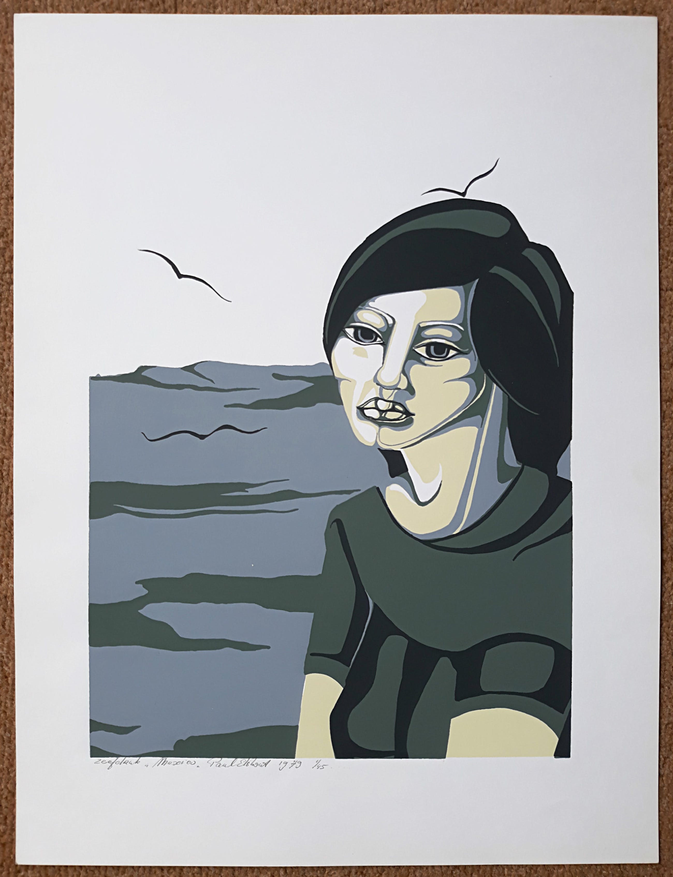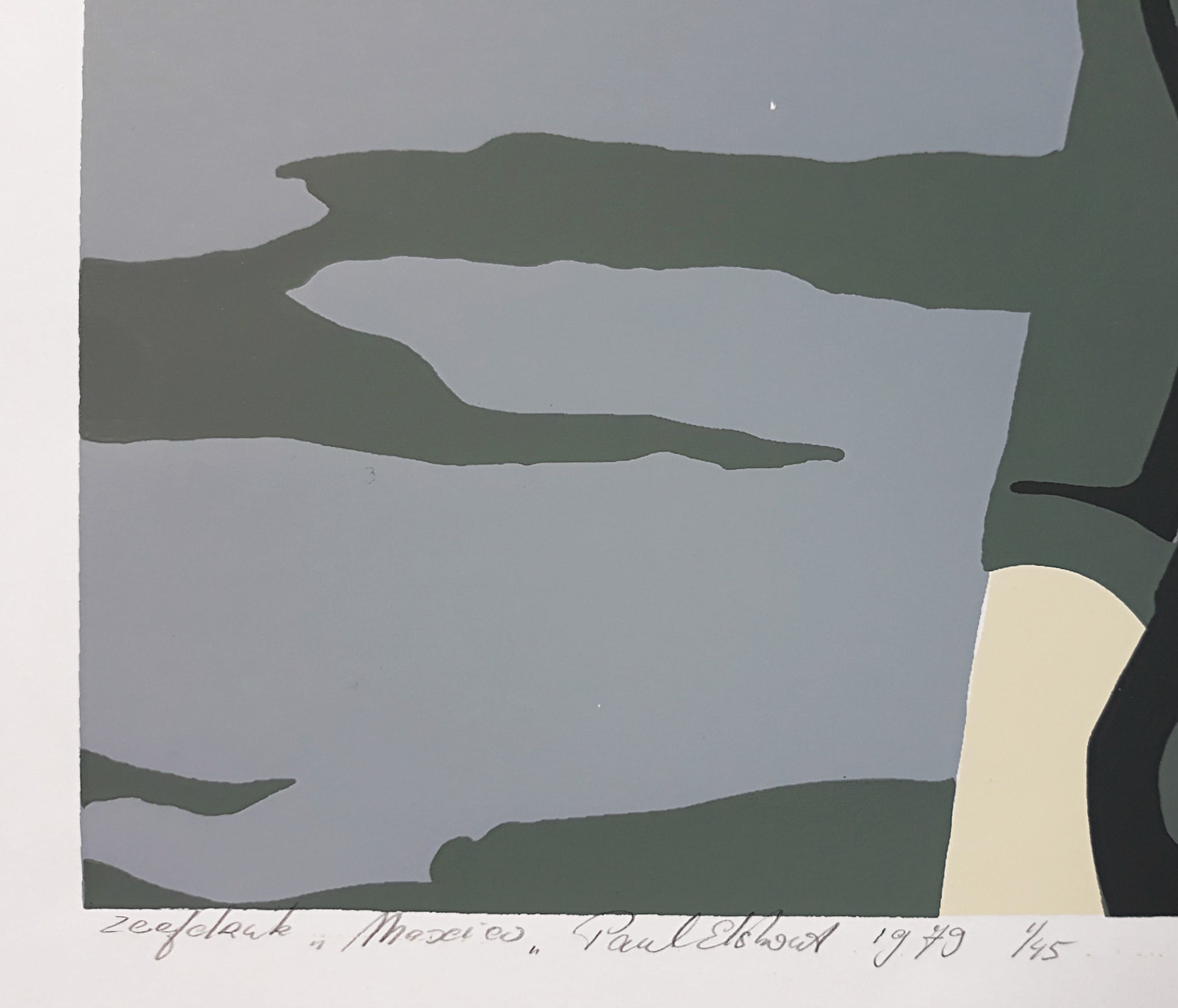 Direct herkenbaar werk van Paul Elshout. Zeefdruk op glad papier, met potlood gesigneerd, getiteld, gedateerd (1979) en genummerd (1/45). In zeer goede conditie.