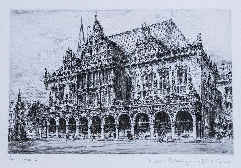 Bremen, Rathaus Original-Radierung von Professor Paul GEISSLER, geb. 25.06.1881 in Erfurt, gest. 30.05.1965 in Garmisch-Patenkirchen. Radierung signiert (ca. 1920) Zustand = sehr gut Rahmen leichte Gebrauchsspuren Maße mit Rahmen ca.= 30,6 cm x 40,5 cm Maße ohne Rahmen 27,5 cm x 18,2 cm Porto 6 ?