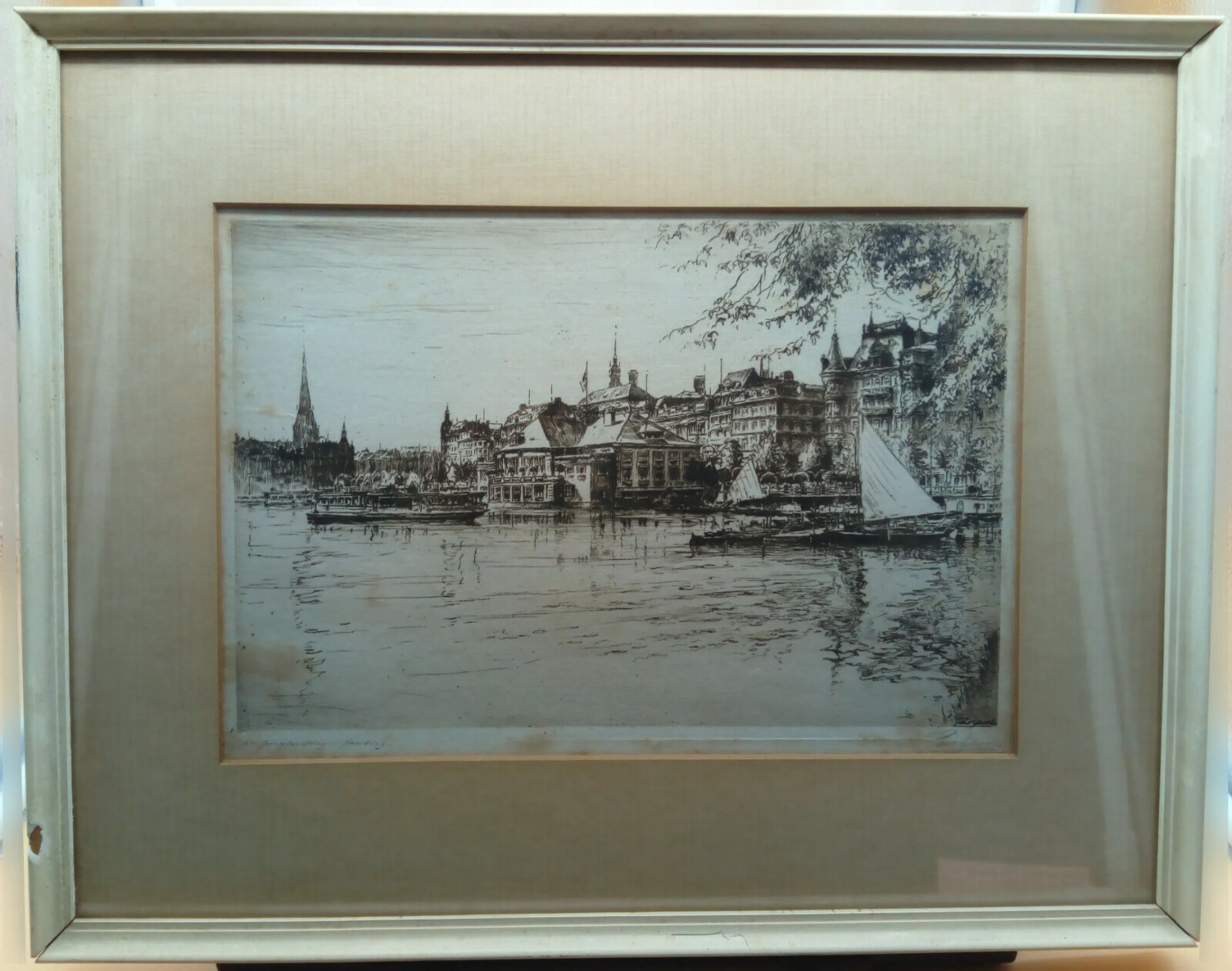 LAATSTE KANS: WORD NA EINDE VEILING NIET MEER OPNIEUW AANGEBODEN! Jungfernstieg Hamburg. Zowel in de plaat gesigneerd als handgesigneerd met potlood! Gedeeltelijk Sütterlin-schrift in de signatuur: 'am Jungfernstieg in Hamburg'. Opschrift op de achterzijde: "Alster Pavillon, Düsseldorf.....Omie". Met etiket van een Nederlandse kunsthandelaar met een klein stempeltje eronder '1 aug. 1957' (datum dat het werd ingelijst). Let op de onvermijdelijke reflectie bij het fotograferen.Lijst is hier en daar beschadigd, zie foto's.Ets: goed (hier en daar foxing). | |||||||||||