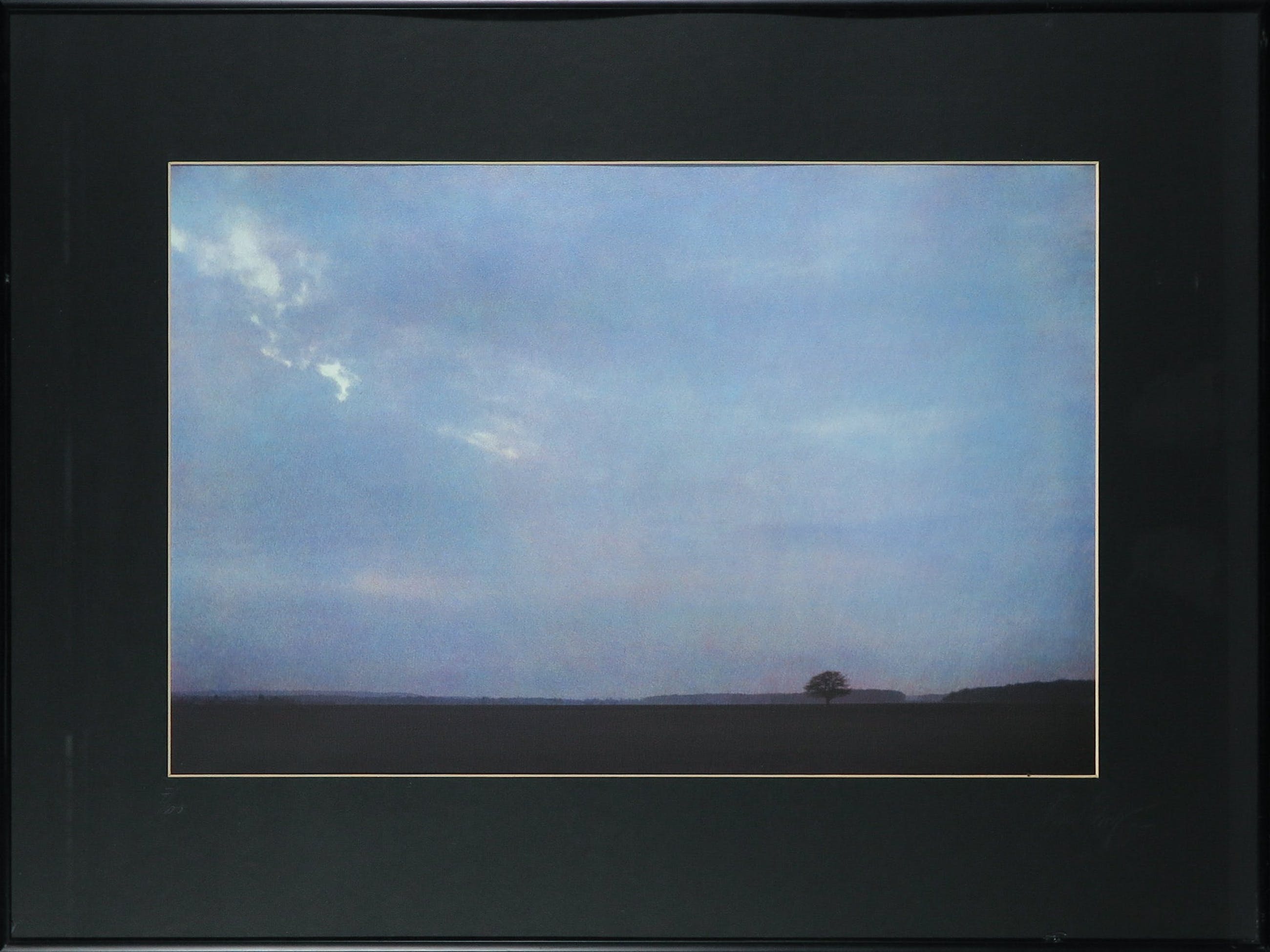 | Het werk is in zeer goede staat. Langs de onderste rand een kleine beschadiging in het glas. Zie de laatste foto. Lichte golving in het passe-partout. | |