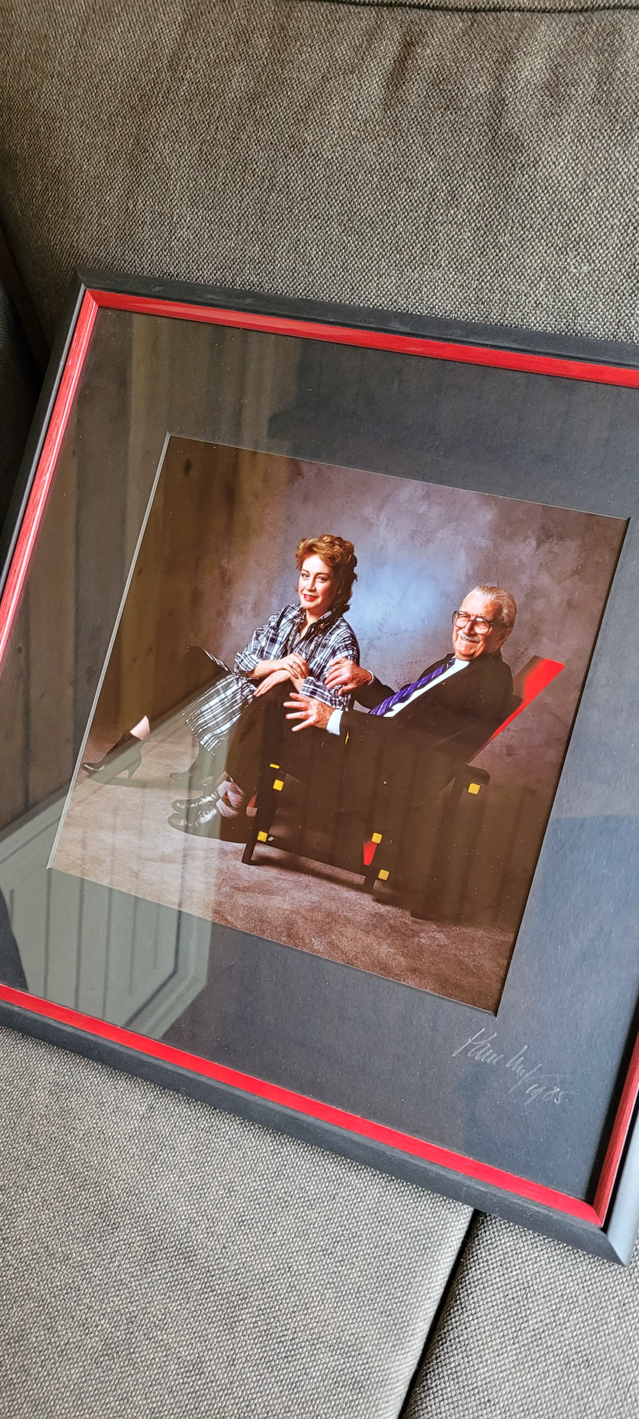 Mooie portretfoto van Viola Holt en haar vader op een Rietveldstoel. Geschoten voor de Telegraaf. Foto is mooi ingelijst in een tweekleurige lijst.